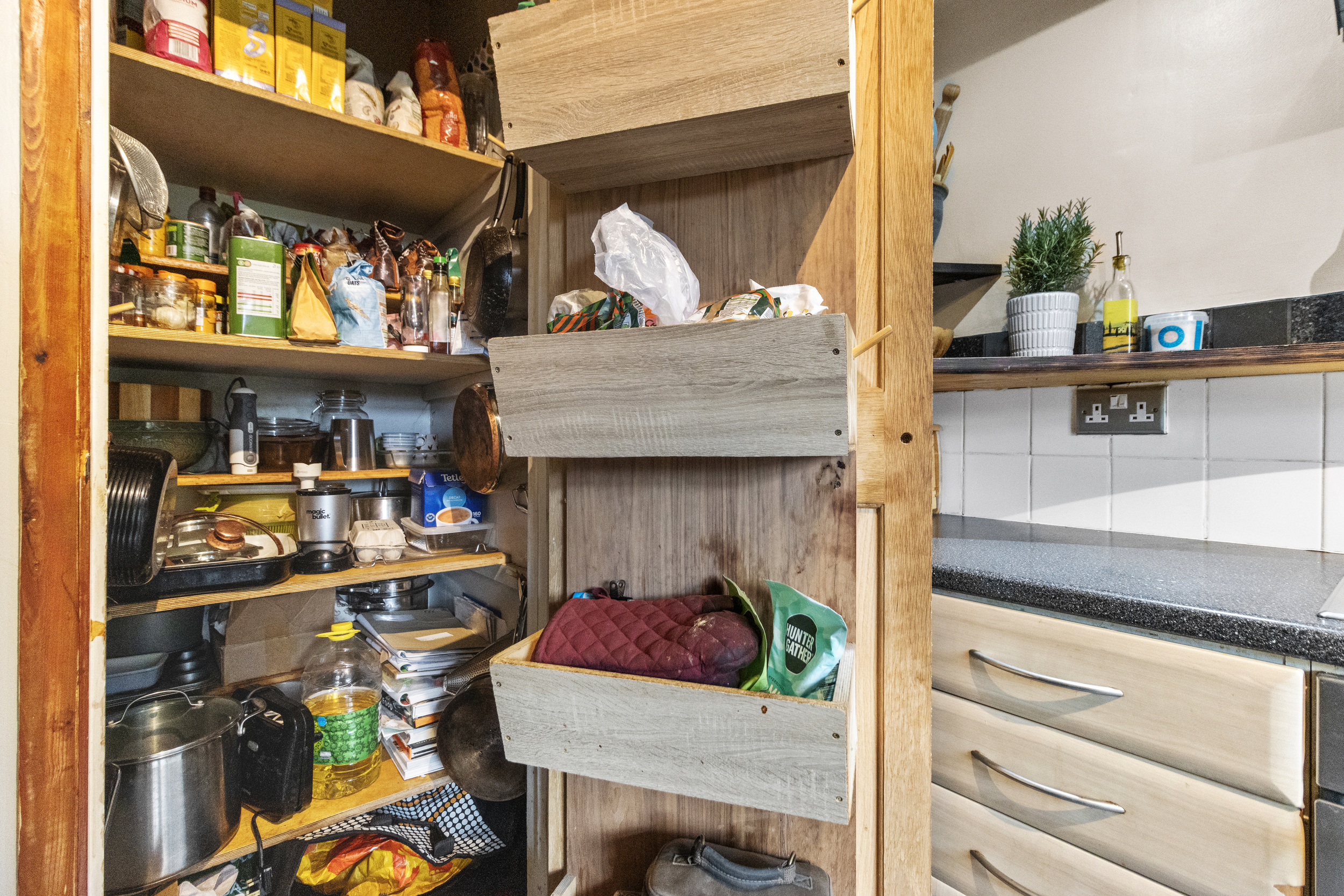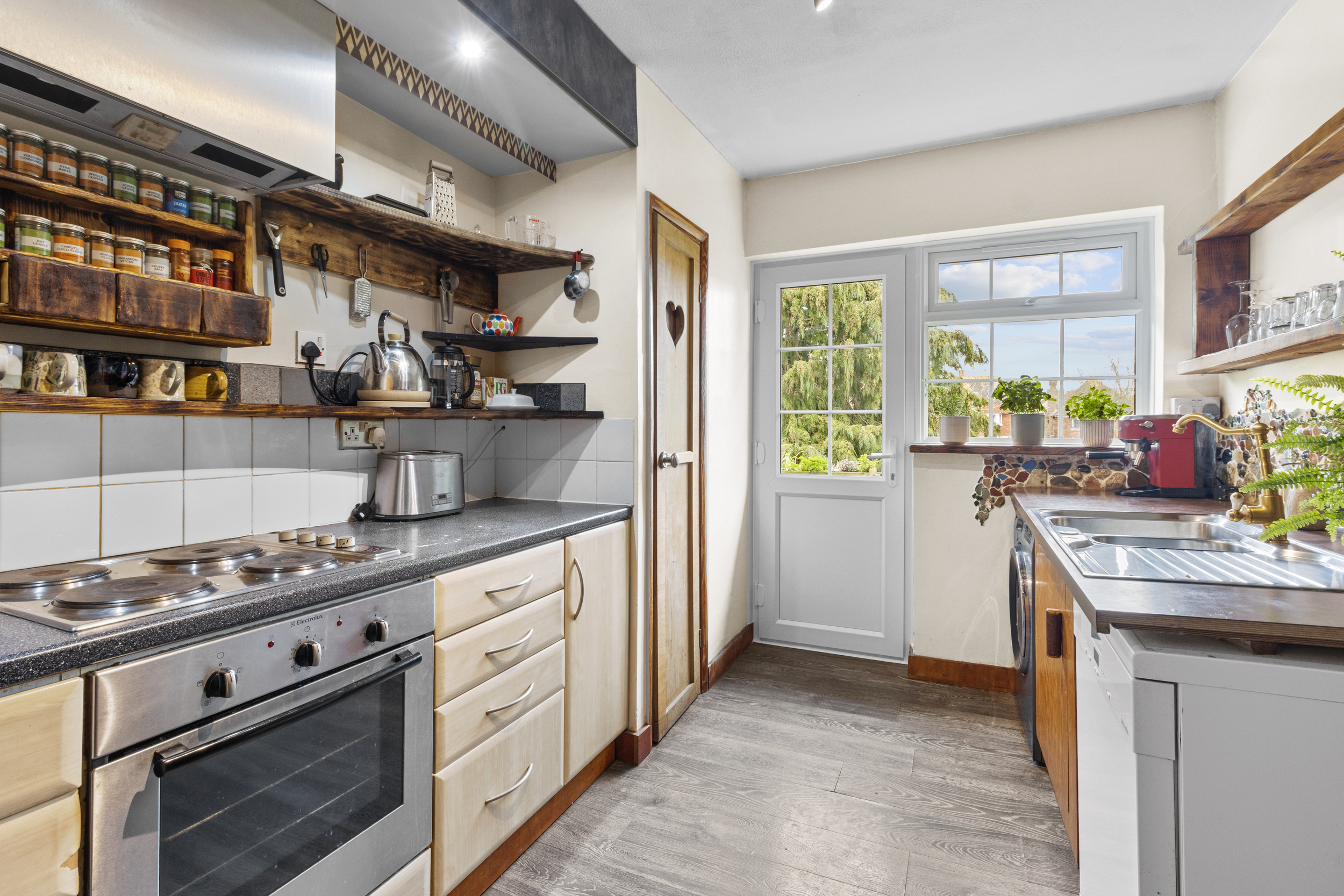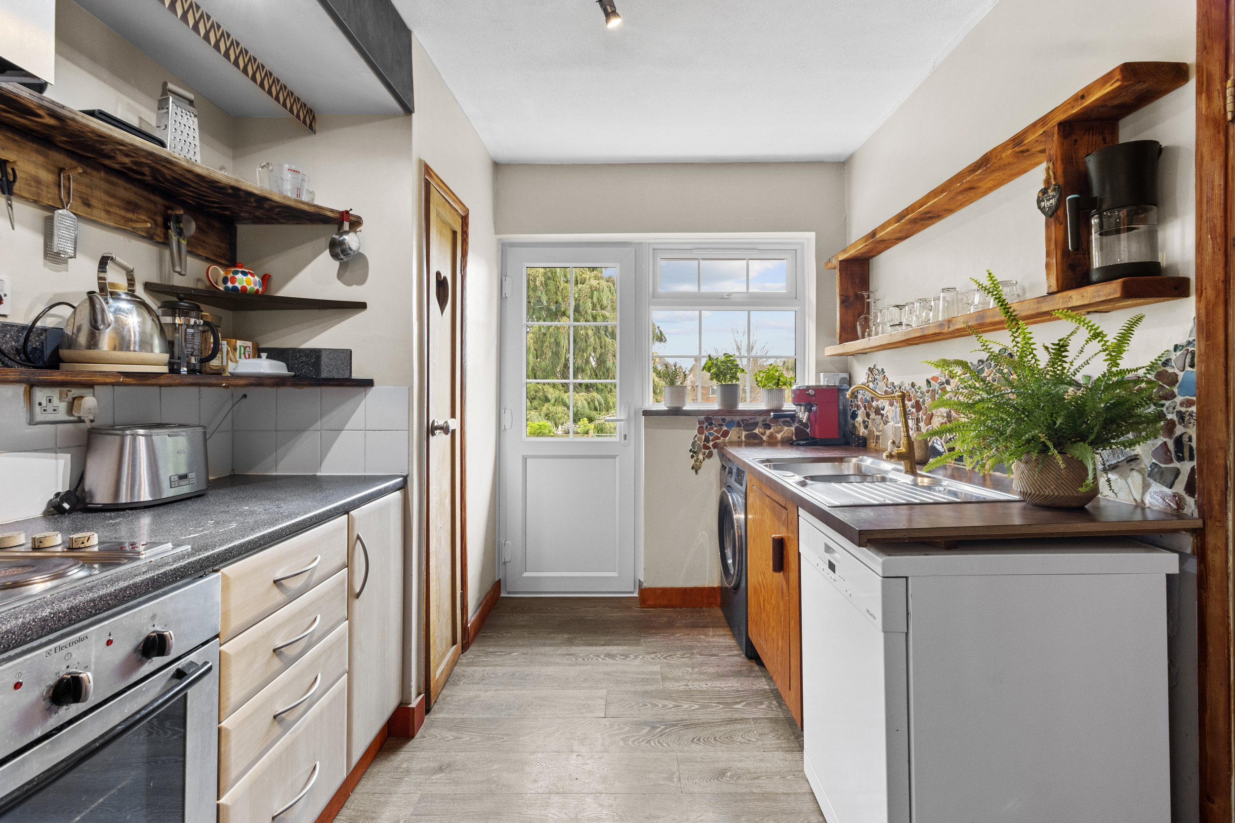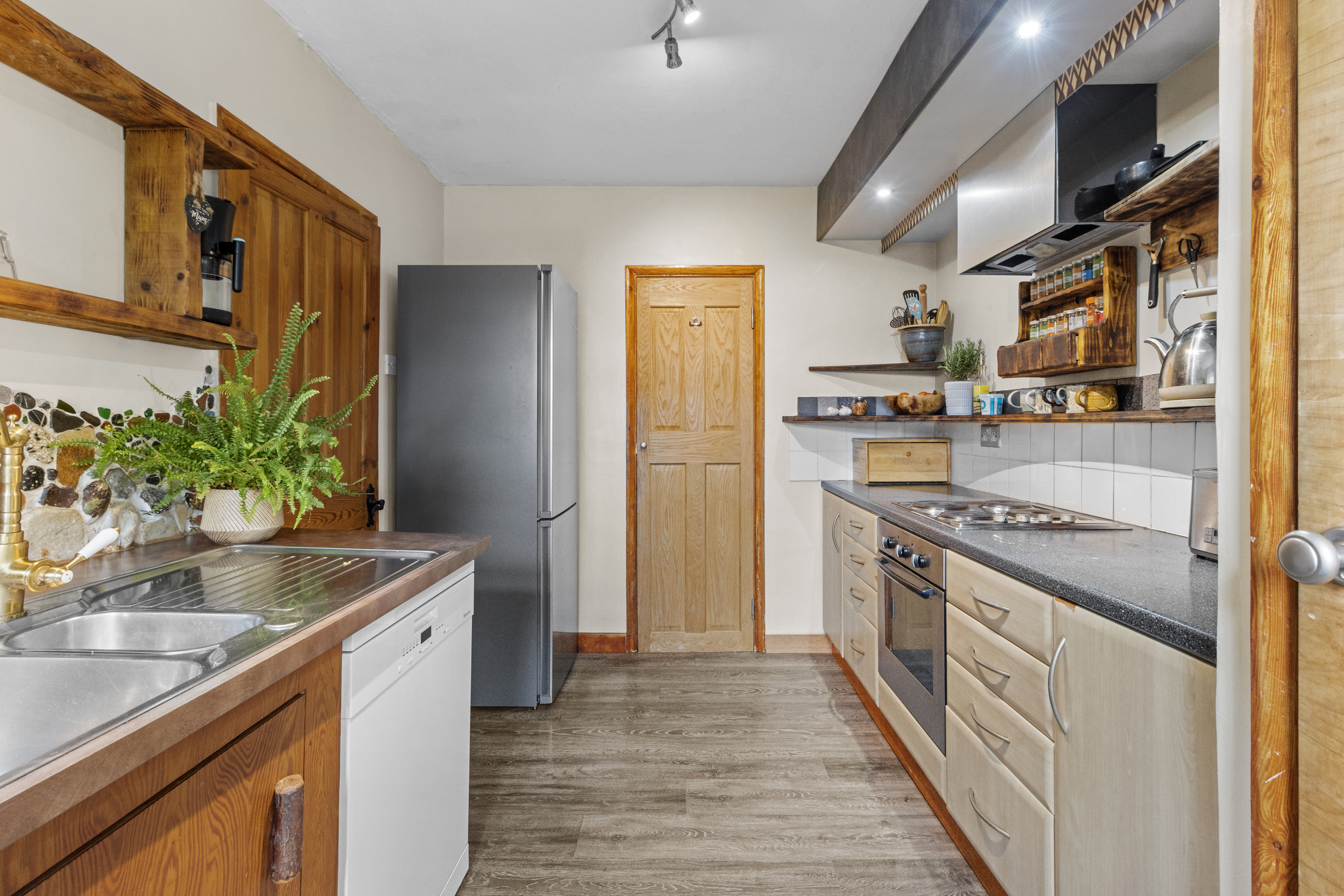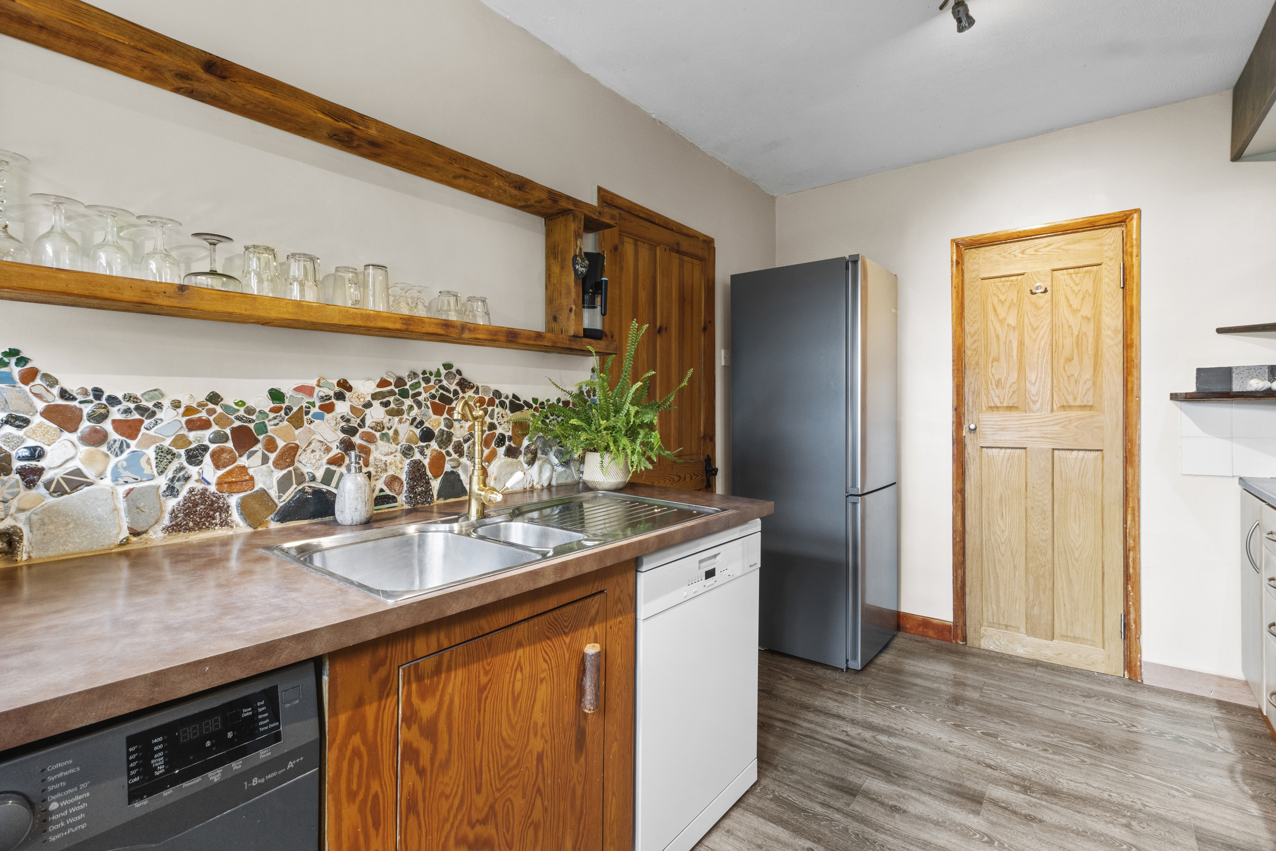 Leading from the living area, the inner hallway connects the rest of the accommodation. The kitchen is a true highlight, combining rustic charm with modern functionality. Thoughtfully designed, it features a selection of base units for ample storage, complemented by open shelving that enhances its character. The built-in oven and hob provide practicality, while dedicated spaces for a fridge-freezer and washing machine ensure everyday convenience. A large pantry cupboard offers additional storage, making organization effortless.