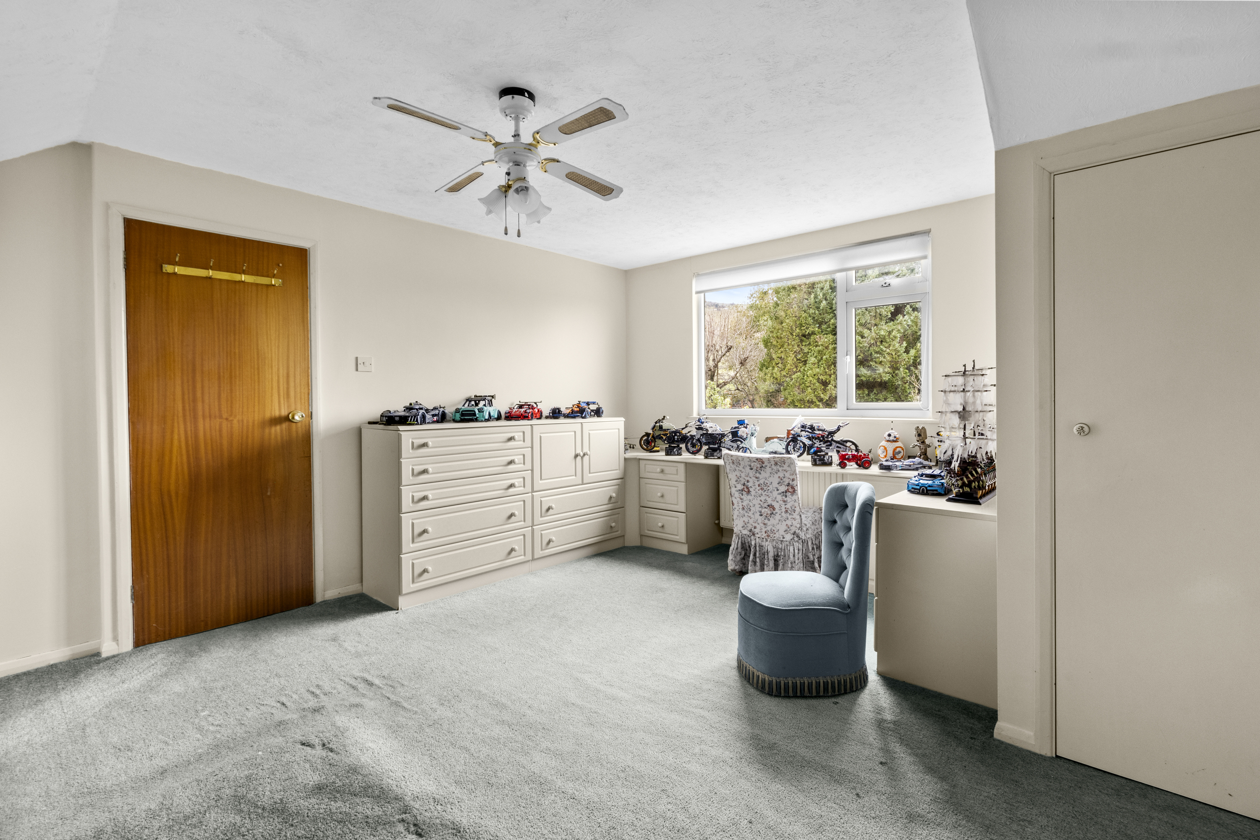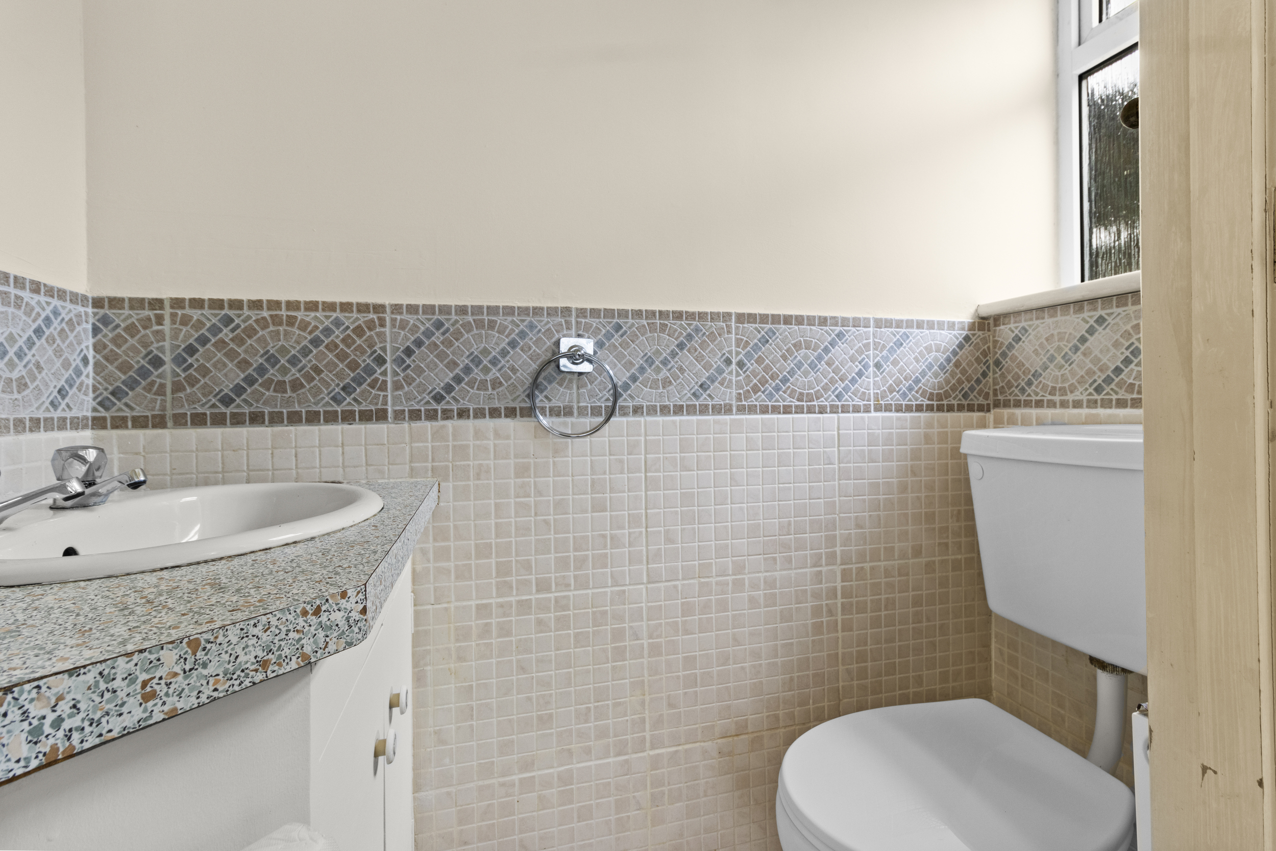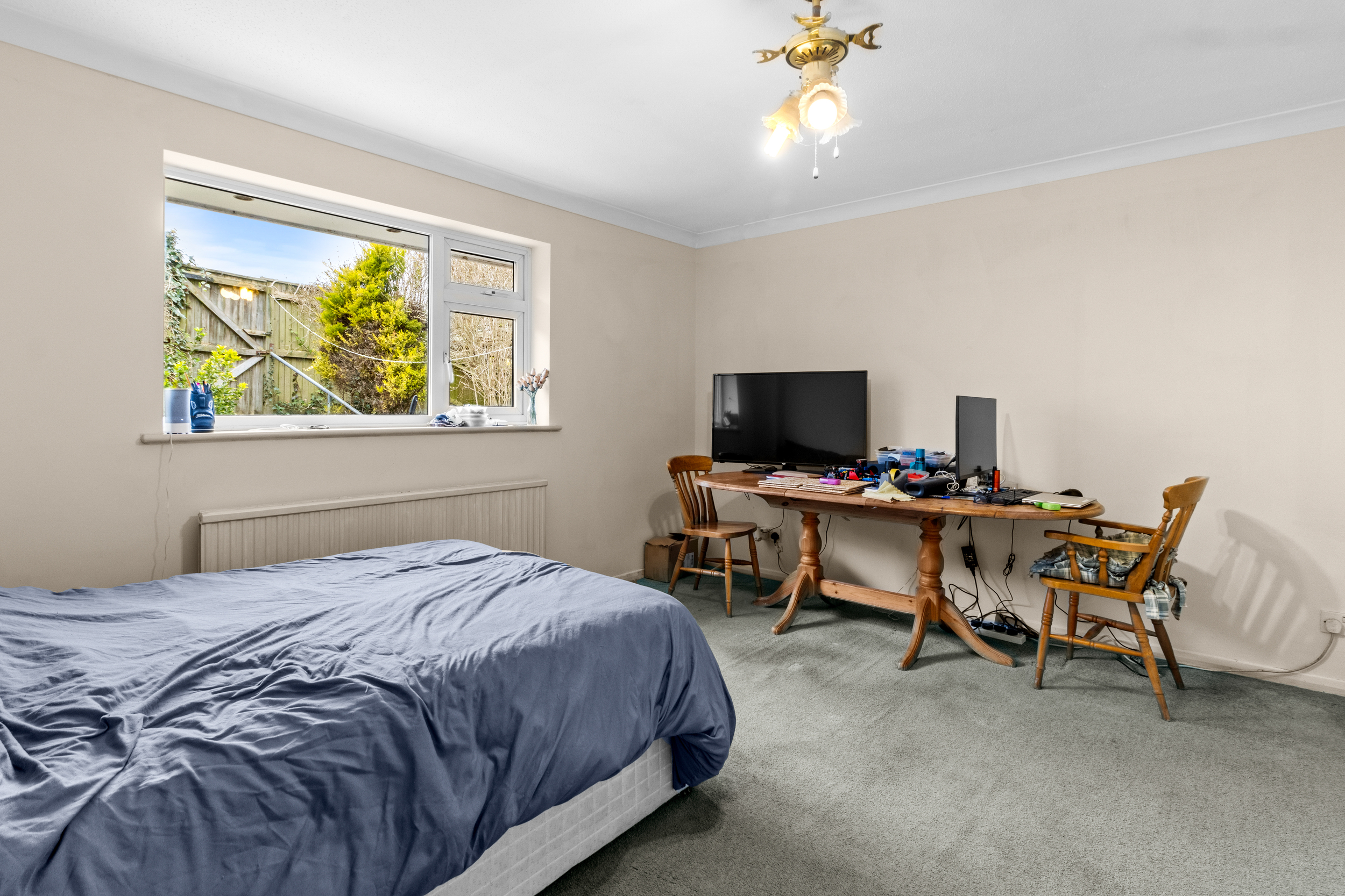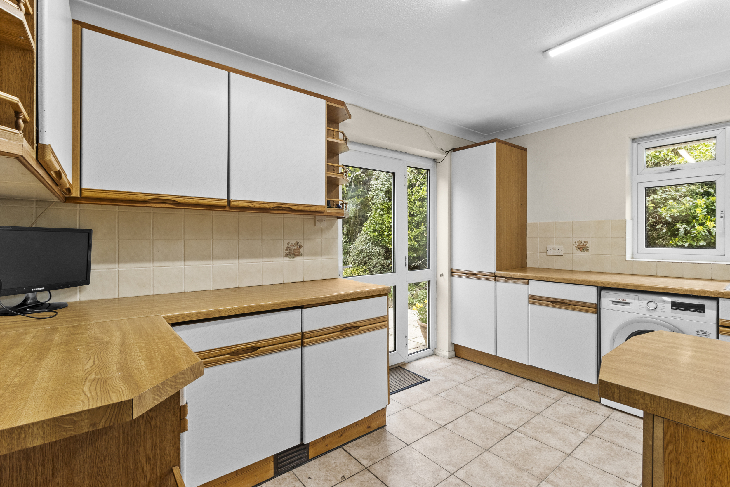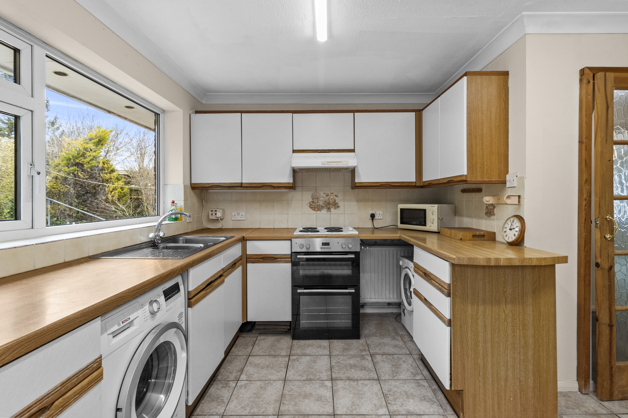 Adjacent to the living room, the L-shaped kitchen provides a functional layout with ample storage and workspace. While currently clean and well-maintained, the kitchen presents an excellent opportunity for modernisation, allowing the new owners to design a culinary space tailored to their tastes and requirements.