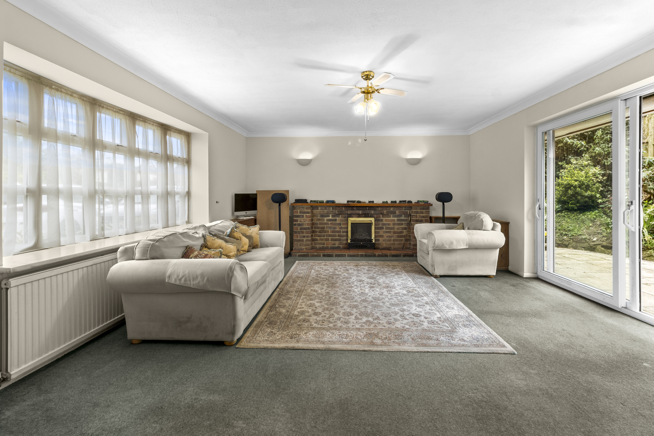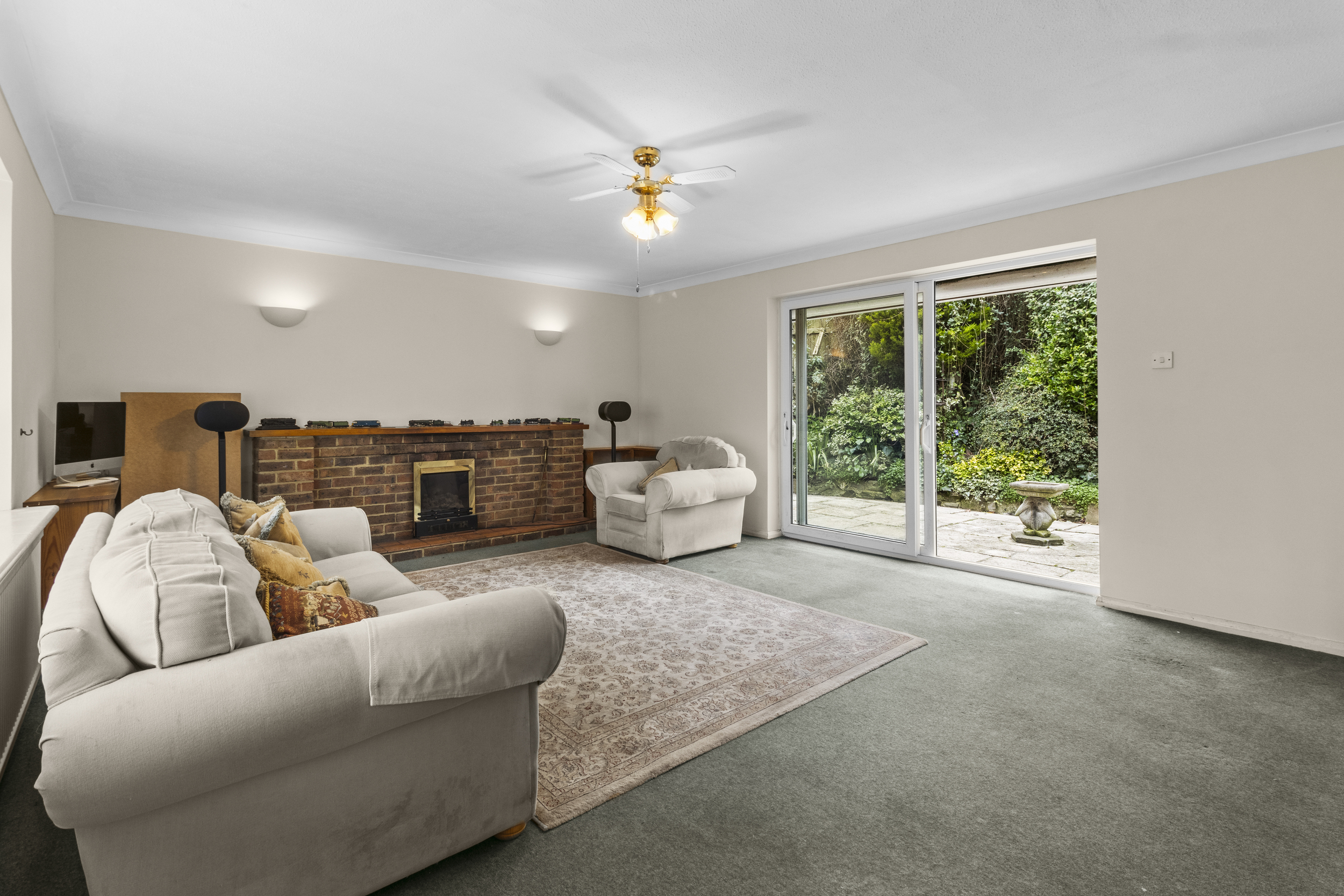 A set of elegant double doors open into the impressively spacious living room, which benefits from a charming feature fireplace with an ornate surround. The room enjoys a double aspect, allowing for an abundance of natural light to stream through a front-facing window and rear sliding patio doors that lead directly to the garden. This seamless indoor-outdoor connection enhances the sense of space and provides a perfect setting for entertaining or simply relaxing.