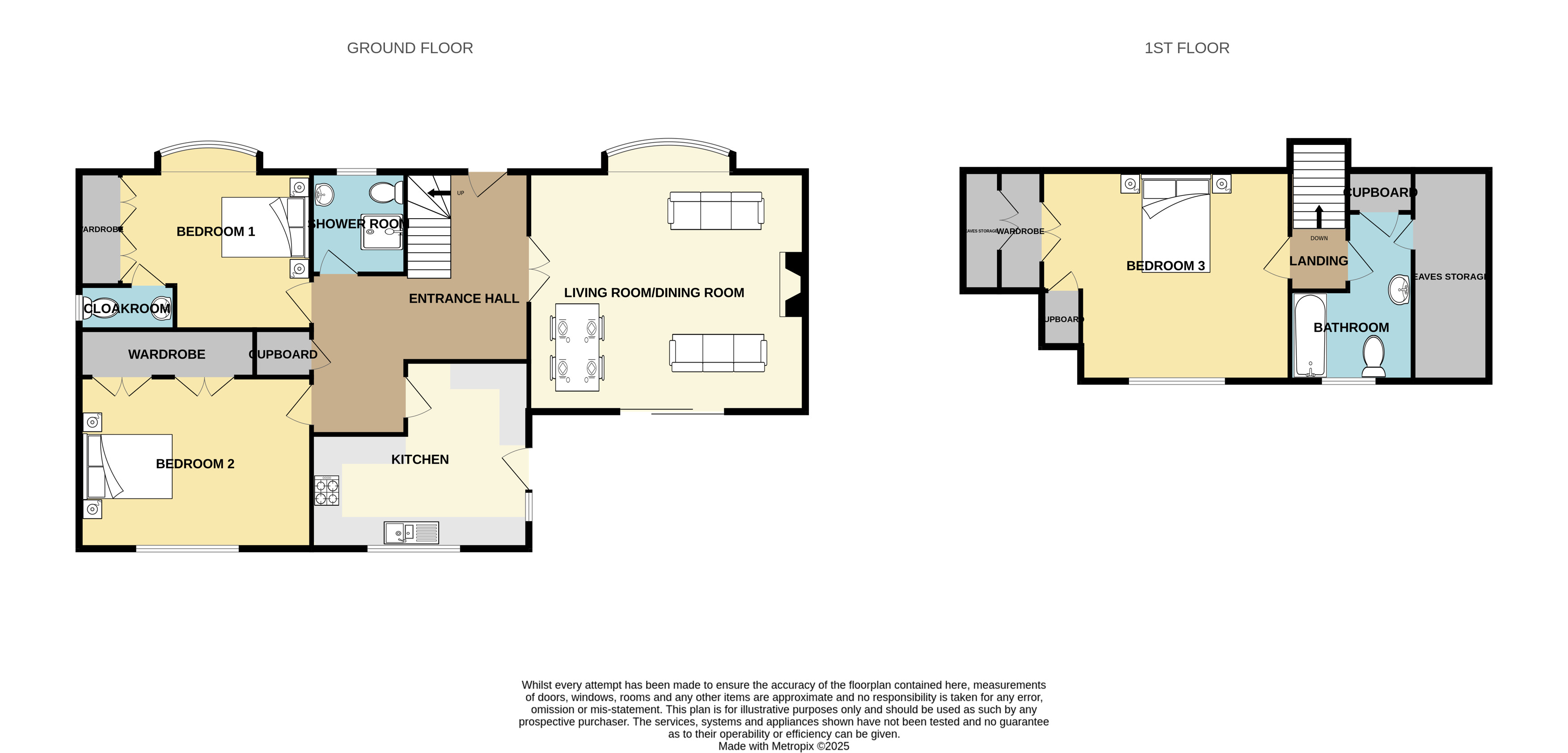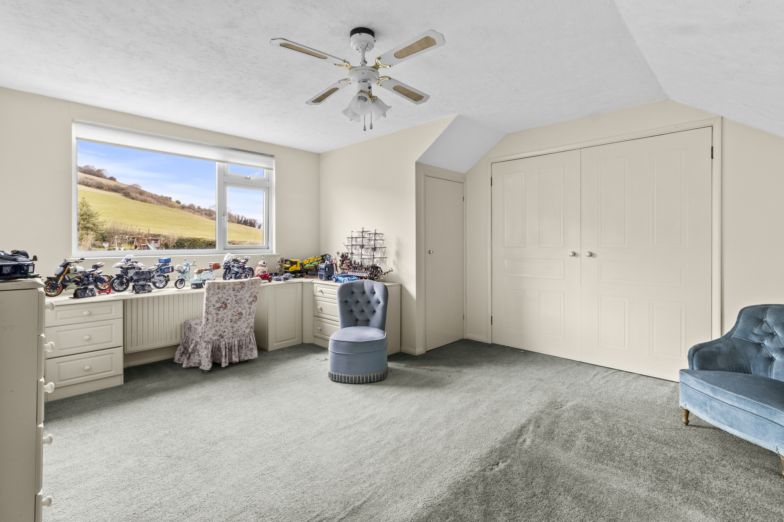 The first floor is home to an additional generously sized bedroom, featuring built-in wardrobes and access to eaves storage, and an additional separate bathroom.