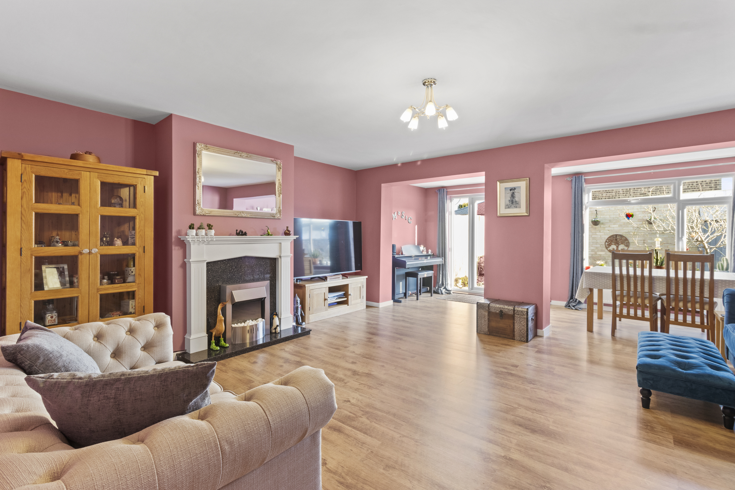 As you step inside, you are welcomed into a bright and airy entrance hall, providing access to all ground-floor accommodation and the staircase leading to the first floor. The heart of the home is the beautifully extended living room, which enjoys an abundance of natural light. This versatile space features a characterful fireplace with an elegant surround, a built-in storage cupboard, and ample room for both seating and dining areas. The rear extension has further enhanced this space, creating a seamless flow into the dining area, which overlooks and provides direct access to the rear garden through patio doors—perfect for entertaining or enjoying family meals with a view.