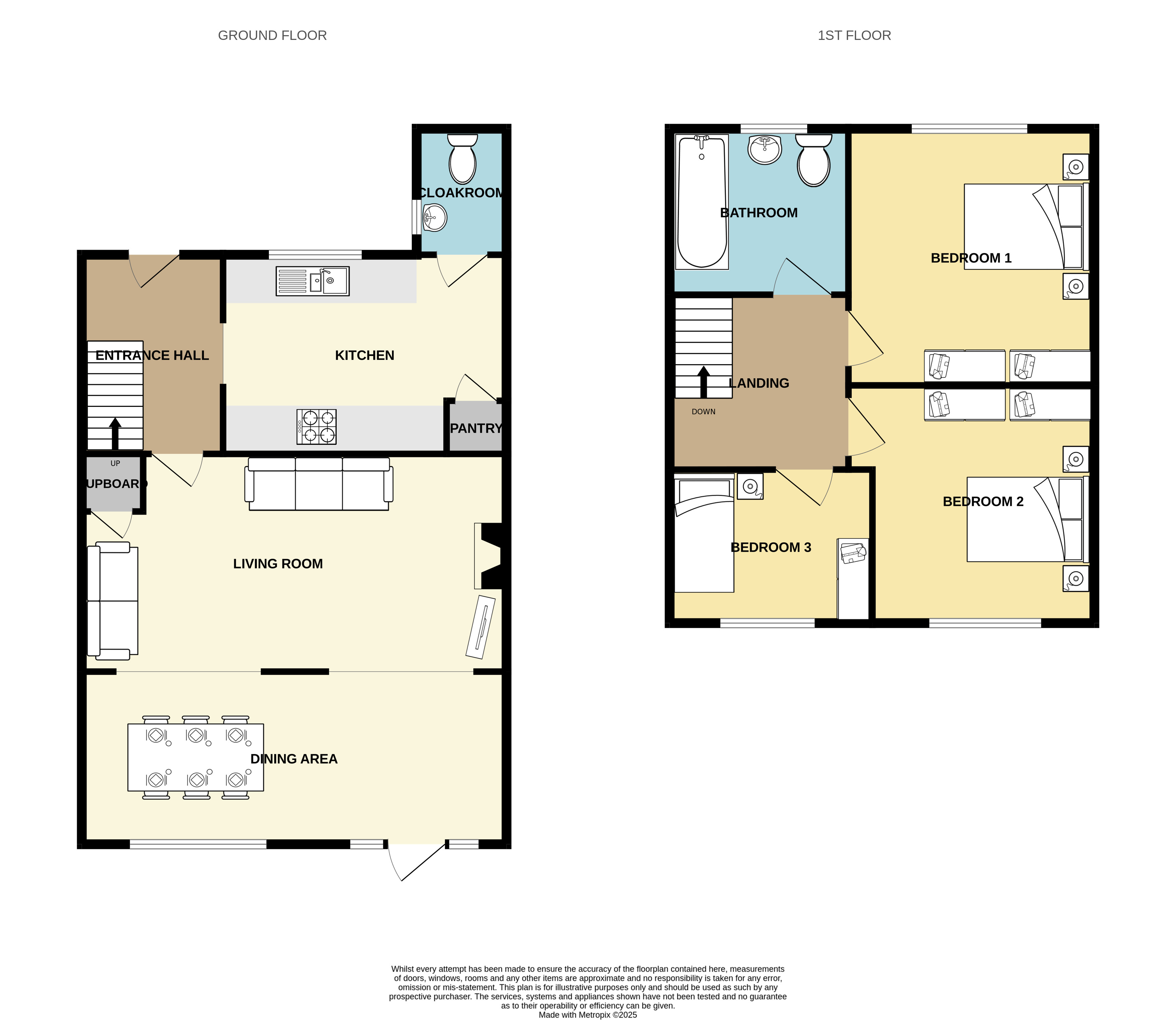 The modern fitted kitchen is thoughtfully designed, offering a range of wall and base units that provide ample storage, complemented by sleek work surfaces. Fully equipped with integrated appliances, including a dishwasher, washer/dryer, fridge, freezer, oven, and hob with an extractor hood, the kitchen is both practical and stylish. A pantry cupboard further enhances the functionality of this space, ensuring a clutter-free cooking environment. Completing the ground floor is a well-appointed cloakroom.