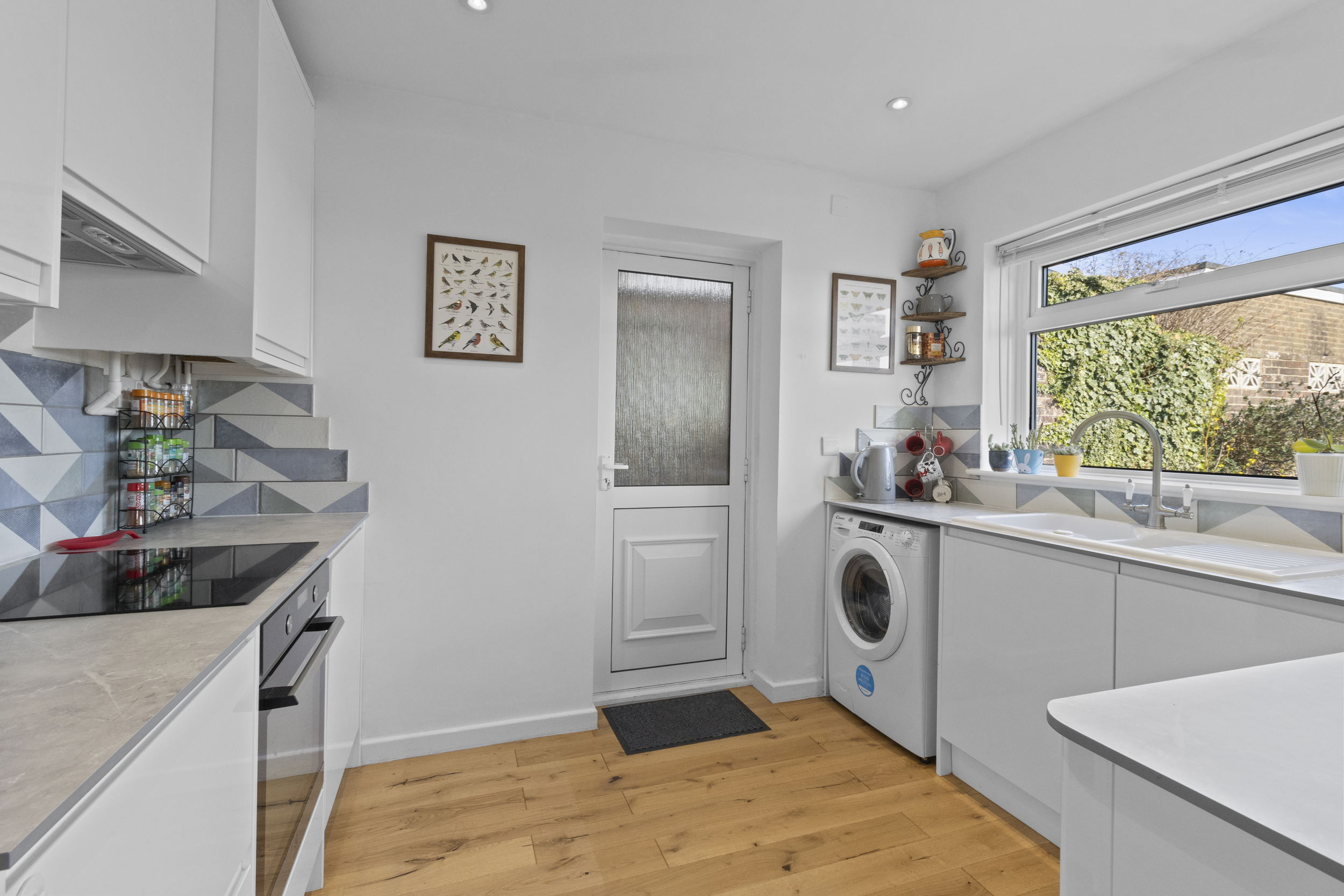 The kitchen is well-appointed with a stylish range of wall-mounted and matching base units, providing plenty of storage and workspace. Designed for both functionality and aesthetics, the kitchen is fitted with a built-in oven, hob with extractor hood, and a dishwasher. There is additional space for a freestanding washing machine and fridge freezer. A double-glazed window to the front enhances the sense of space and brightness, while a convenient side door leads to an undercover passageway that provides access to both the front and rear gardens.