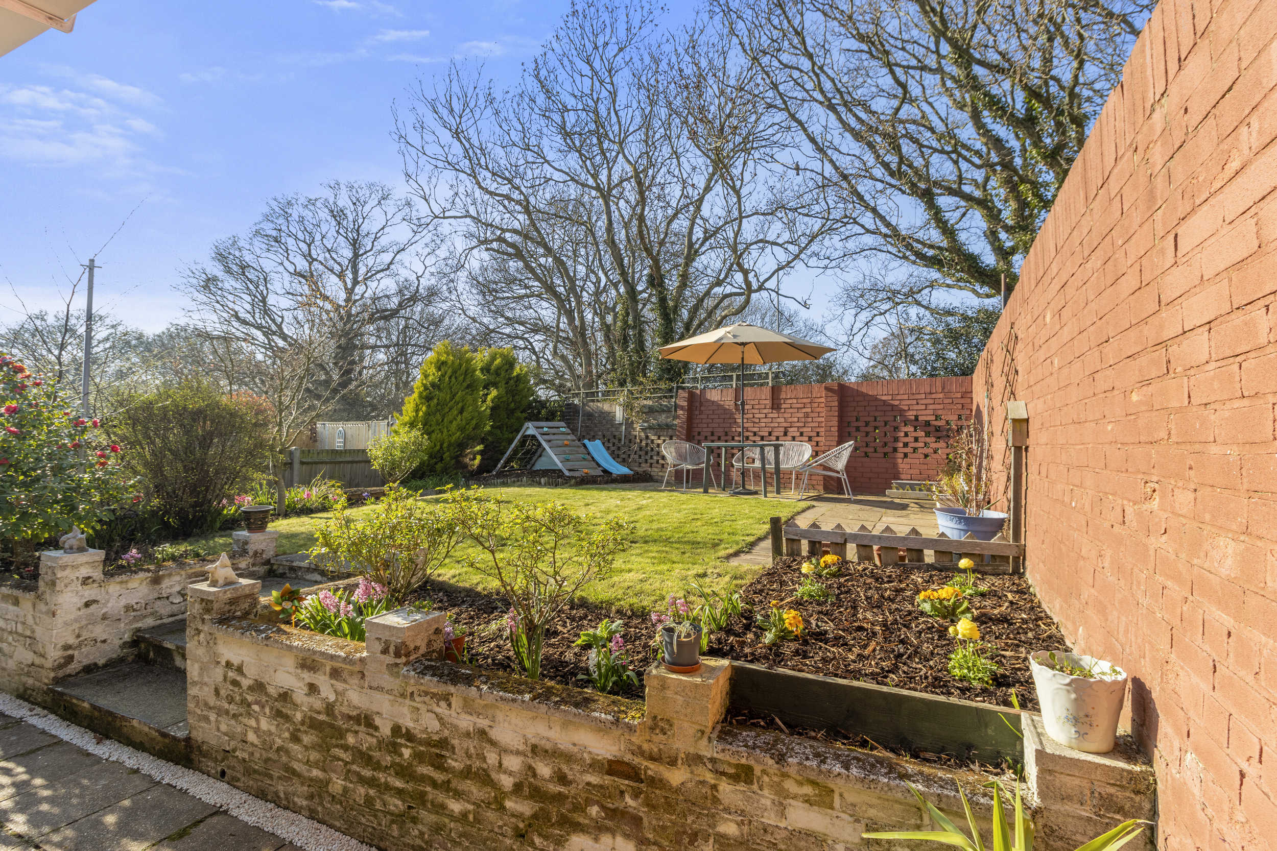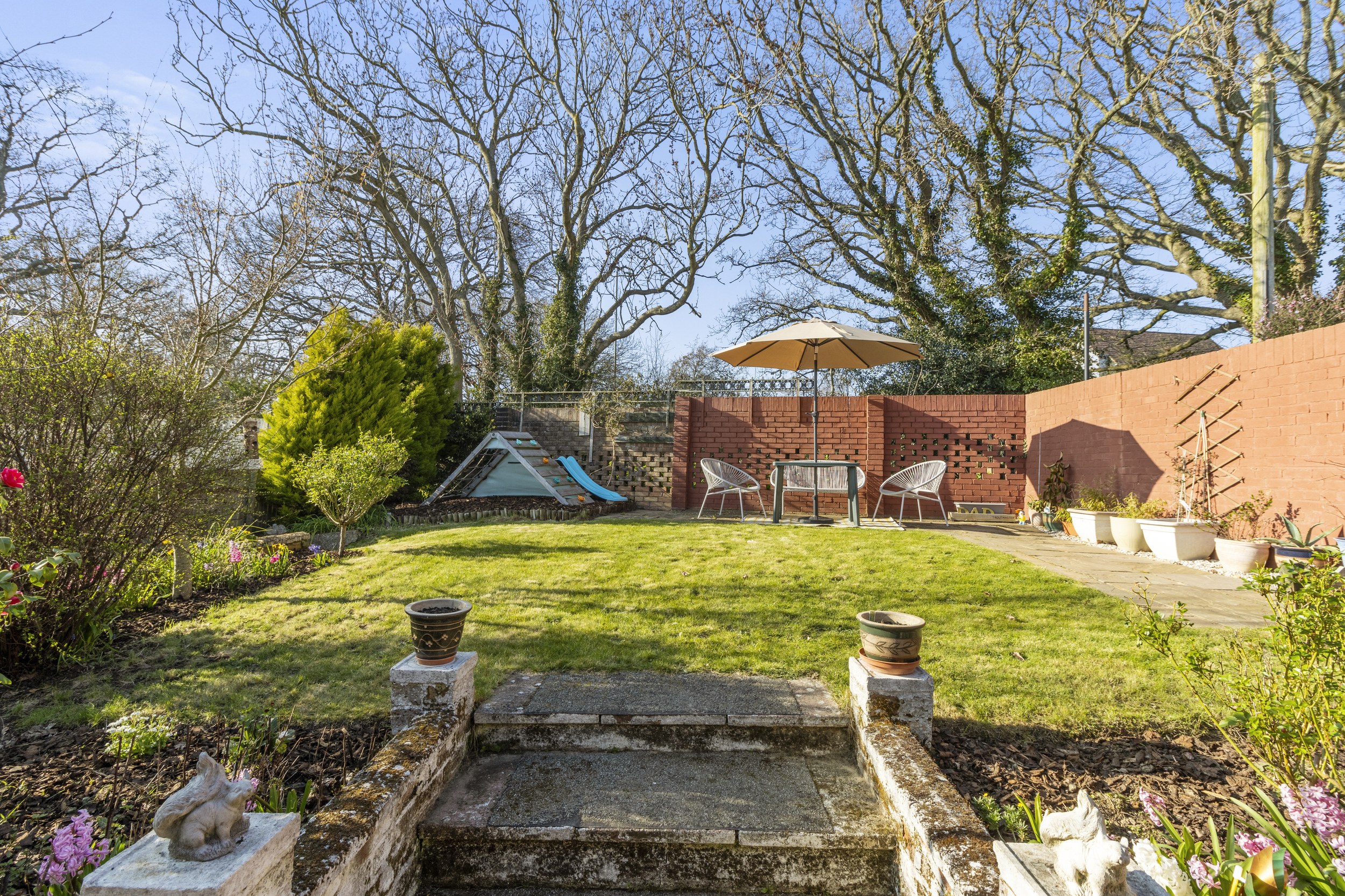The sunny rear garden is fully enclosed, creating a private oasis perfect for outdoor enjoyment. A central lawn is surrounded by mature plants and shrubs, adding to the charm and greenery of the space. Towards the rear of the garden, a paved patio area provides the perfect spot for alfresco dining, entertaining, or simply relaxing in the sunshine. Additionally, a dedicated play area, laid with woodchip, offers a safe and enjoyable space for children or could be adapted for alternative use, such as a garden feature or additional seating area. Side access via the alleyway enhances convenience, allowing for easy movement between the front and rear of the property.