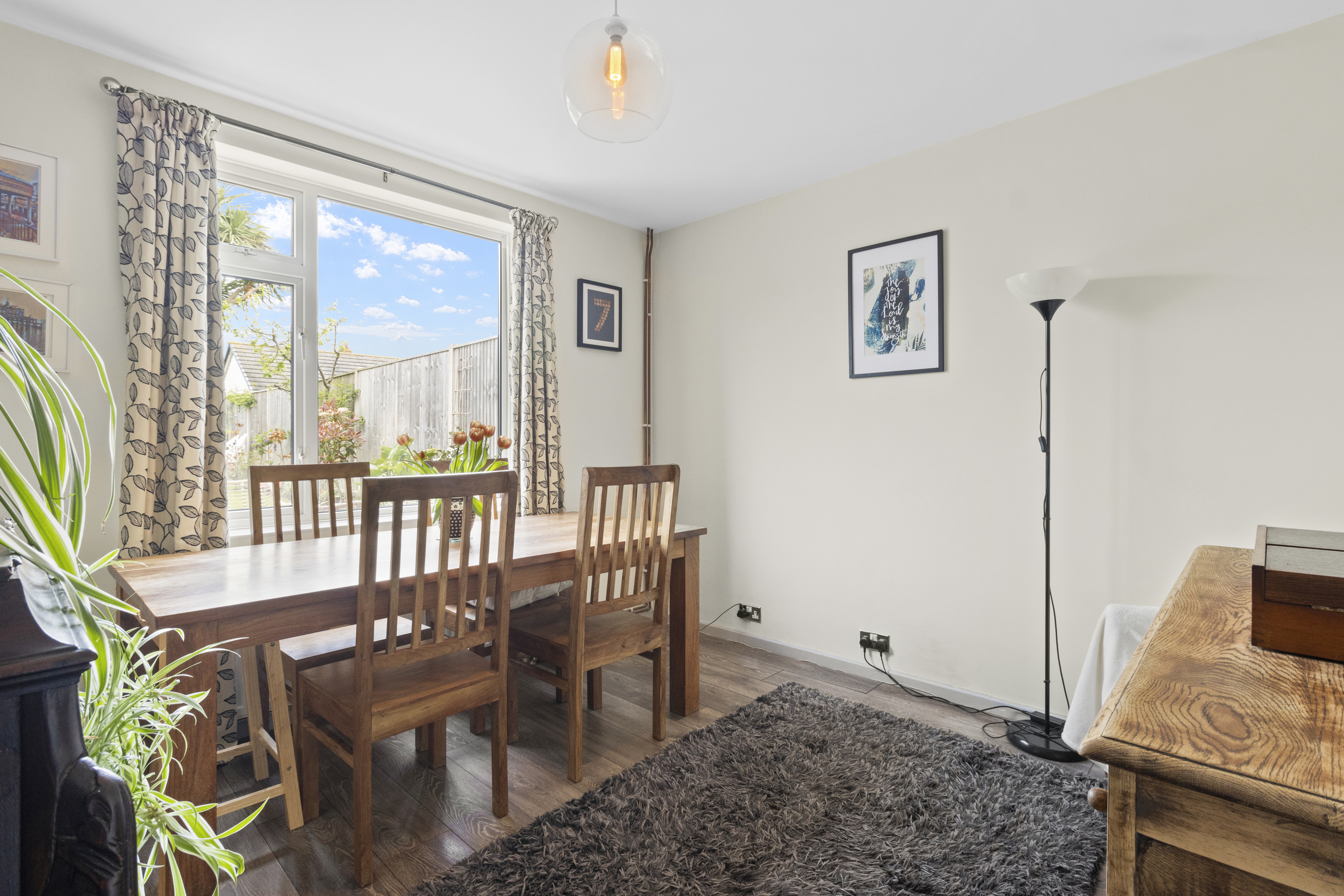 To the front of the property, the living room is a bright and comfortable space featuring a large bay window that fills the room with natural light. Adjacent to this is a separate dining room, ideal for family meals and entertaining guests, with views over the garden and potential for seamless connection to the kitchen if desired.