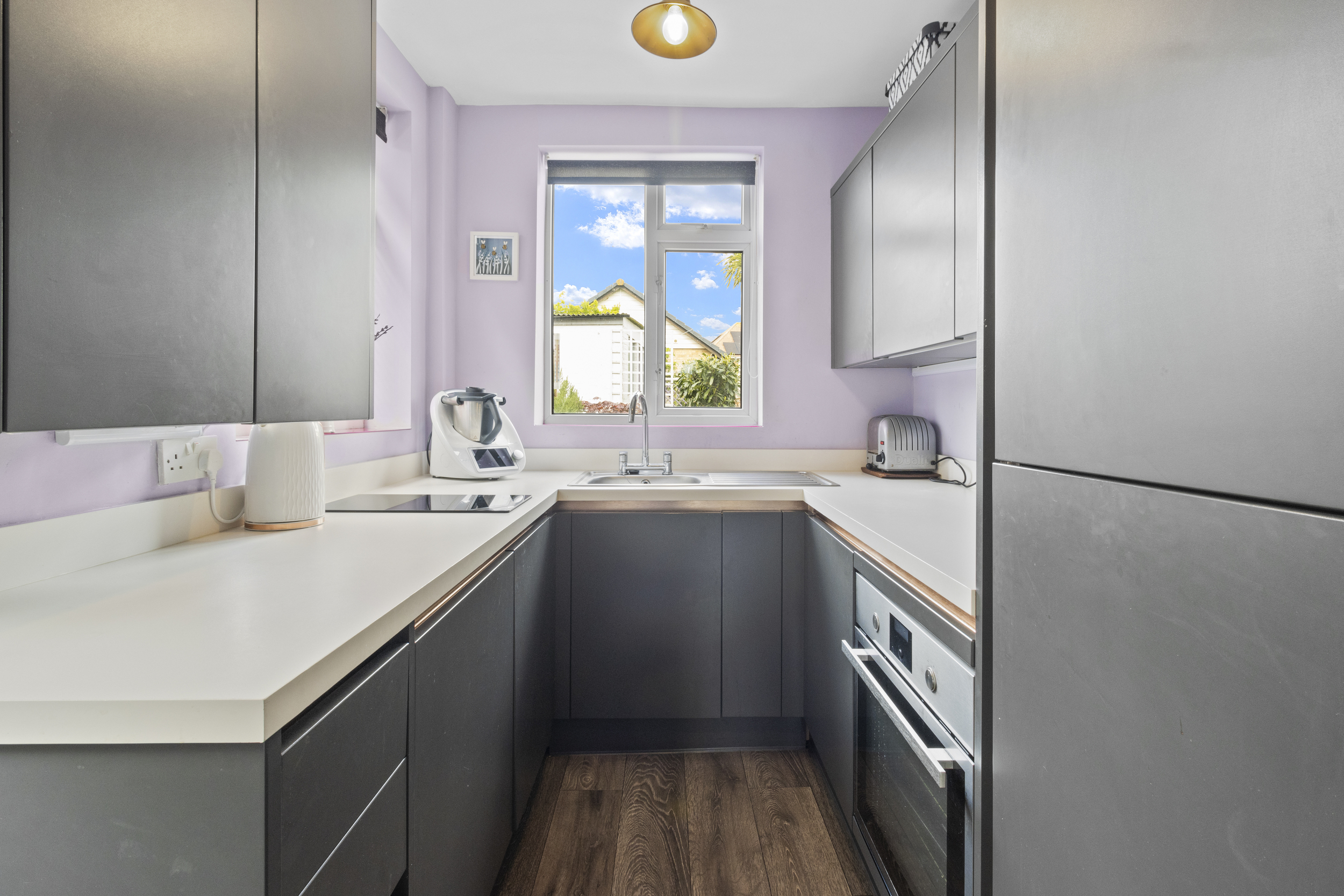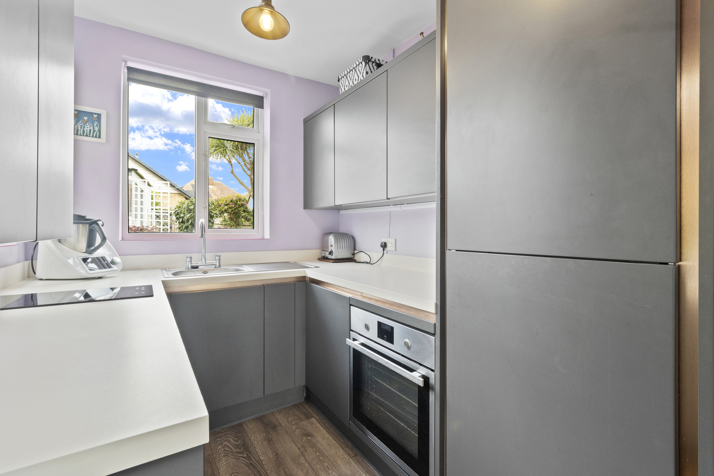 The kitchen is modern and thoughtfully designed, fitted with a range of wall-mounted and base units offering ample storage and workspace. It comes complete with a built-in oven and hob, integrated fridge and freezer, slimline dishwasher, and washing machine. There is excellent scope to knock through to the dining room, transforming the space into an open-plan kitchen/dining area that would perfectly suit contemporary living while providing direct access and views to the rear garden.