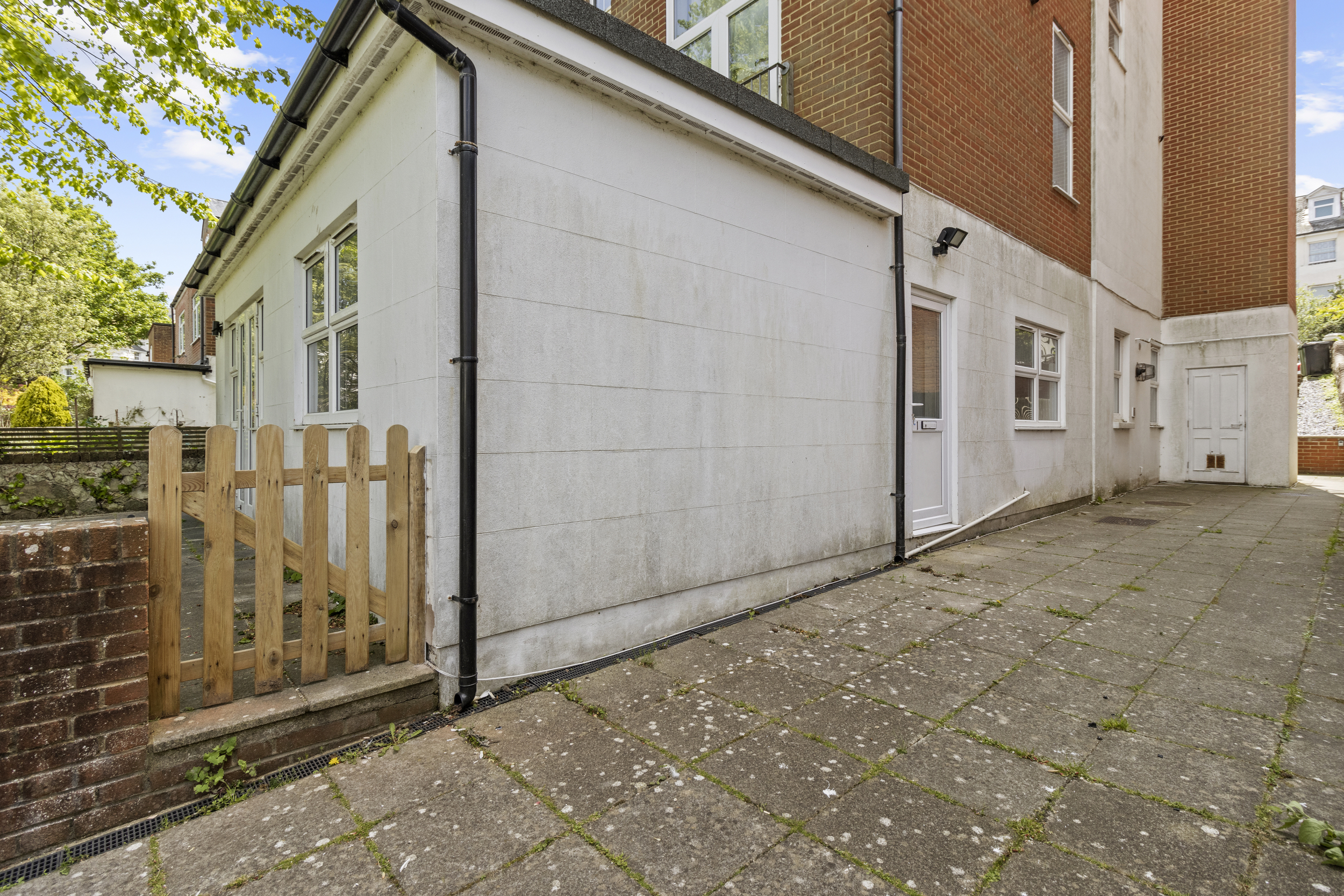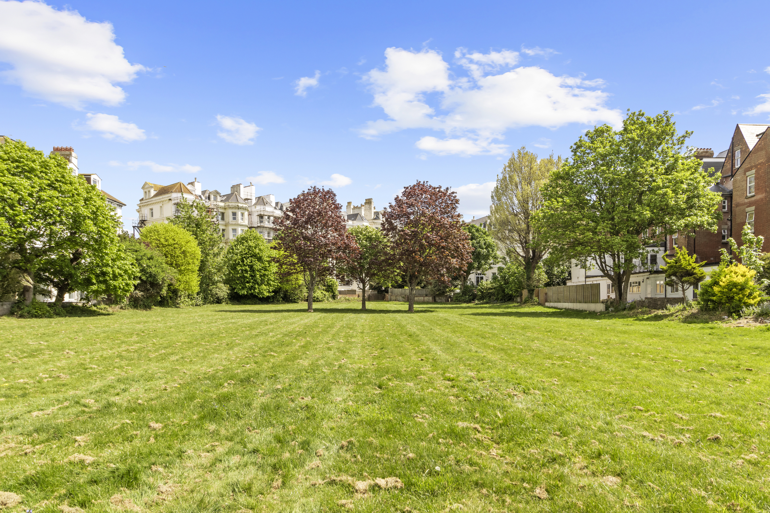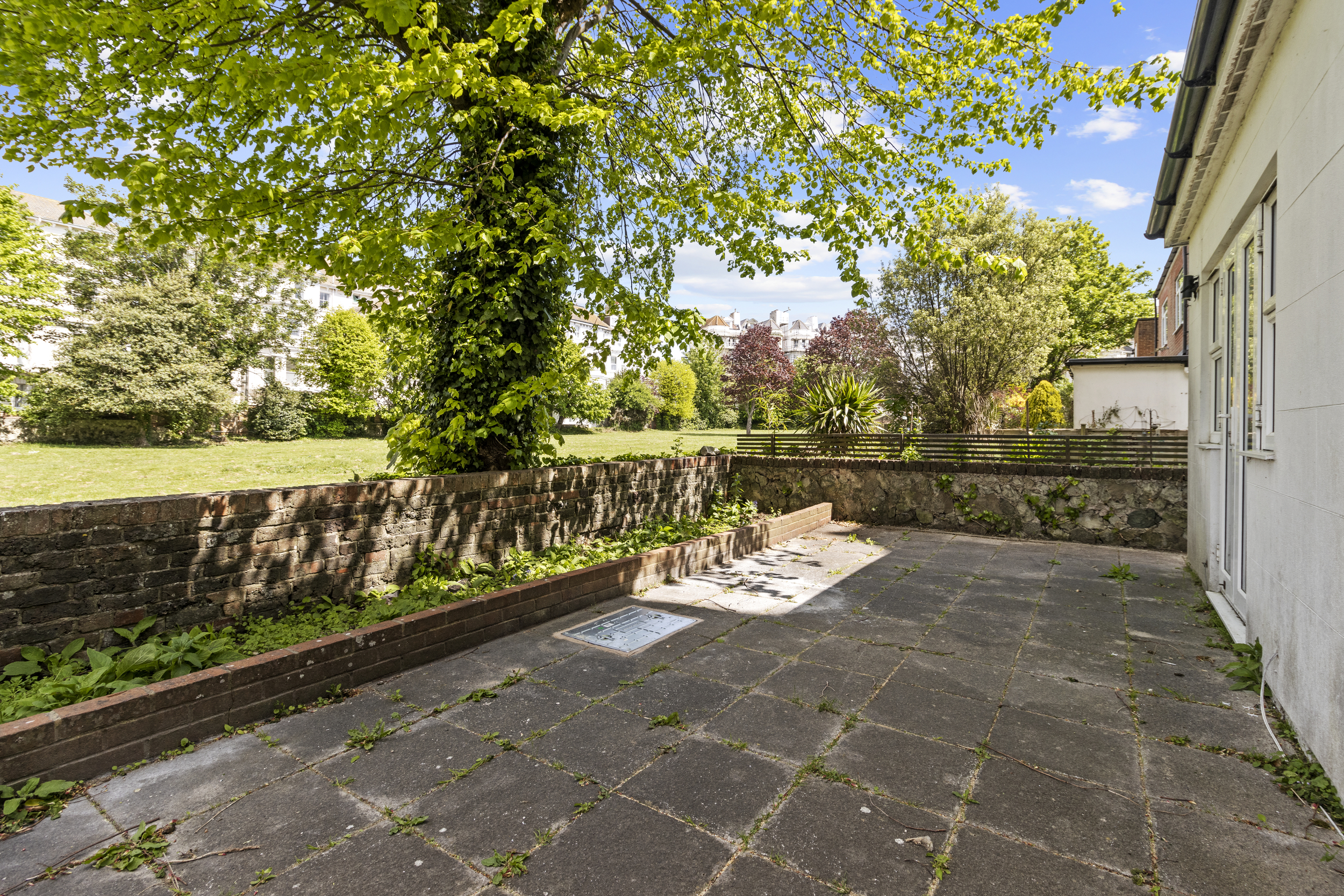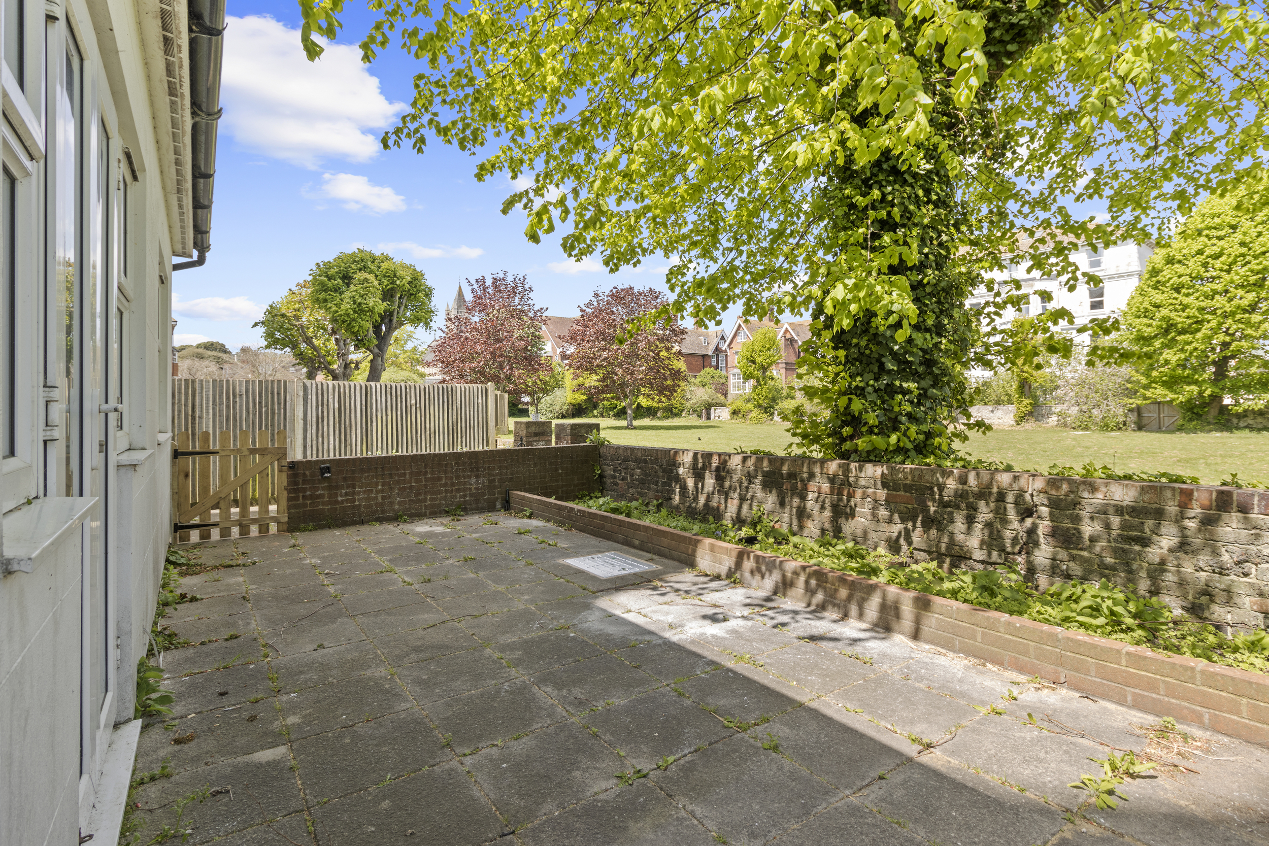 Externally, the property truly excels. The private garden, accessible from the living room or a secure side gate, is laid mainly to patio, providing a low-maintenance yet attractive outdoor space that can be enjoyed year-round. It serves as a private retreat, ideal for alfresco dining or simply relaxing with a good book. Beyond this, residents also benefit from access to expansive communal gardens to the rear, beautifully maintained and bordered by mature trees. These shared grounds offer a serene setting for picnics, socialising, or simply soaking up the sun, and contribute significantly to the peaceful and green environment that characterises this part of Eastbourne.