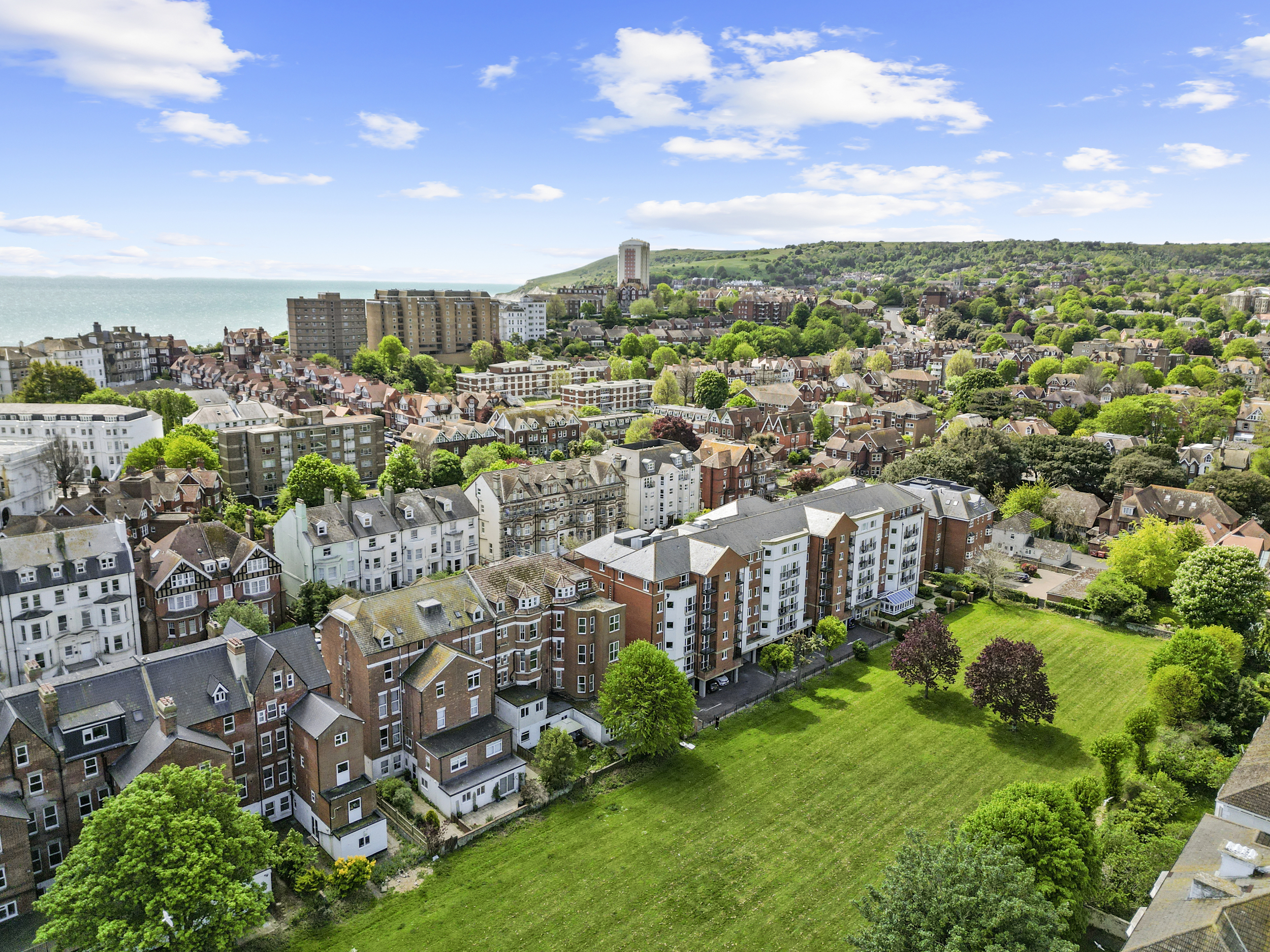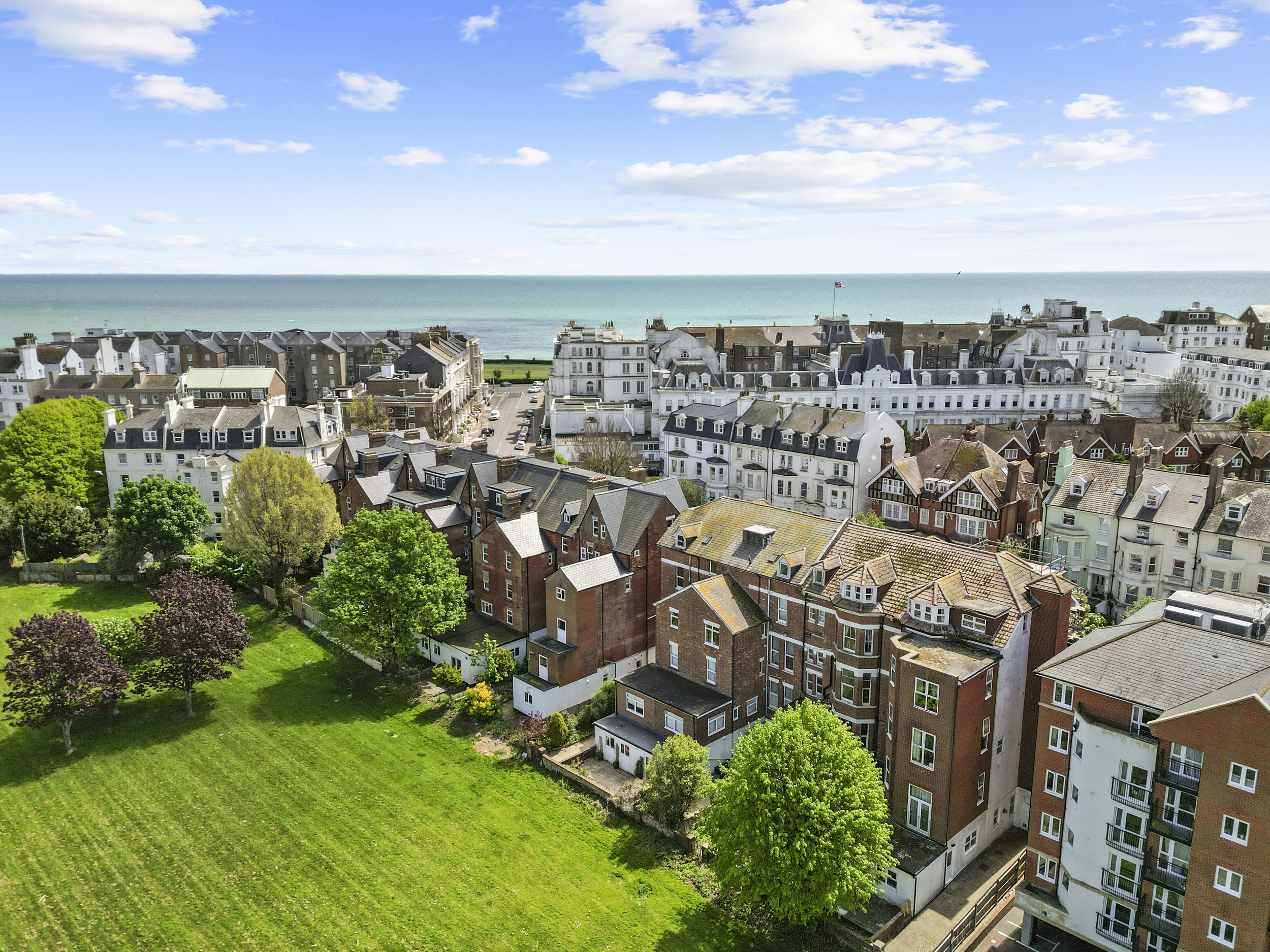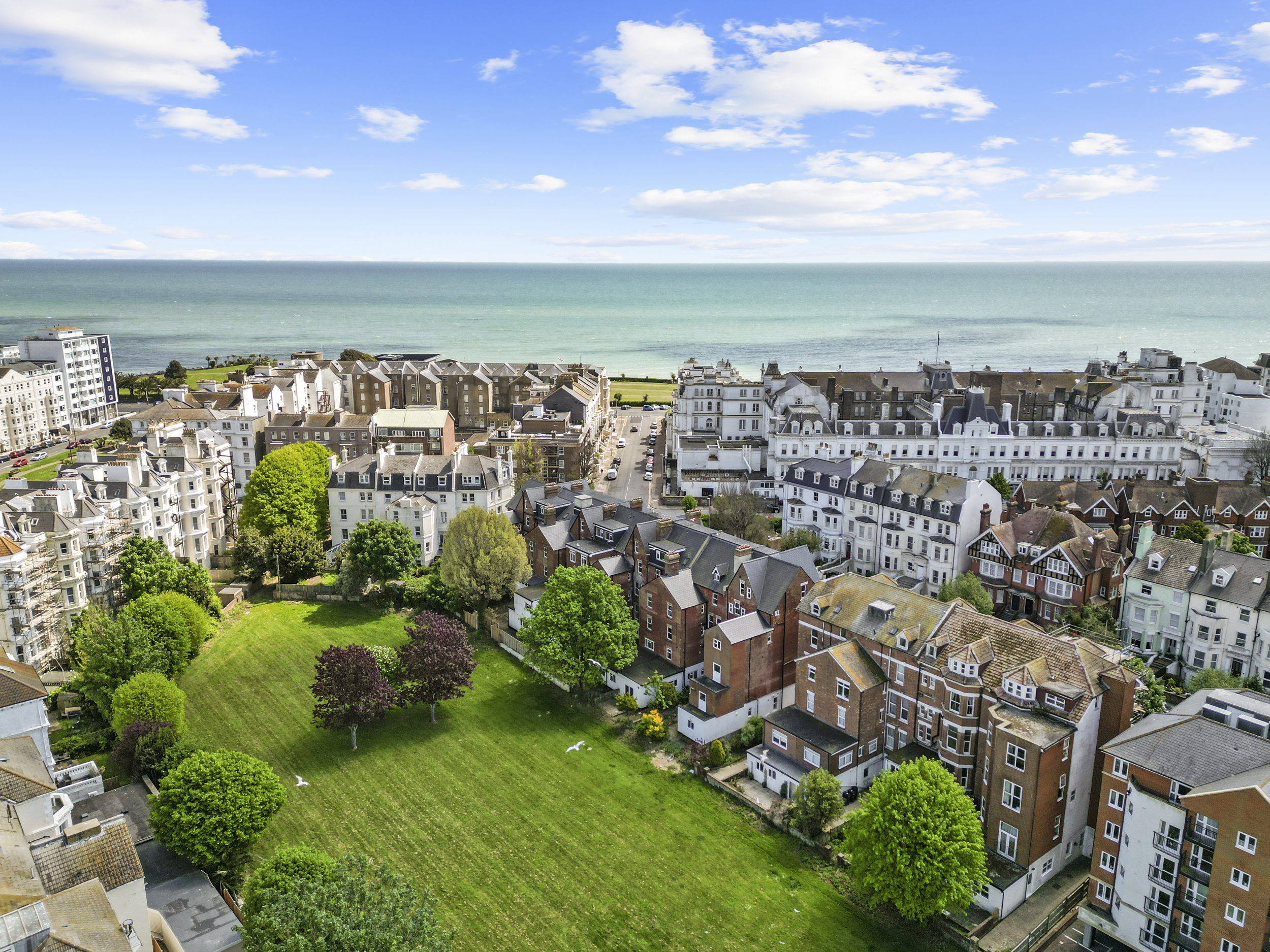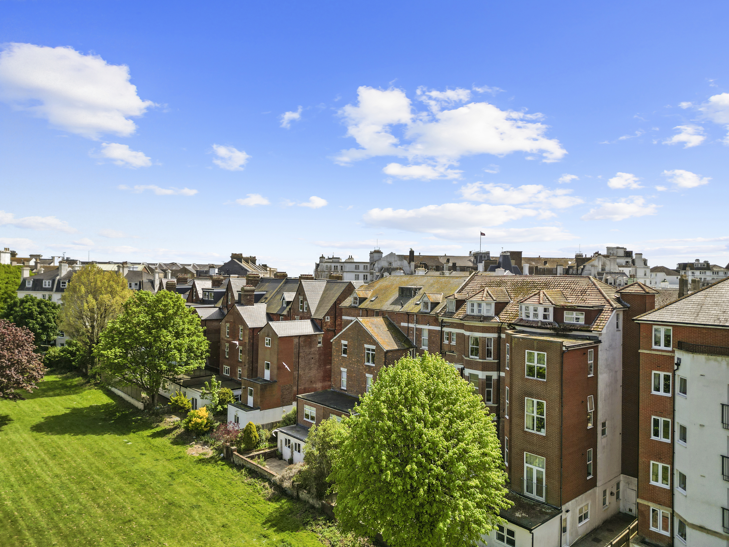 Externally, the property truly excels. The private garden, accessible from the living room or a secure side gate, is laid mainly to patio, providing a low-maintenance yet attractive outdoor space that can be enjoyed year-round. It serves as a private retreat, ideal for alfresco dining or simply relaxing with a good book. Beyond this, residents also benefit from access to expansive communal gardens to the rear, beautifully maintained and bordered by mature trees. These shared grounds offer a serene setting for picnics, socialising, or simply soaking up the sun, and contribute significantly to the peaceful and green environment that characterises this part of Eastbourne.