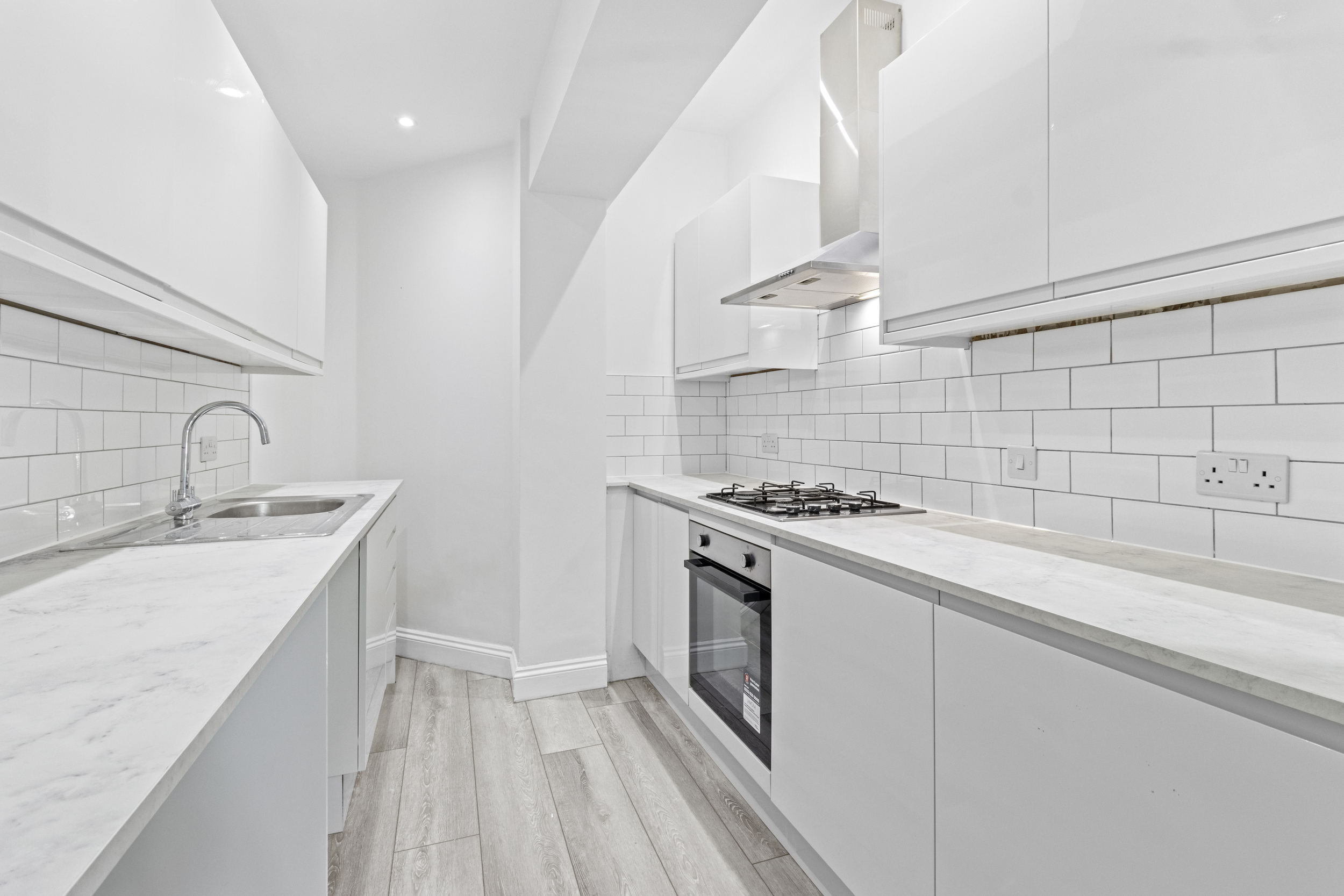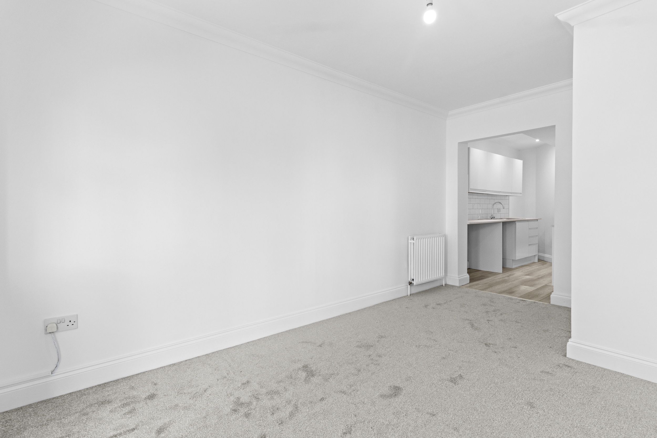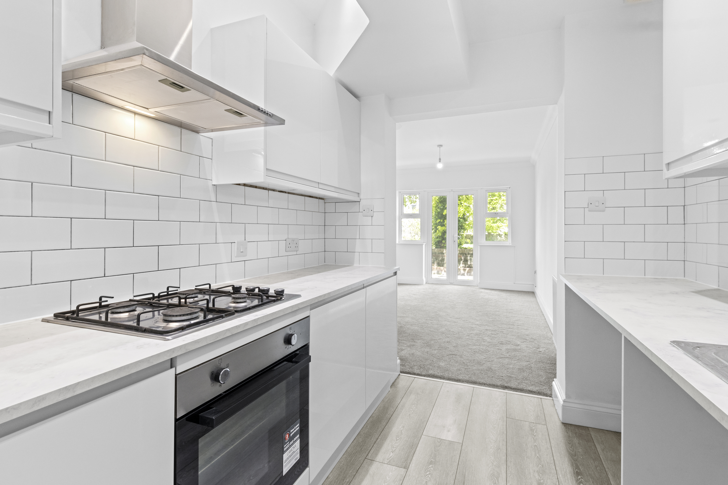 Adjoining the living space is the newly fitted kitchen, designed with contemporary tastes in mind. It features a smart range of wall-mounted and base units in a clean, modern finish, with coordinated work surfaces providing ample space for food preparation. The kitchen comes fully equipped with a built-in oven, four-ring gas hob with extractor hood, and allocated space for essential appliances including a washing machine, fridge, and freezer. Whether preparing a casual breakfast or entertaining guests, the kitchen’s layout and finish make it both functional and aesthetically pleasing.