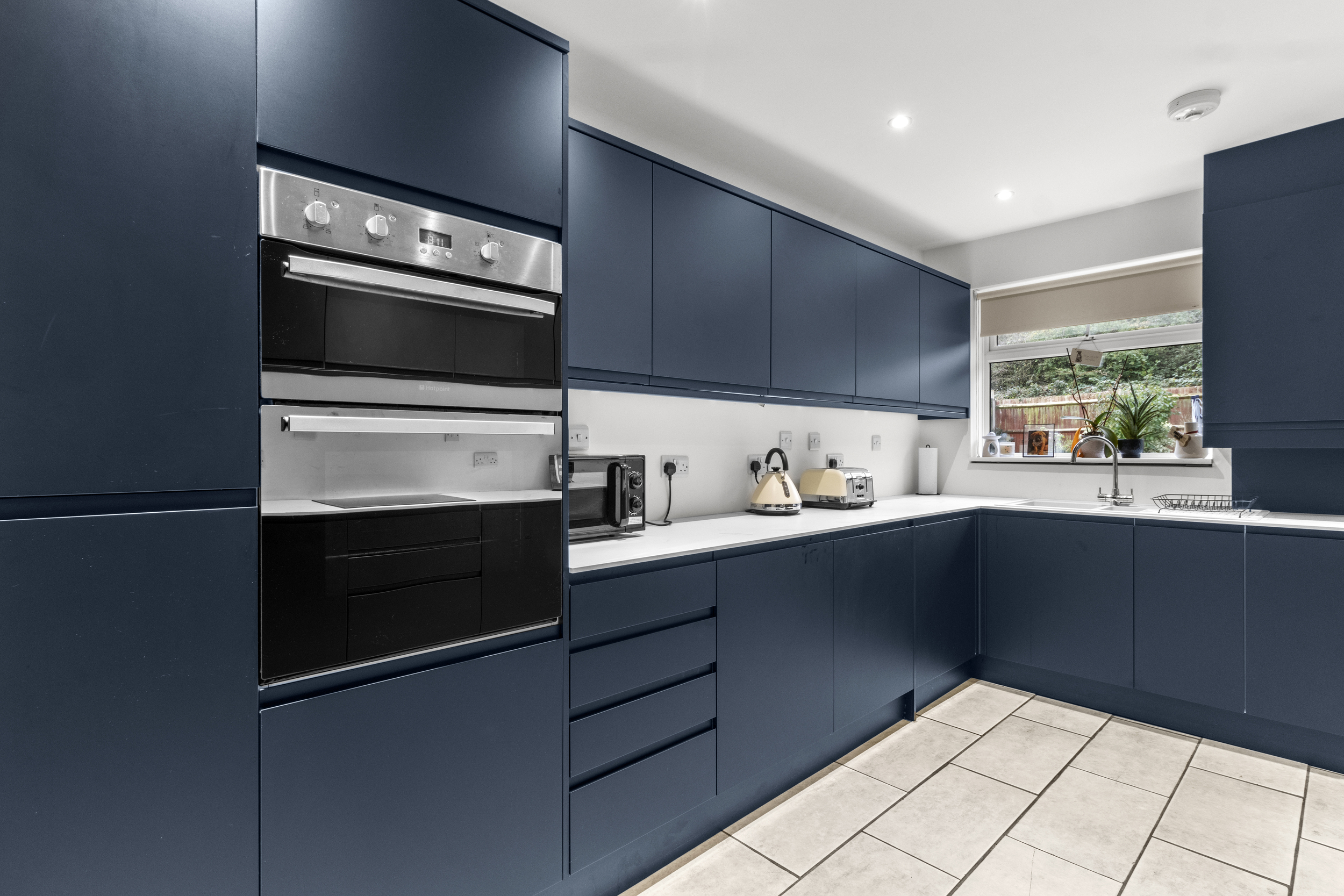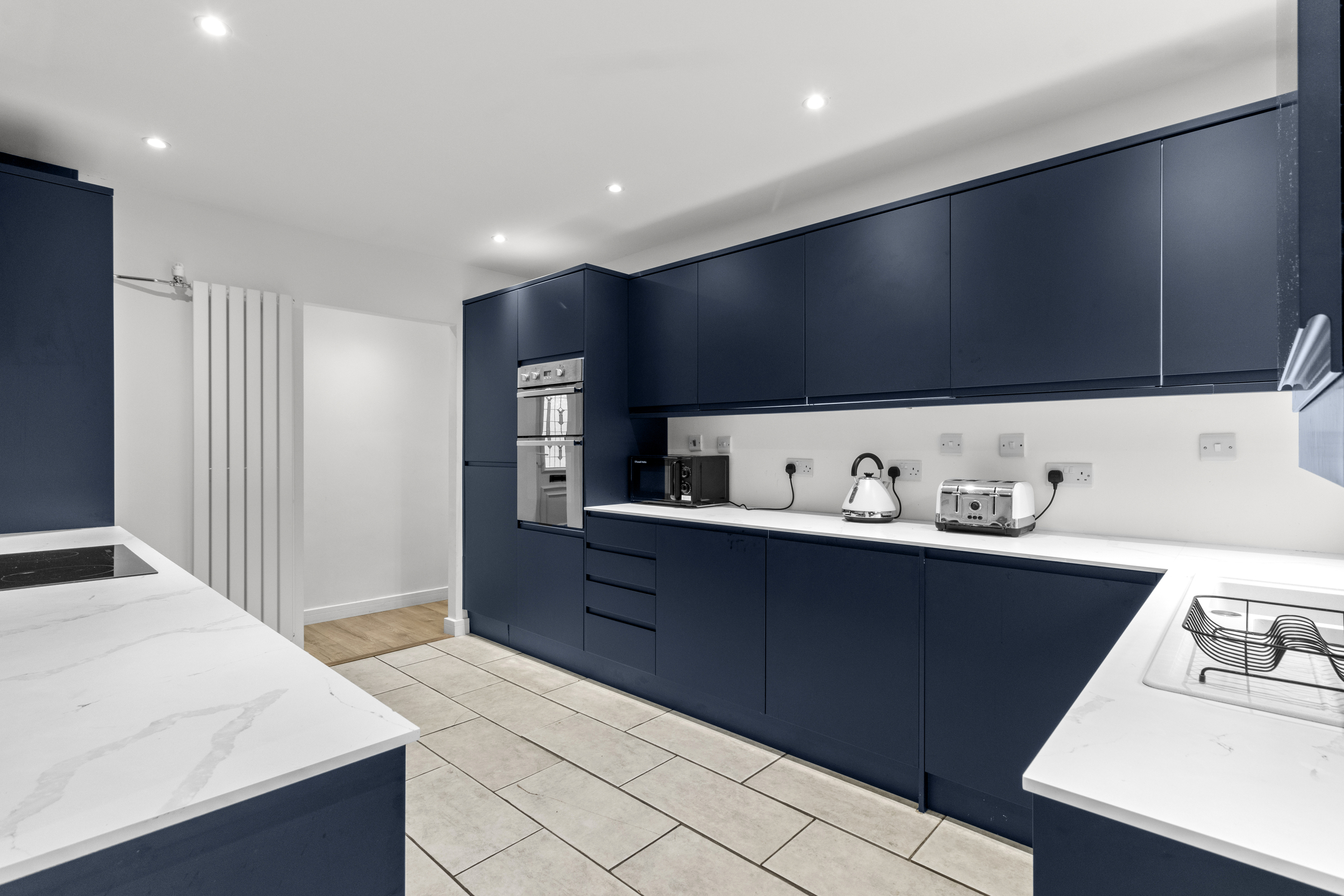 Just off the entrance hall is the well-equipped, modern kitchen. This room has been carefully designed to maximize storage and workspace, featuring an array of both wall-mounted and base units in a stylish, cohesive design. Integrated appliances include a fridge, freezer, oven, grill, hob, washing machine, and dishwasher, making everyday tasks convenient and efficient. With everything built-in, the kitchen maintains a clean and organized look, catering to both functionality and aesthetic appeal.