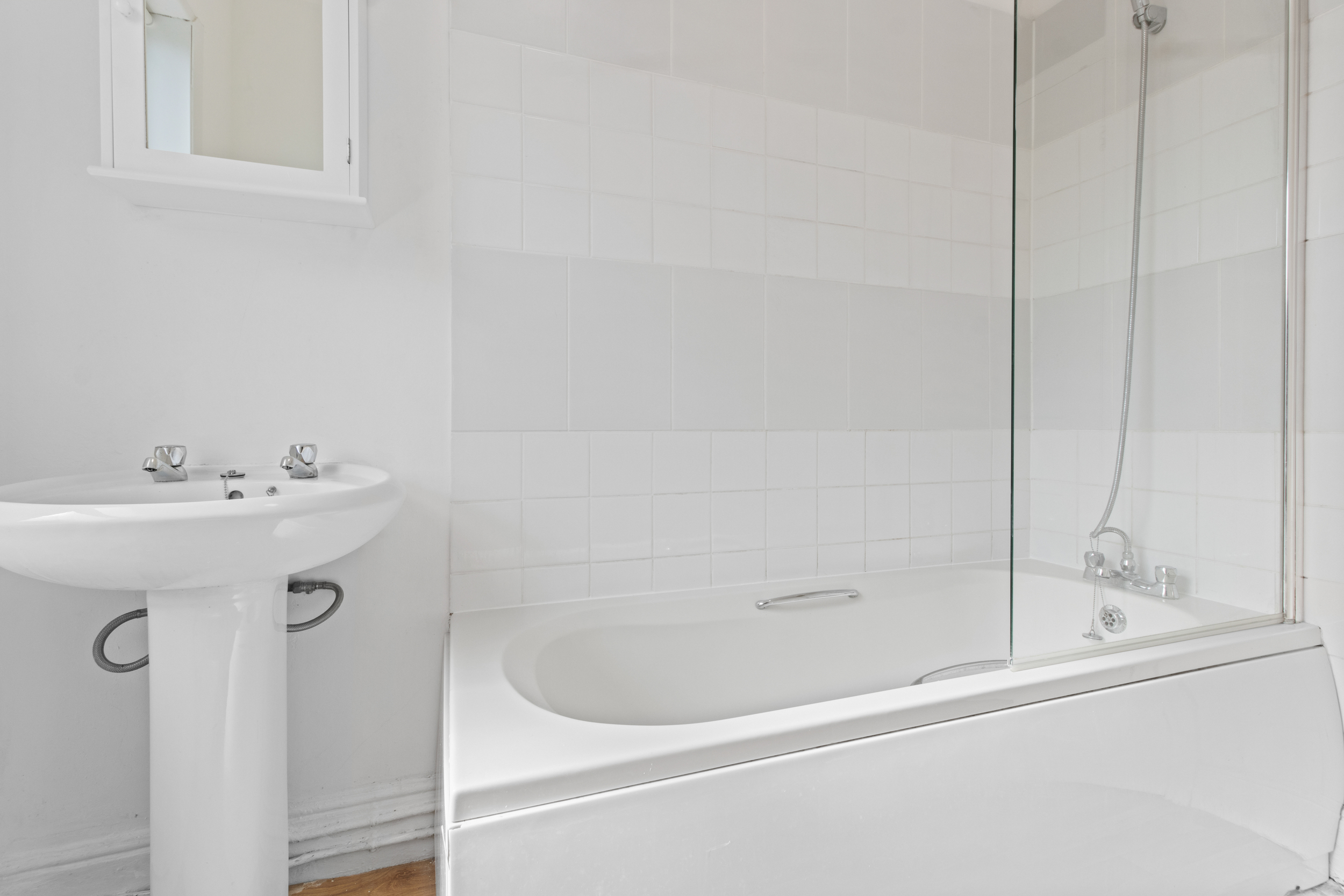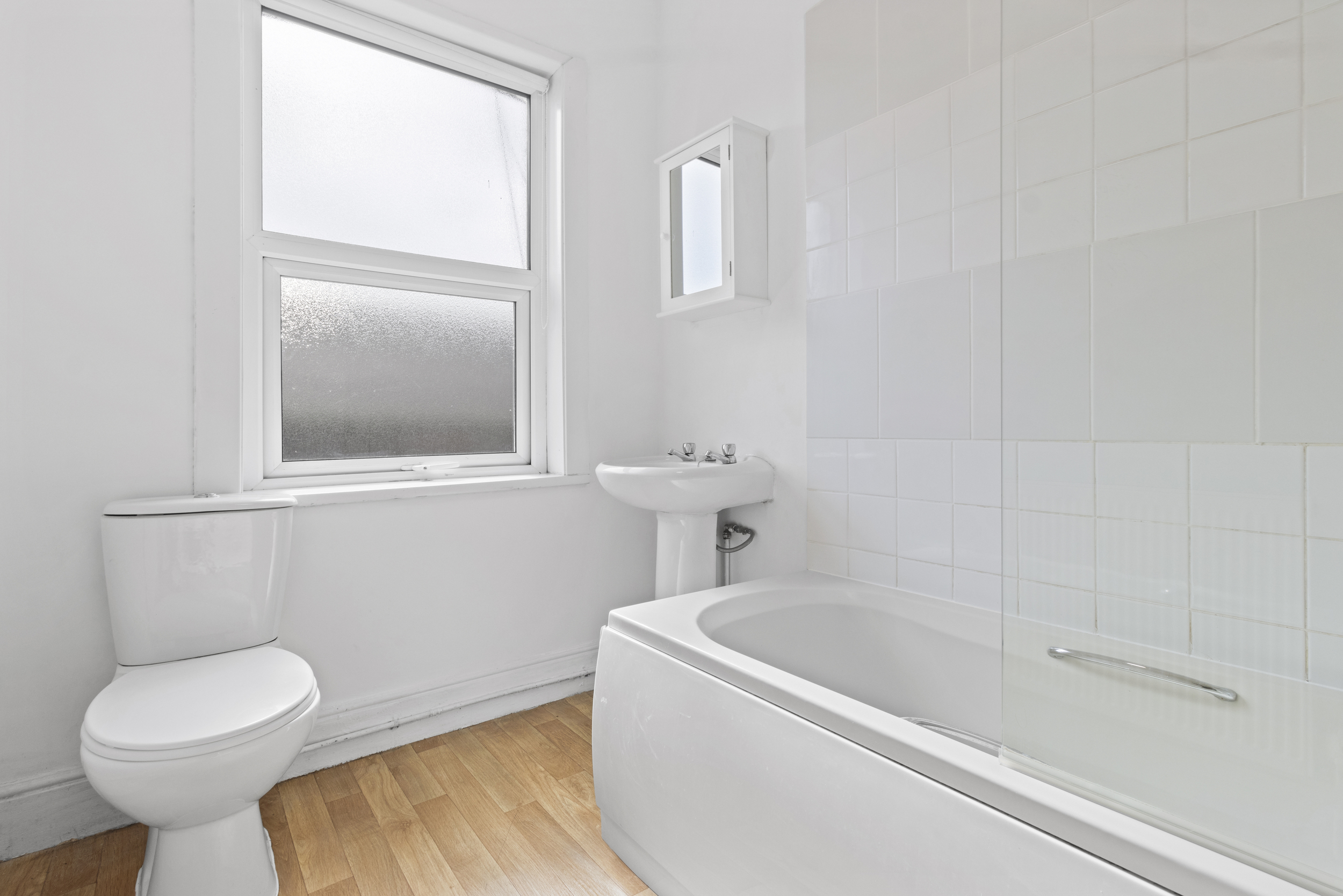 To the rear is the family bathroom, featuring a three-piece white suite including a panelled enclosed bath, pedestal basin, and WC. Though perfectly serviceable, the bathroom also offers scope for cosmetic updating to meet modern tastes.