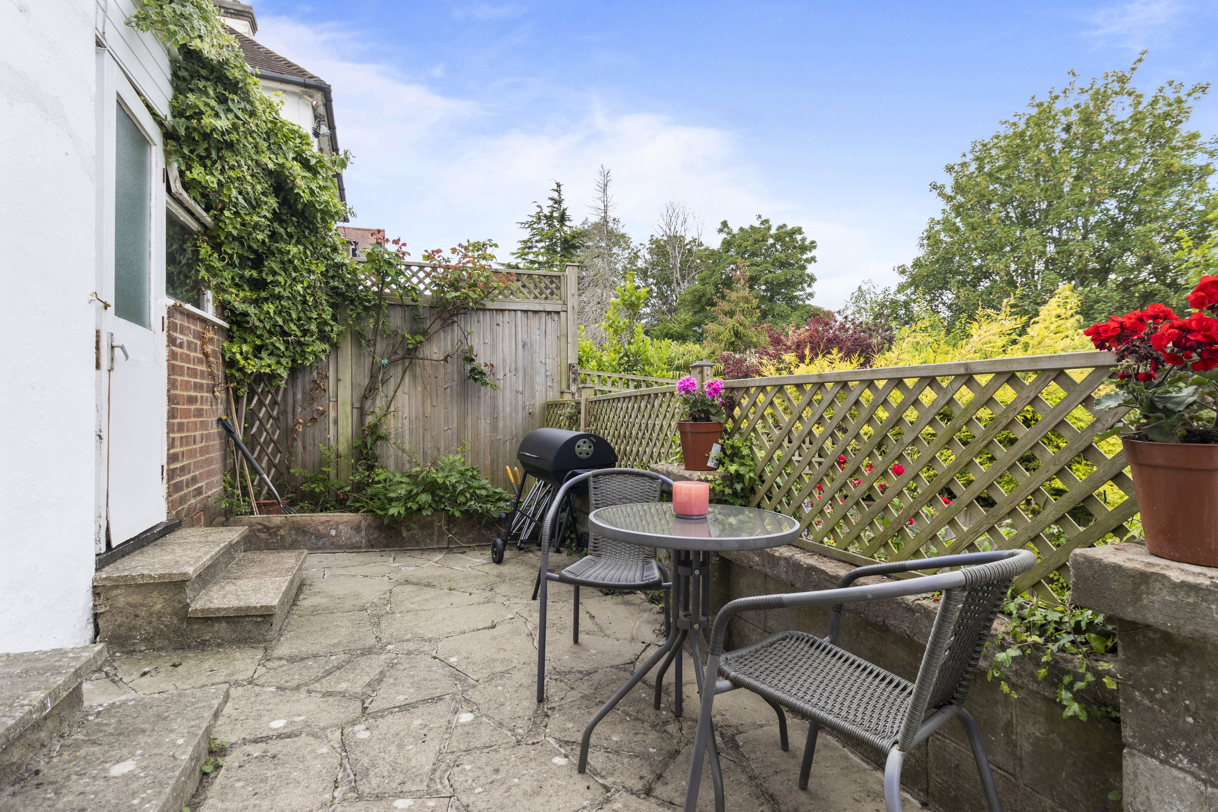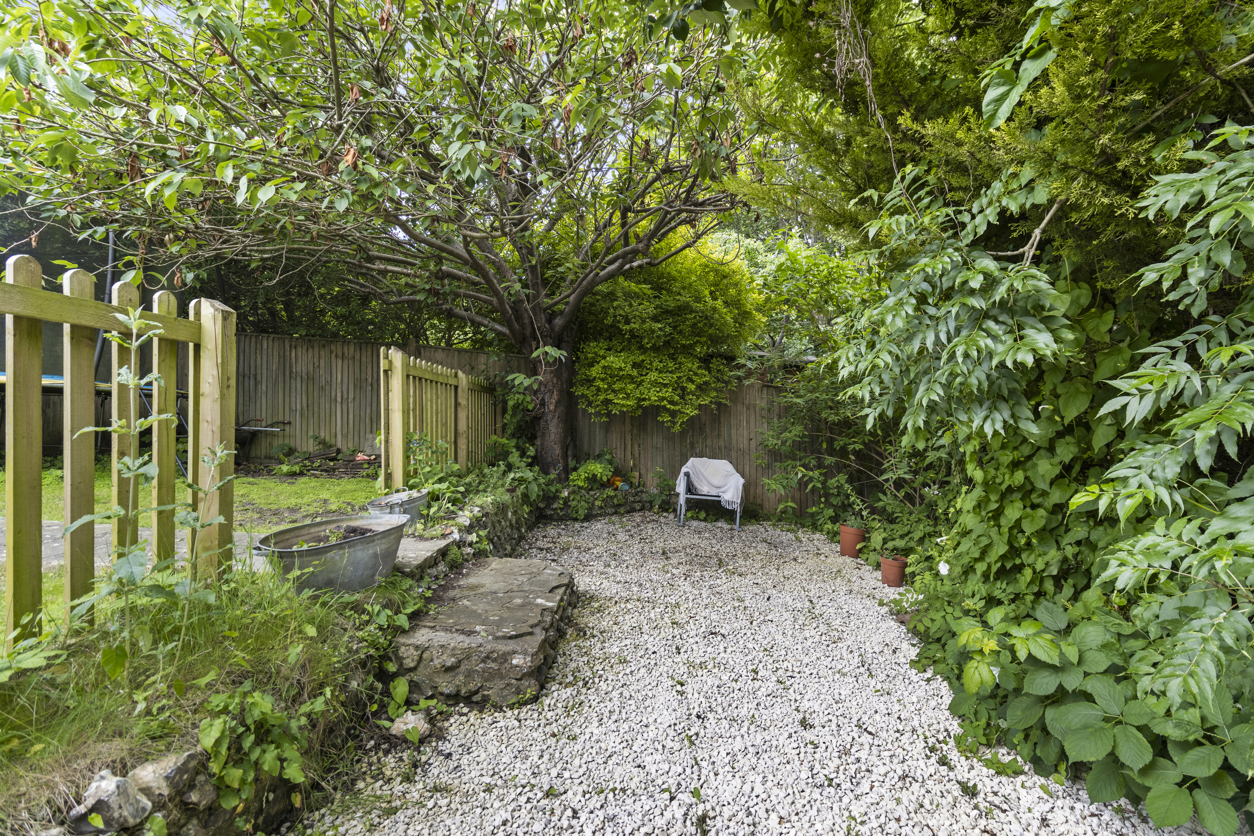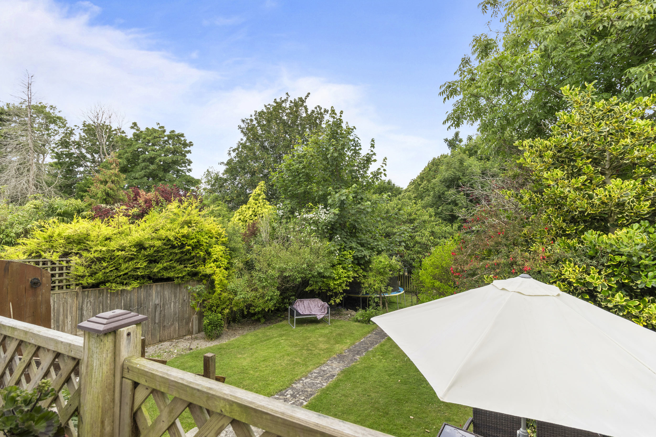 The rear garden of this property is a true highlight — a beautifully landscaped and private outdoor haven measuring approximately 115ft in length. Thoughtfully divided into three distinct sections, it offers space for both relaxation and recreation. Immediately adjoining the house is a generous patio area, accessible from the dining room, kitchen, and side of the property. This wraparound paved area is perfect for outdoor dining, entertaining, or simply enjoying the peaceful setting. A few steps lead down to a large, well-maintained lawn, bordered by mature trees and shrubs that provide privacy and a sense of seclusion. Beyond this lies a charming arched gateway leading to a further lawned section, ideal for children’s play or quiet moments. At the far end of the garden, a tranquil stone-covered area awaits, beautifully framed by a striking cherry blossom tree and mature planting. This thoughtfully designed outdoor space offers a rare combination of size, beauty, and privacy — ideal for families, gardeners, and those who love to spend time outdoors.