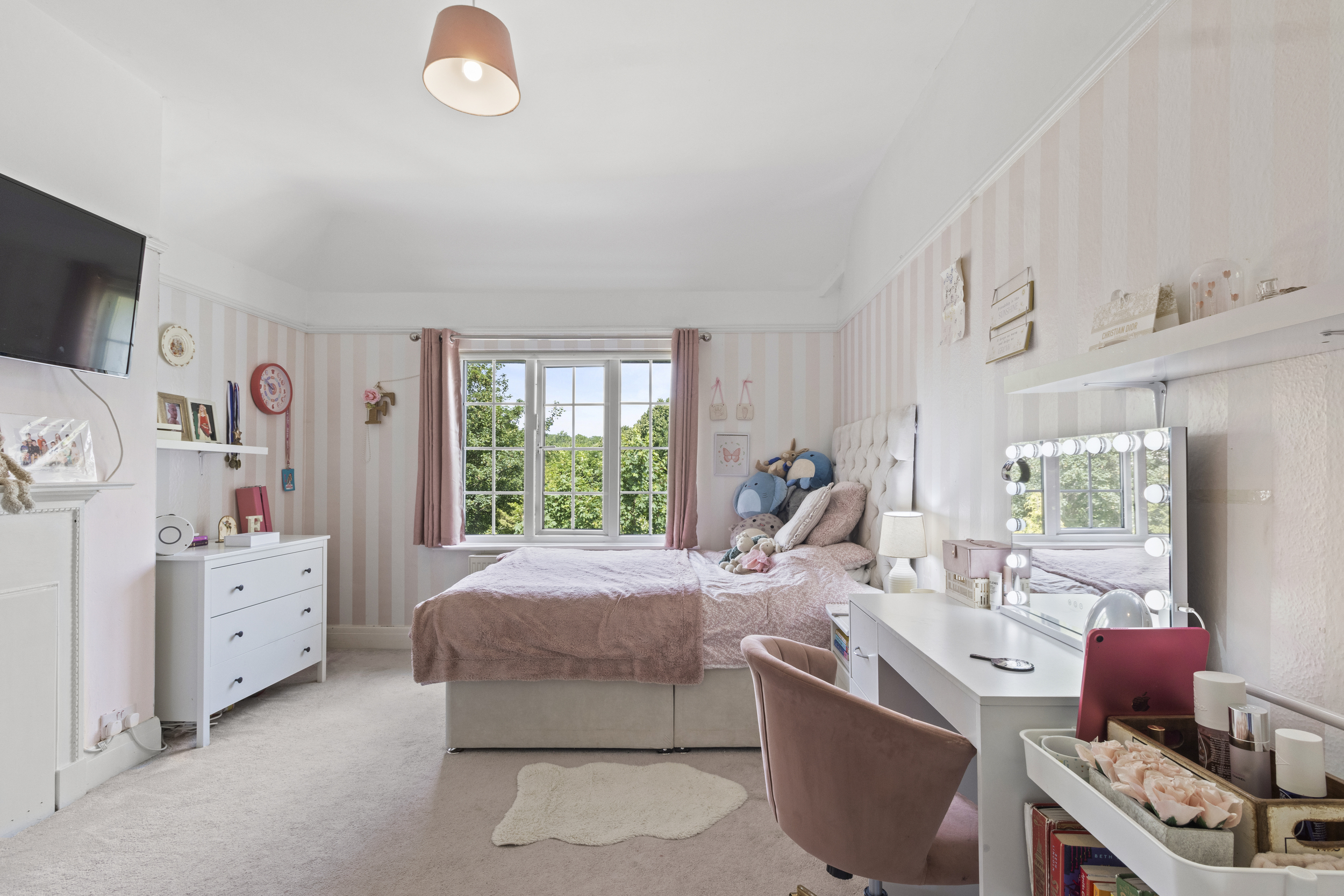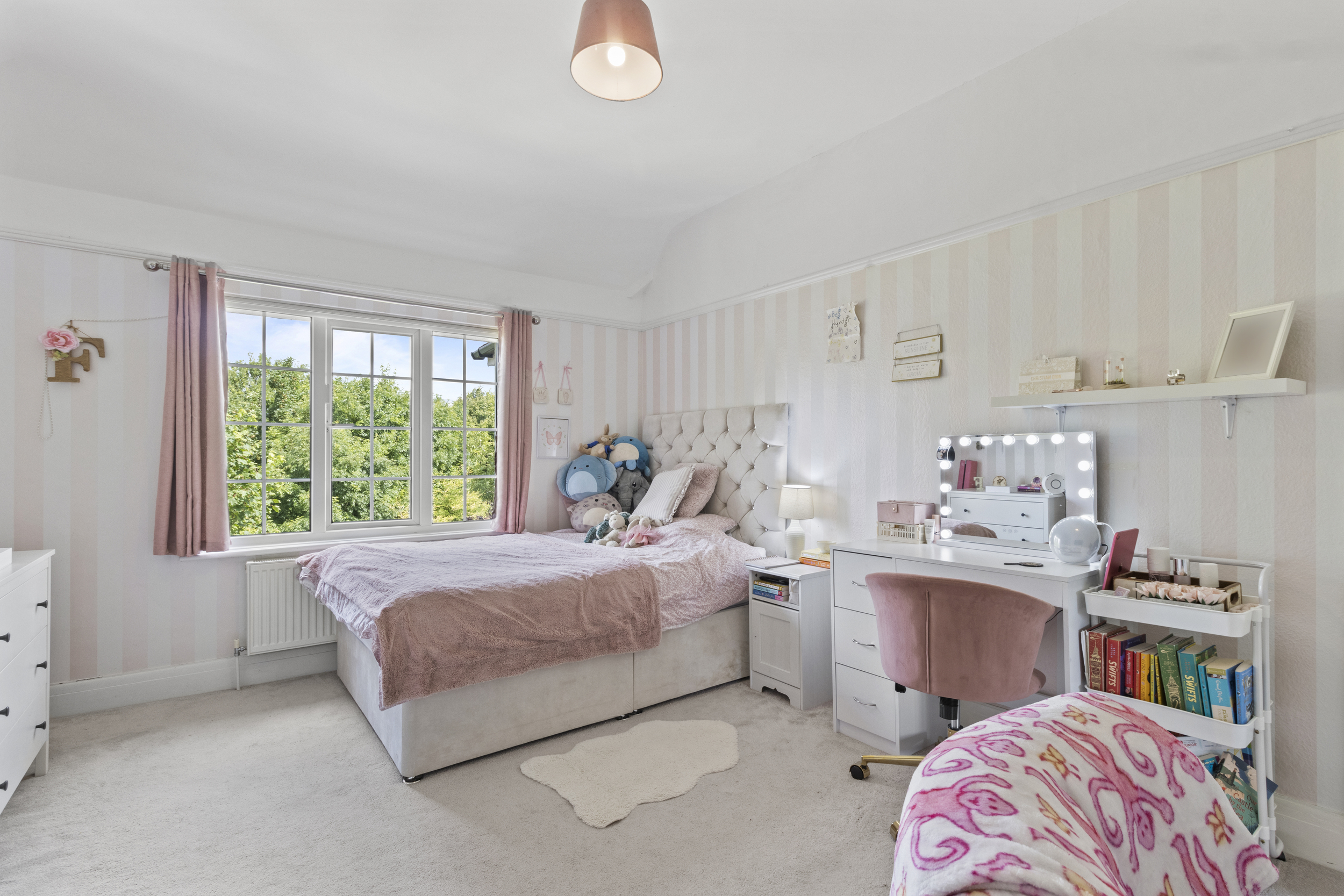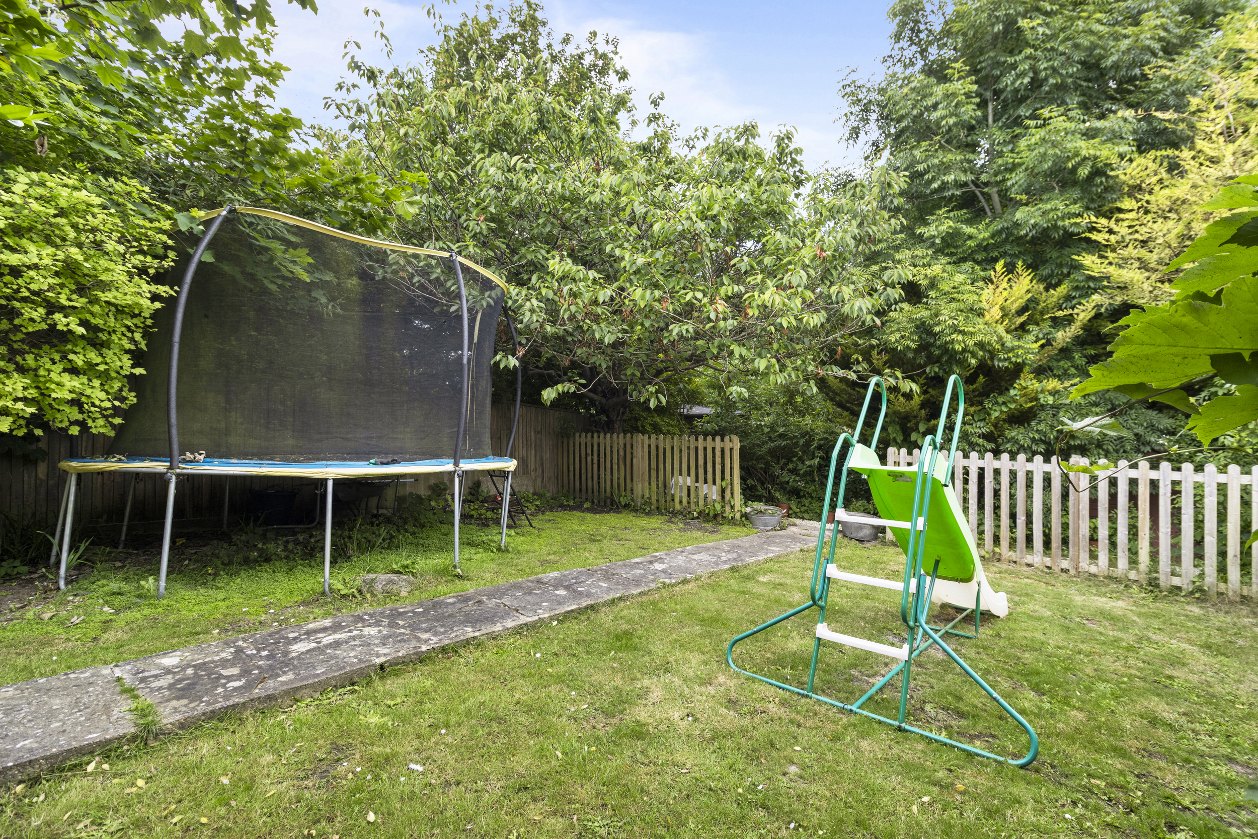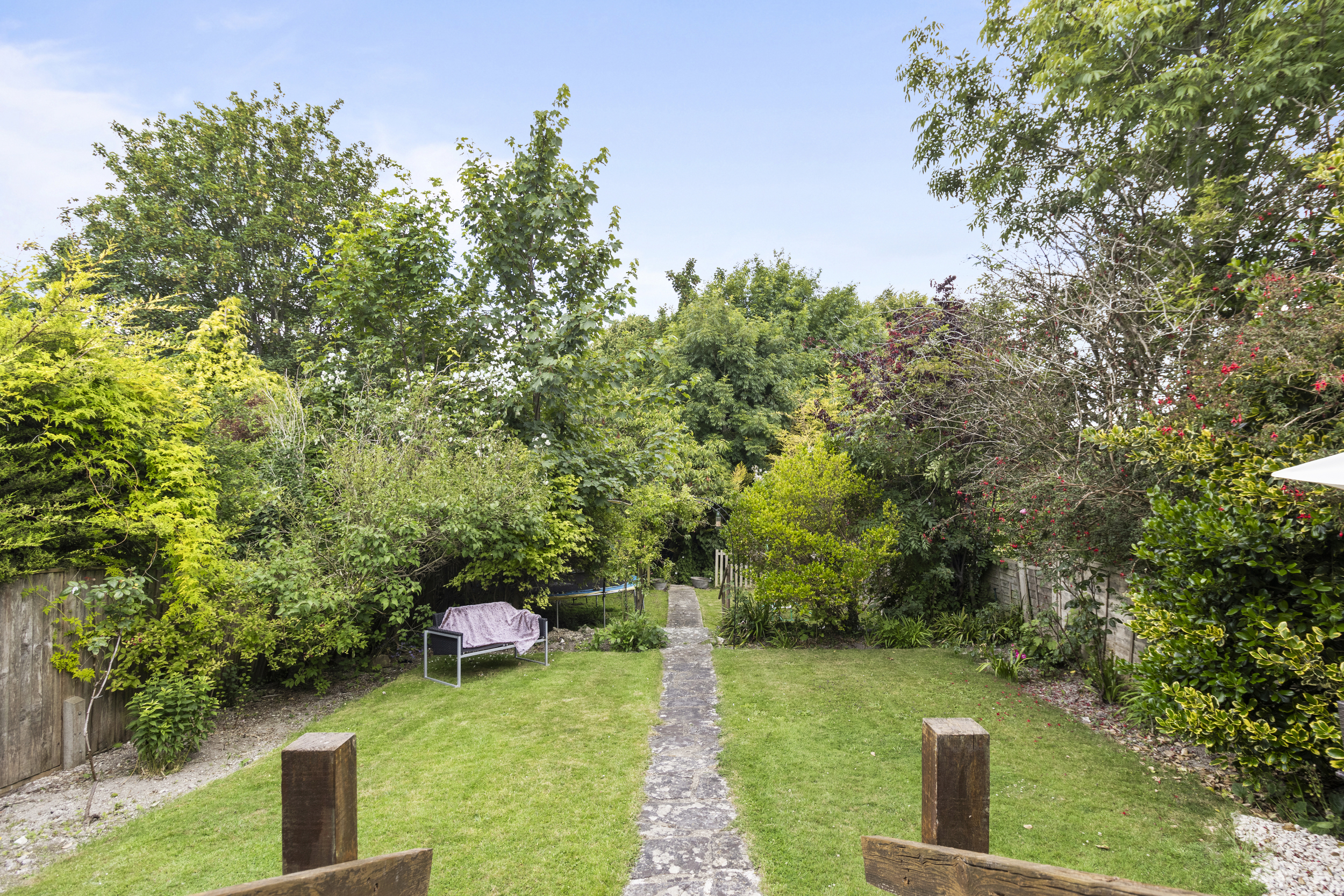 The rear garden of this property is a true highlight — a beautifully landscaped and private outdoor haven measuring approximately 115ft in length. Thoughtfully divided into three distinct sections, it offers space for both relaxation and recreation. Immediately adjoining the house is a generous patio area, accessible from the dining room, kitchen, and side of the property. This wraparound paved area is perfect for outdoor dining, entertaining, or simply enjoying the peaceful setting. A few steps lead down to a large, well-maintained lawn, bordered by mature trees and shrubs that provide privacy and a sense of seclusion. Beyond this lies a charming arched gateway leading to a further lawned section, ideal for children’s play or quiet moments. At the far end of the garden, a tranquil stone-covered area awaits, beautifully framed by a striking cherry blossom tree and mature planting. This thoughtfully designed outdoor space offers a rare combination of size, beauty, and privacy — ideal for families, gardeners, and those who love to spend time outdoors.