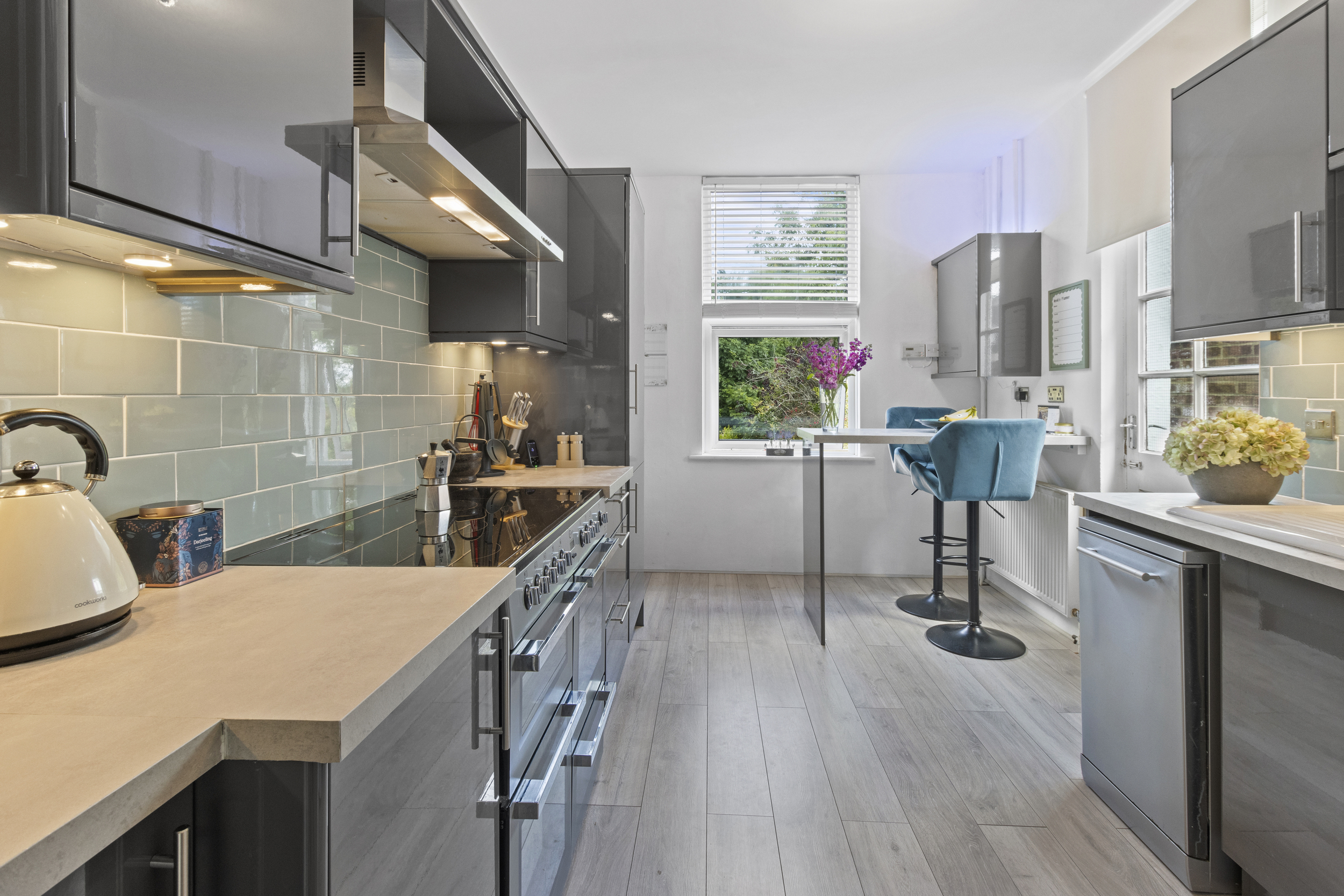 At the heart of the home is the modern kitchen/breakfast room, thoughtfully fitted with a range of wall-mounted and base units, space for a stylish range cooker, a freestanding fridge freezer and washing machine, and a practical breakfast bar. The kitchen enjoys garden views and access to the patio, making it perfect for indoor-outdoor living. Completing the ground floor is a contemporary cloakroom, ideal for guests.