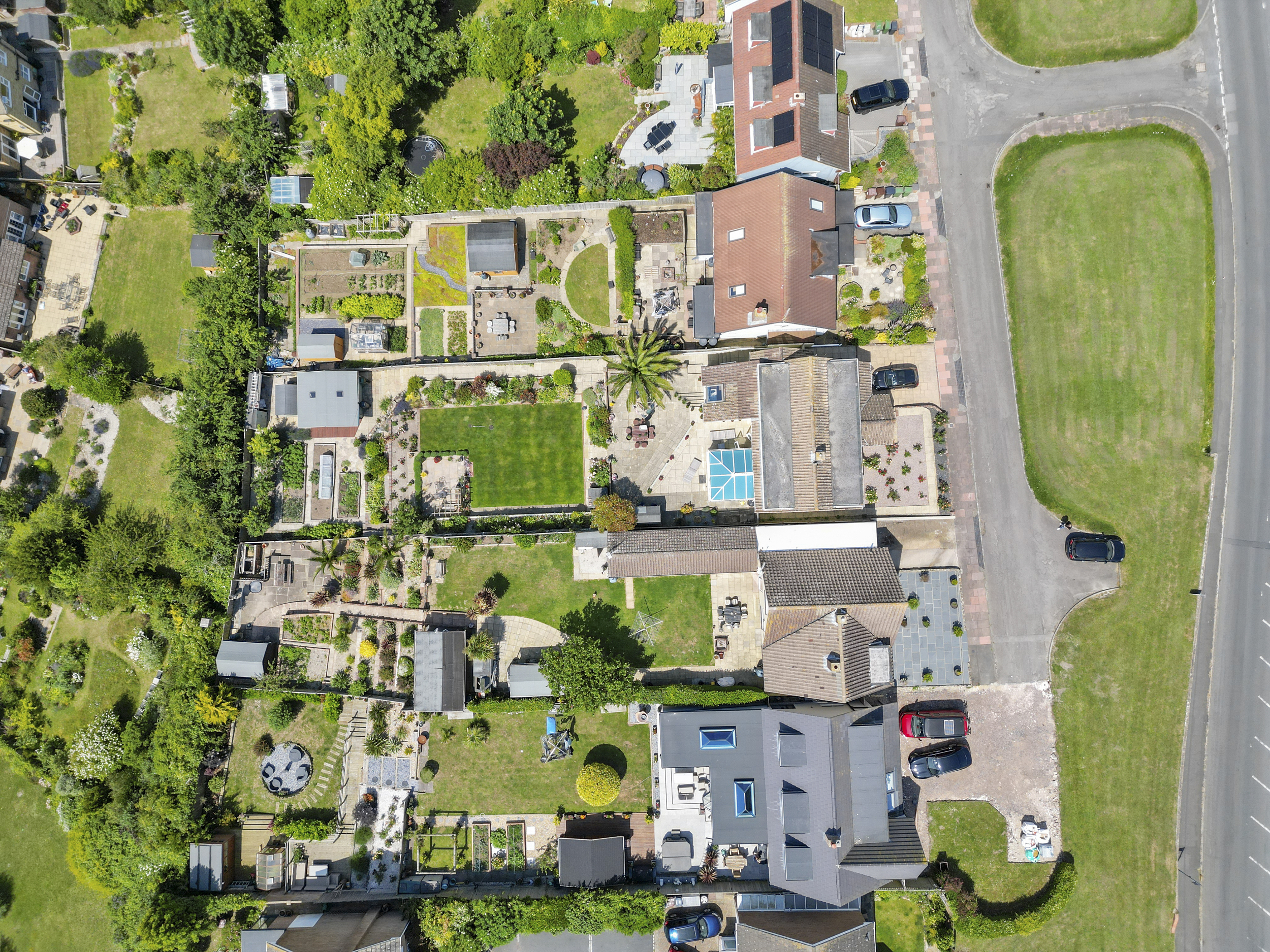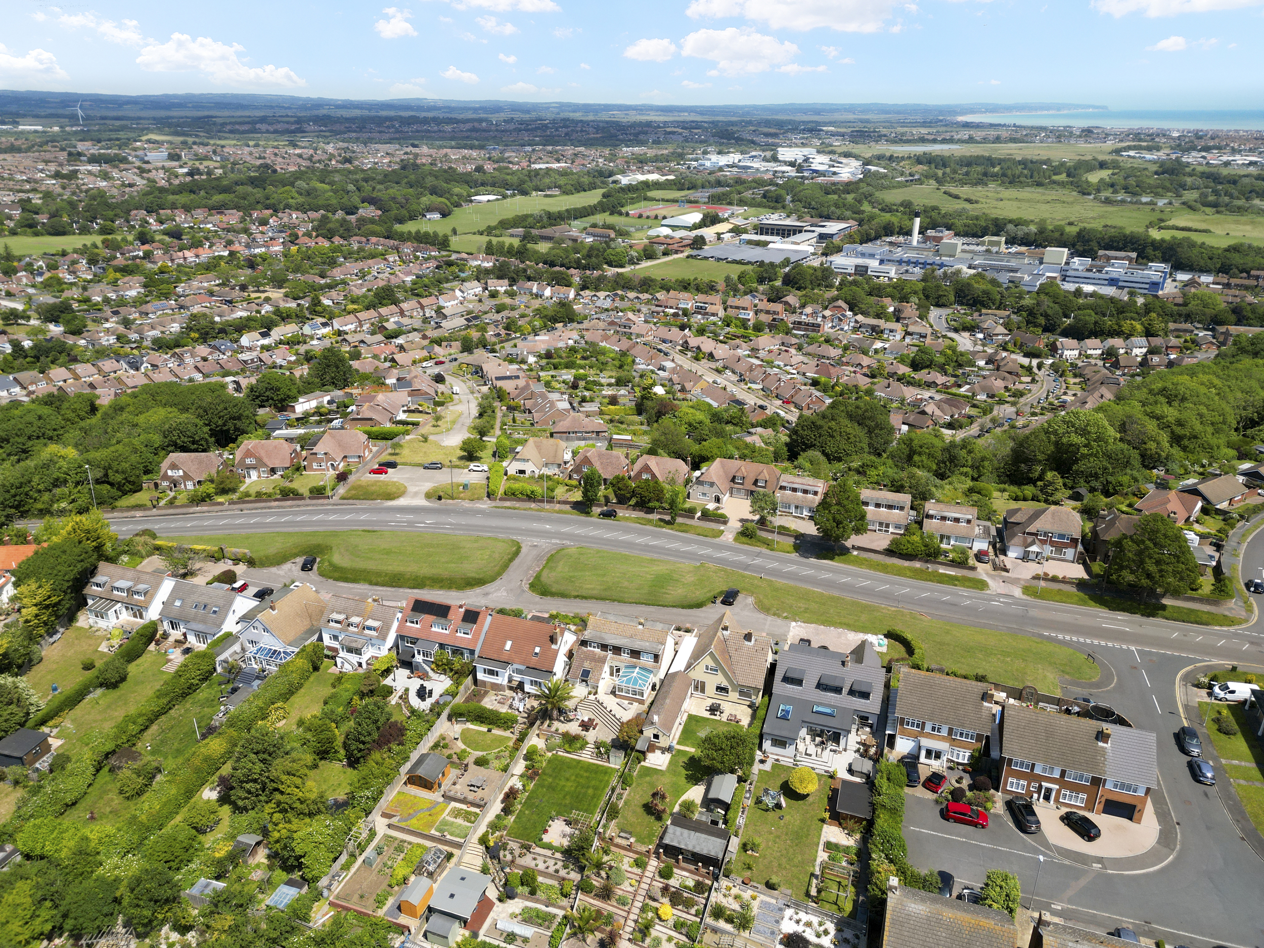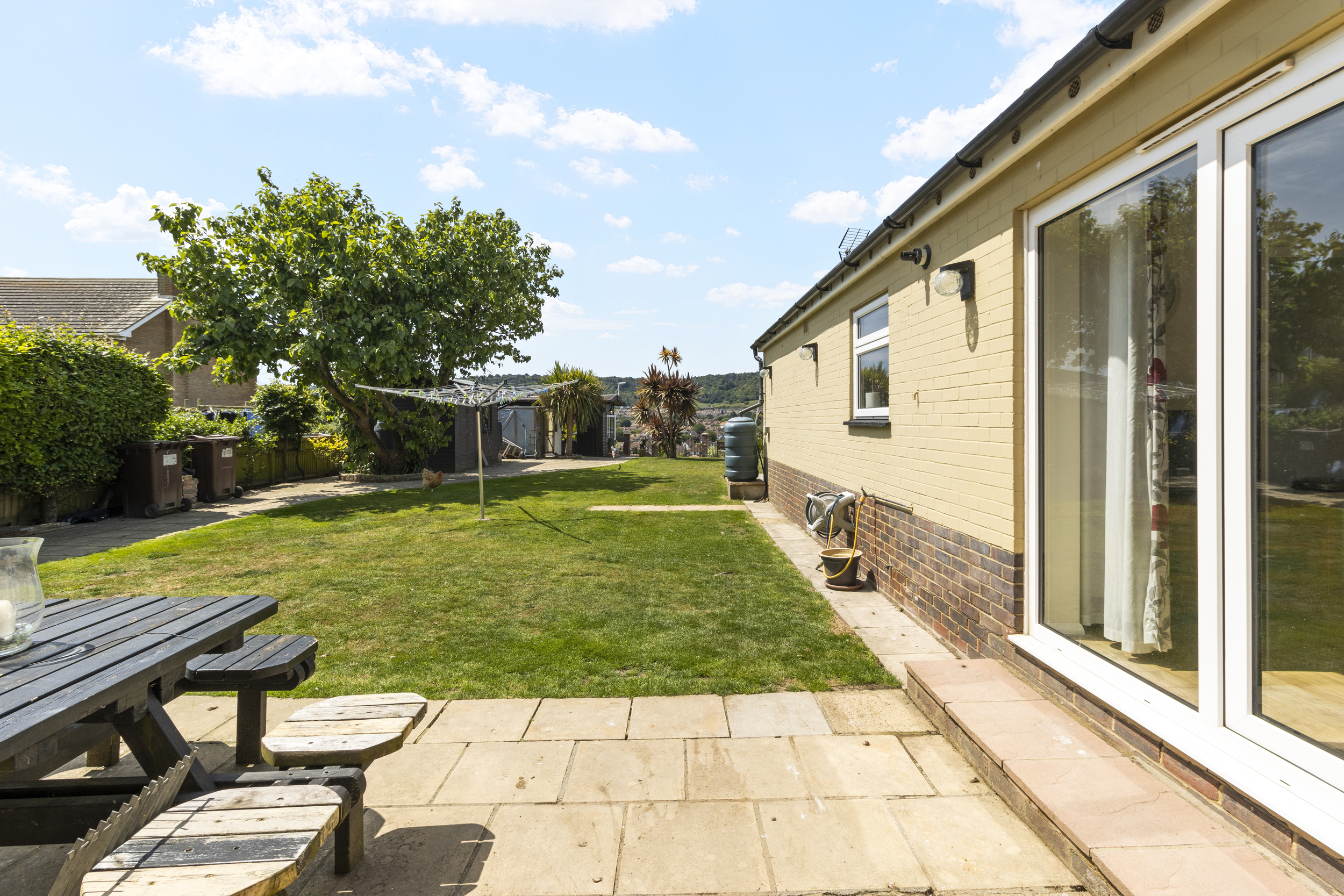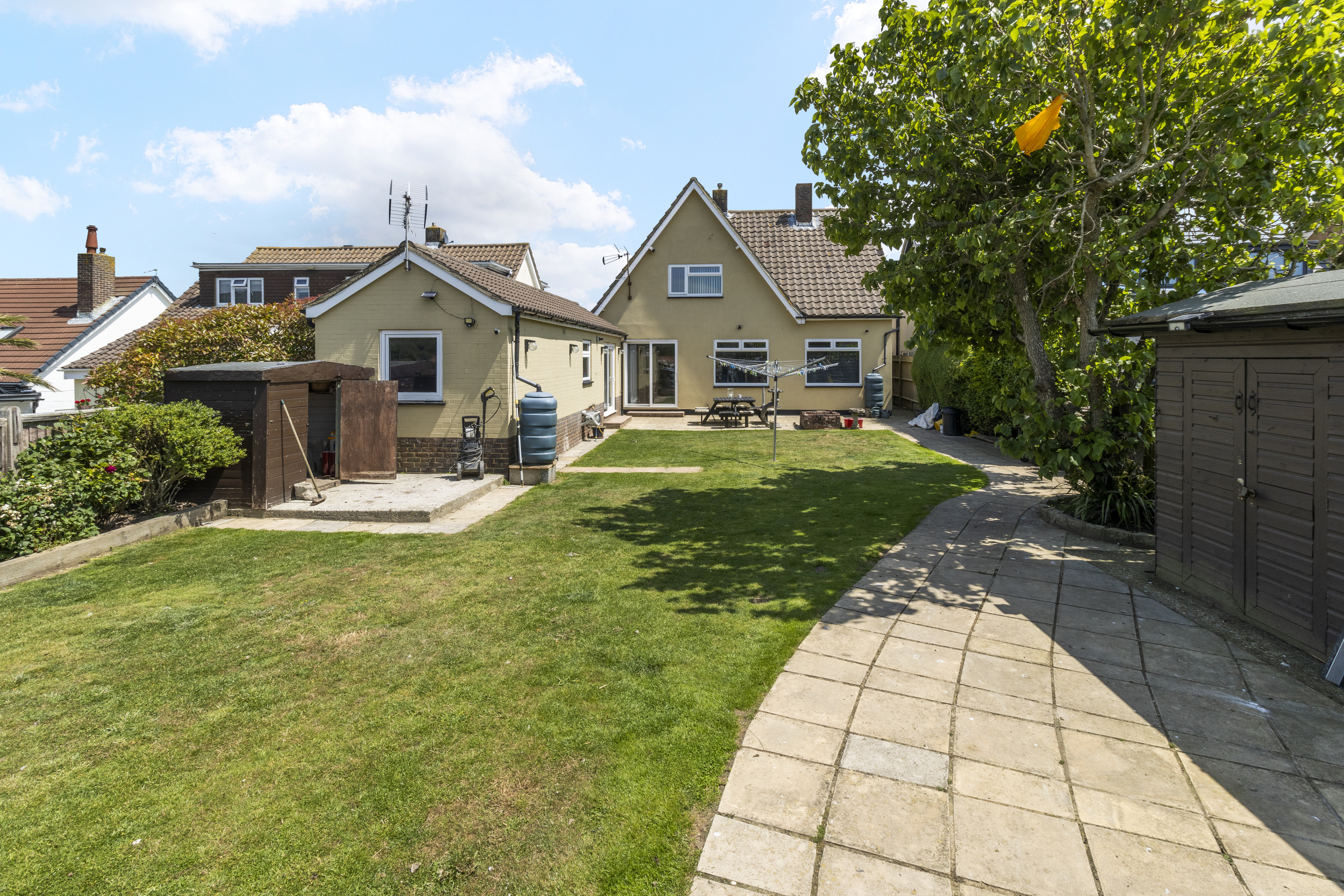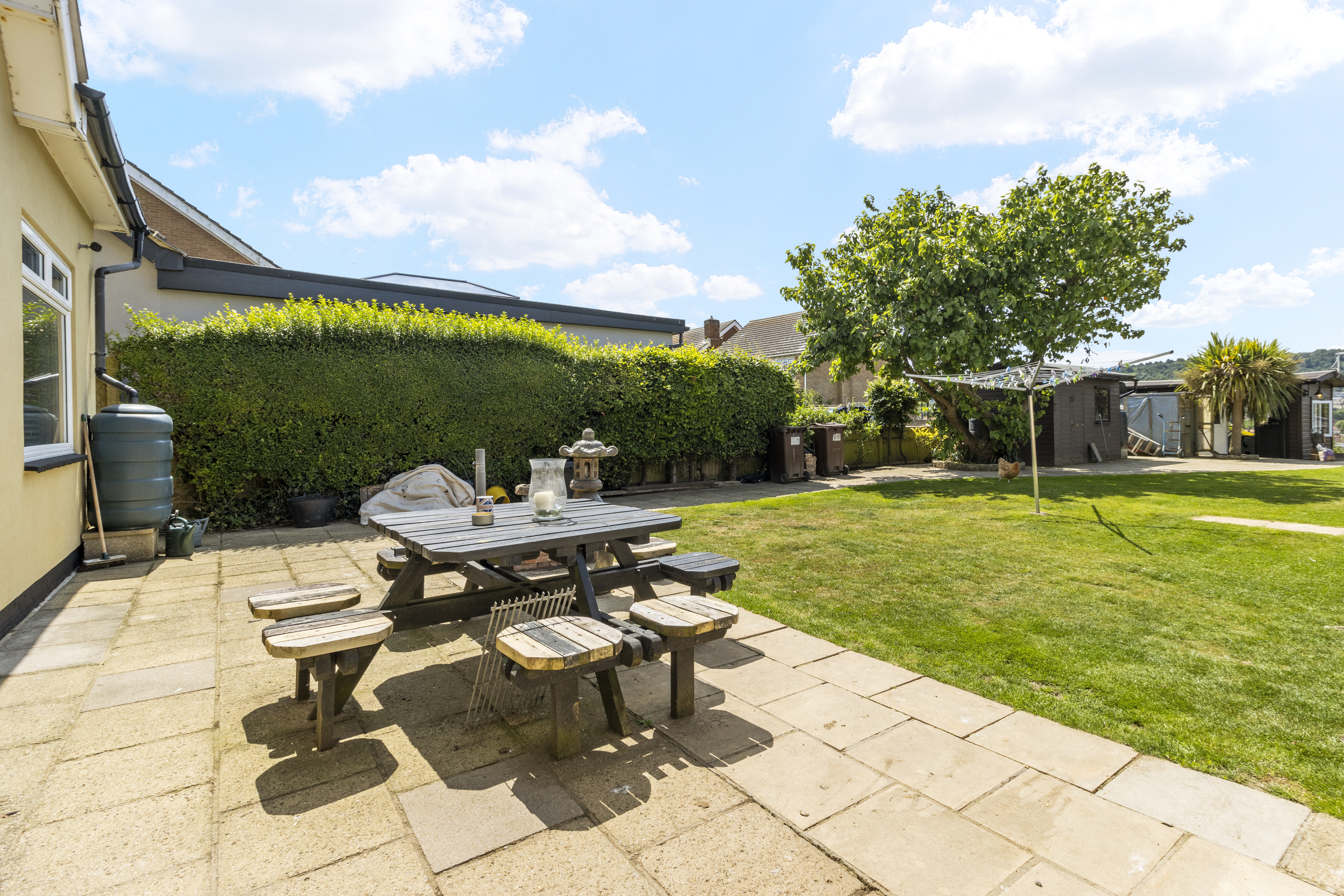To the front of the property, a private driveway provides convenient off-road parking, with a neatly maintained frontage offering a welcoming approach to the home. The rear garden is a standout feature — a beautifully landscaped, westerly-facing outdoor space designed for relaxation and entertaining. Immediately adjoining the house is a spacious paved patio, perfect for outdoor dining and enjoying the afternoon sun. Beyond lies a generous lawn, bordered by mature shrubs and planting that create a sense of privacy and tranquillity. The garden also includes a series of outbuildings, one of which is currently used as a gym but could easily be adapted into a home office, studio, or hobby room. A set of steps leads down to a lower garden area laid to patio, complete with an additional shed and uninterrupted, far-reaching views of the South Downs, providing a peaceful and scenic retreat at the end of the garden.