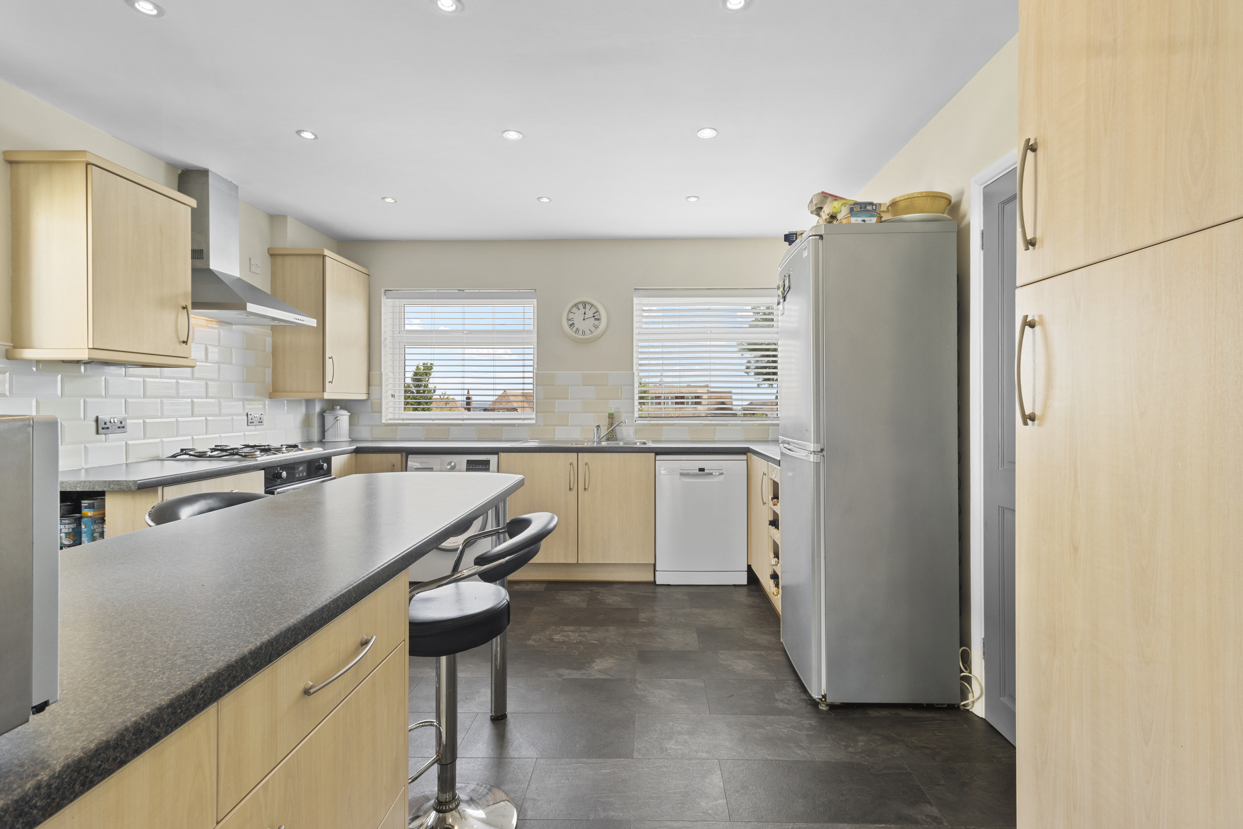 The kitchen/breakfast room is thoughtfully designed with both form and function in mind. Fitted with a comprehensive range of wall-mounted and matching base units, it offers plenty of storage and worktop space. Integrated appliances include a built-in oven and four-ring gas hob with extractor hood, while space is provided for a freestanding fridge-freezer, dishwasher, washing machine, and even a wine cooler.