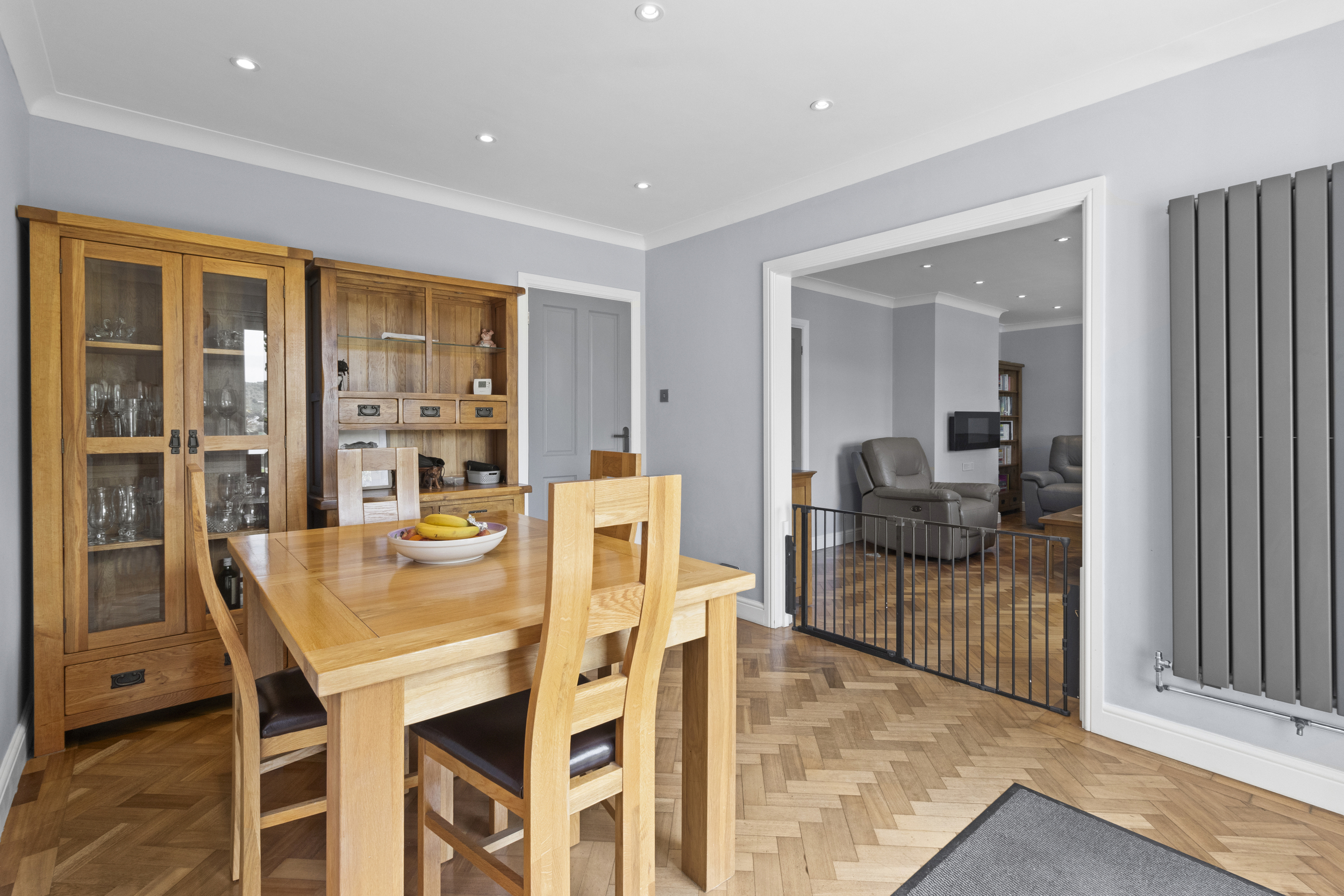 To the rear of the property, the generously proportioned living room boasts a warm and inviting atmosphere, enhanced by a feature fireplace and views of the rear garden. This room flows seamlessly through a wide, square arch into the formal dining room, creating a connected yet distinct entertaining space.