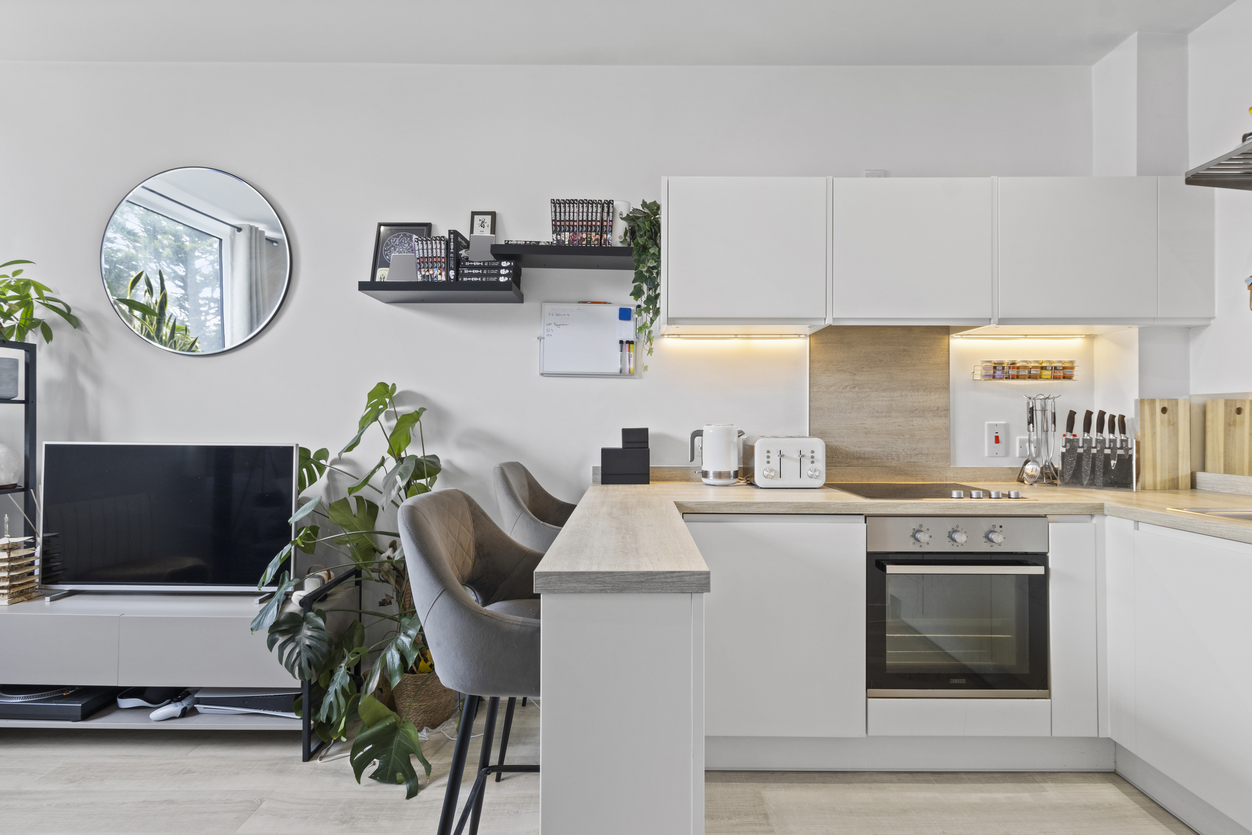 Positioned on the west side of the building, the apartment benefits from an abundance of natural light, enhanced by large double-glazed windows and impressive ceiling heights which create a sense of openness and space. The layout is intelligently designed, featuring an inviting entrance hallway with two useful storage cupboards – one housing the hot water cylinder and plumbing for a washing machine. The open-plan living and kitchen area is the heart of the home, with ample room for both relaxing and dining. The modern fitted kitchen includes sleek wall and base units, an electric hob and oven, and integrated appliances including a dishwasher and fridge, providing both functionality and a clean, contemporary aesthetic.