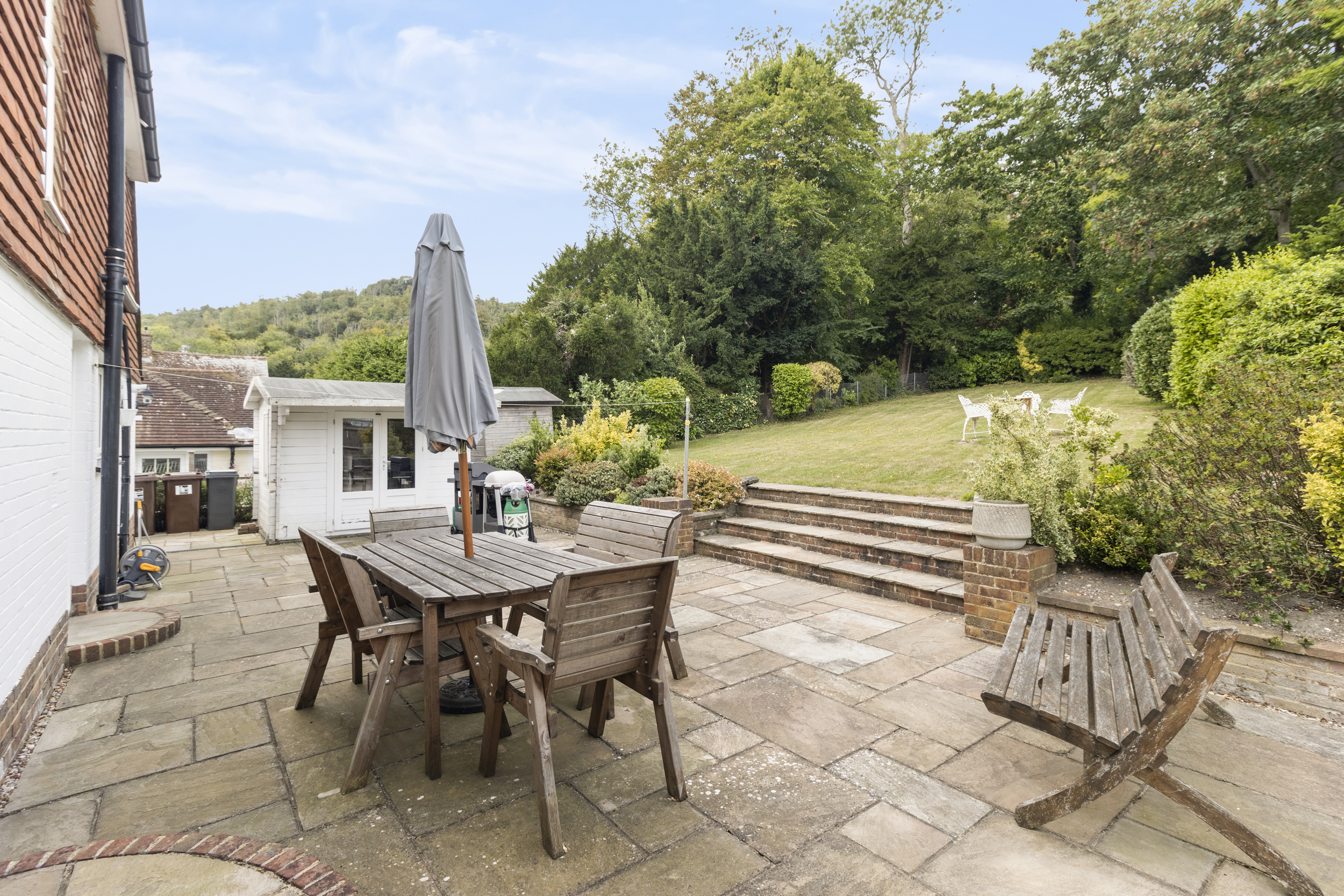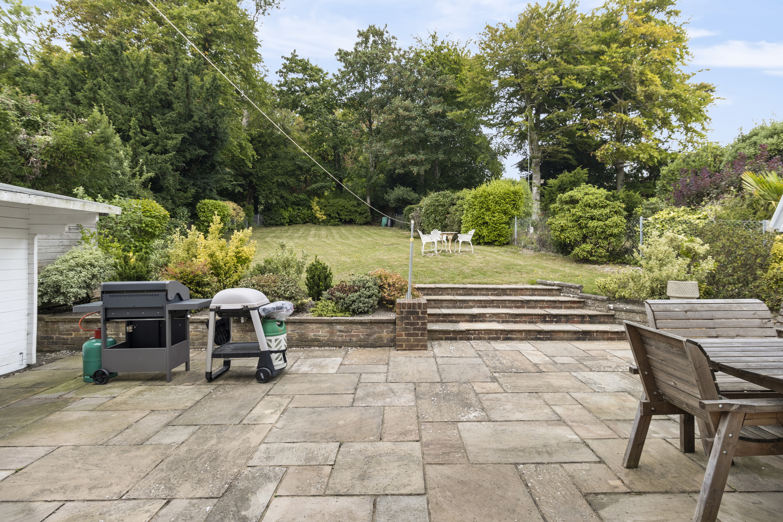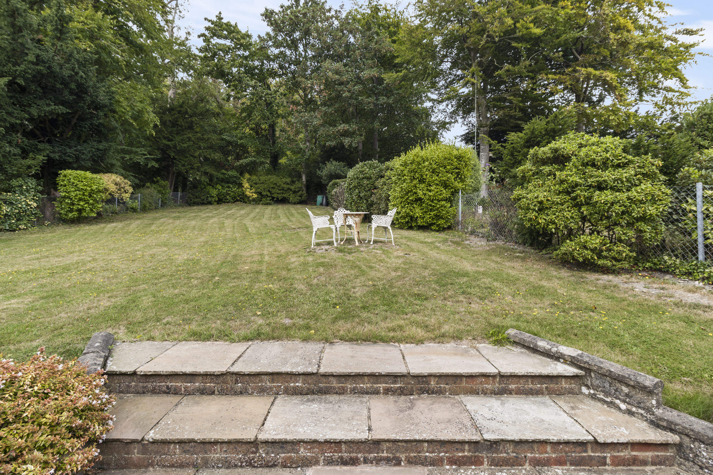 The rear garden is a true highlight of the home, featuring a spacious sandstone patio adjoining the property, perfect for outdoor dining and entertaining. Beyond, a generous expanse of lawn is framed by mature trees, creating a peaceful and private setting while offering a blank canvas for the new owners to design their dream garden.