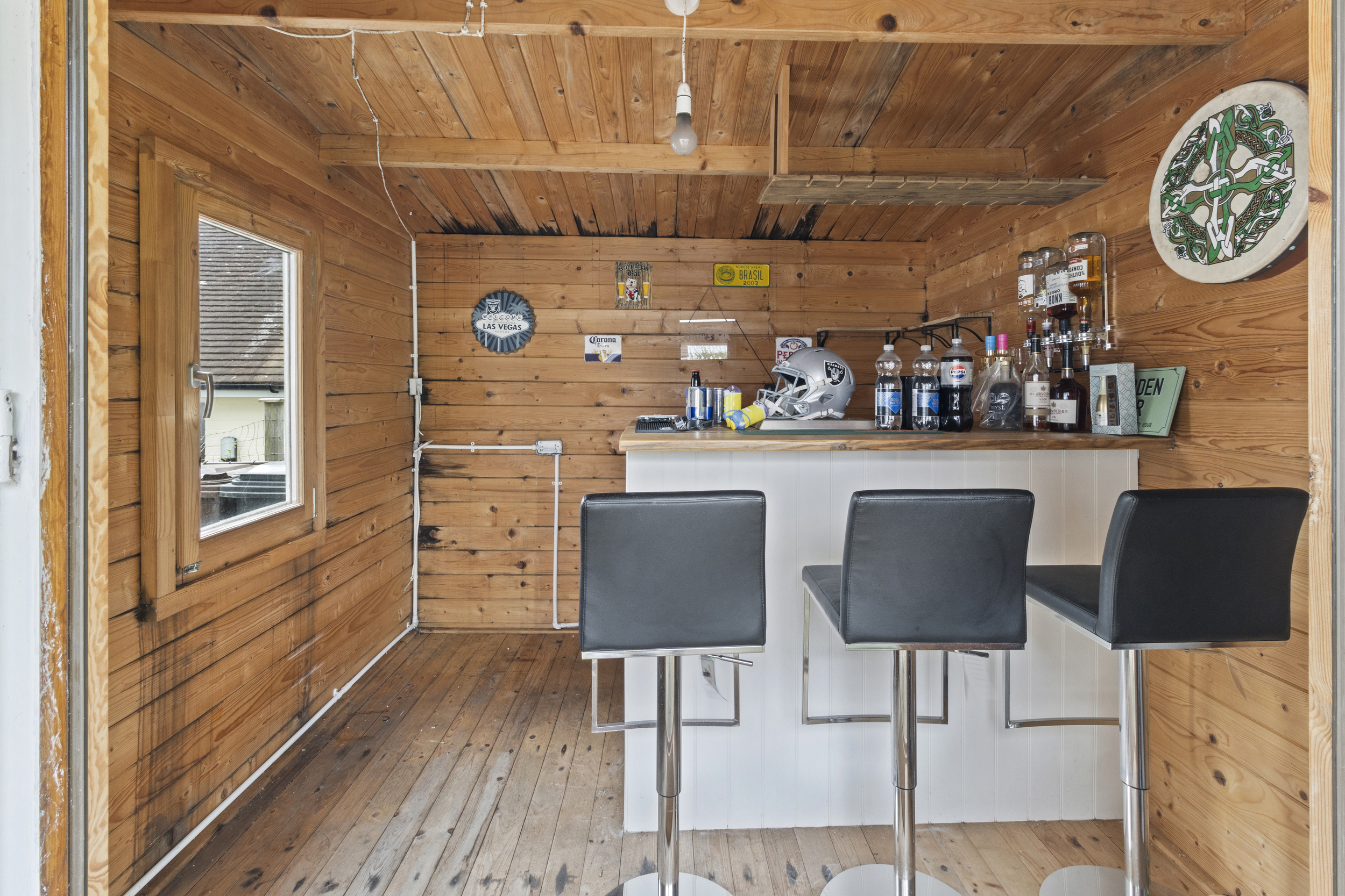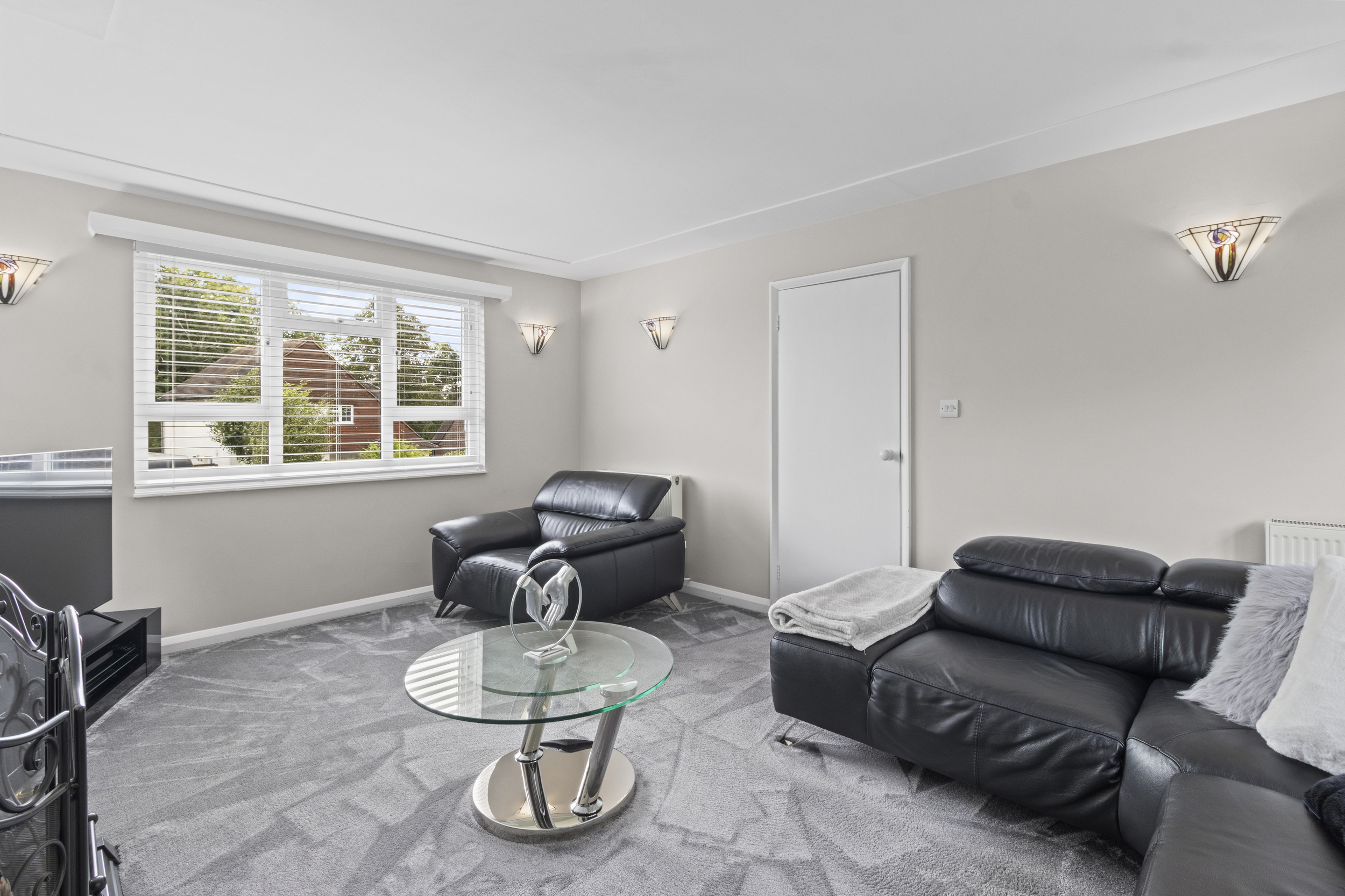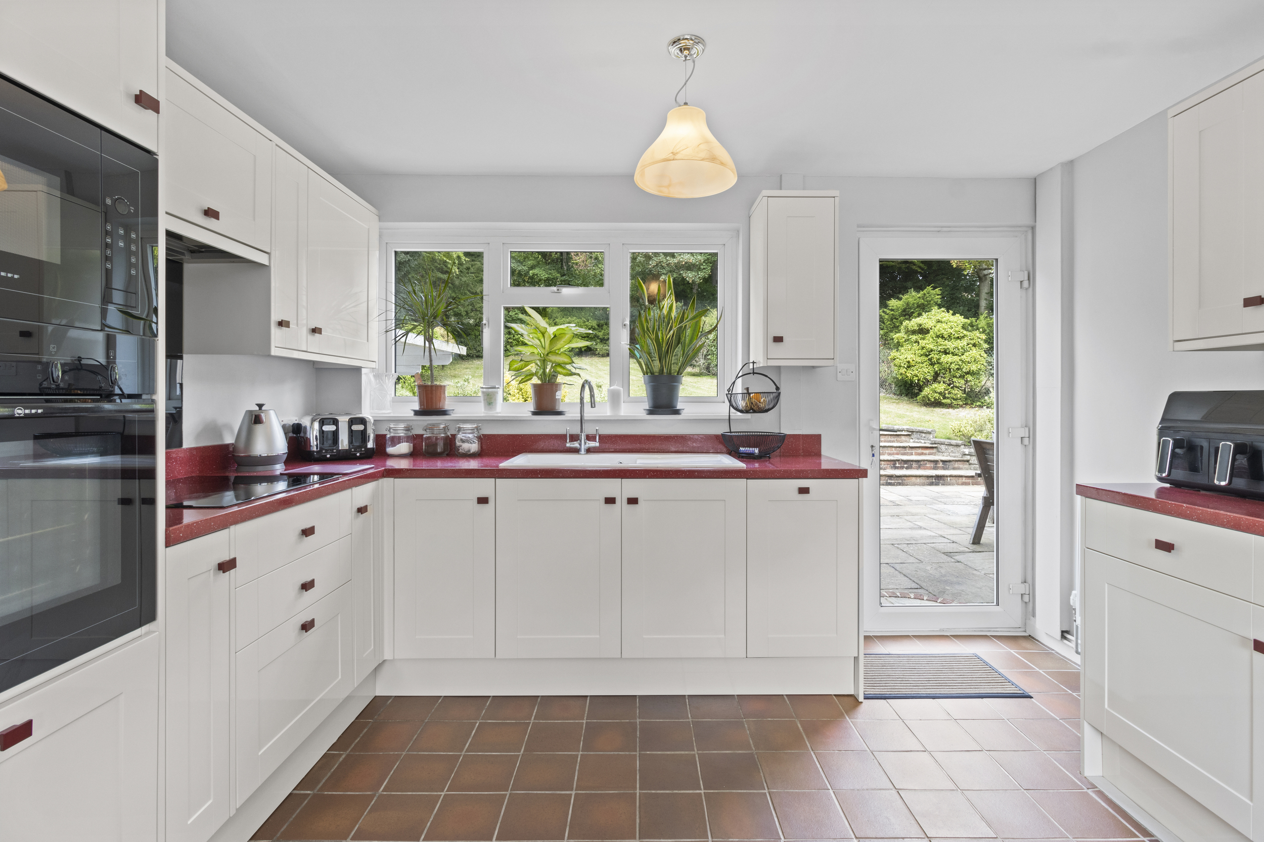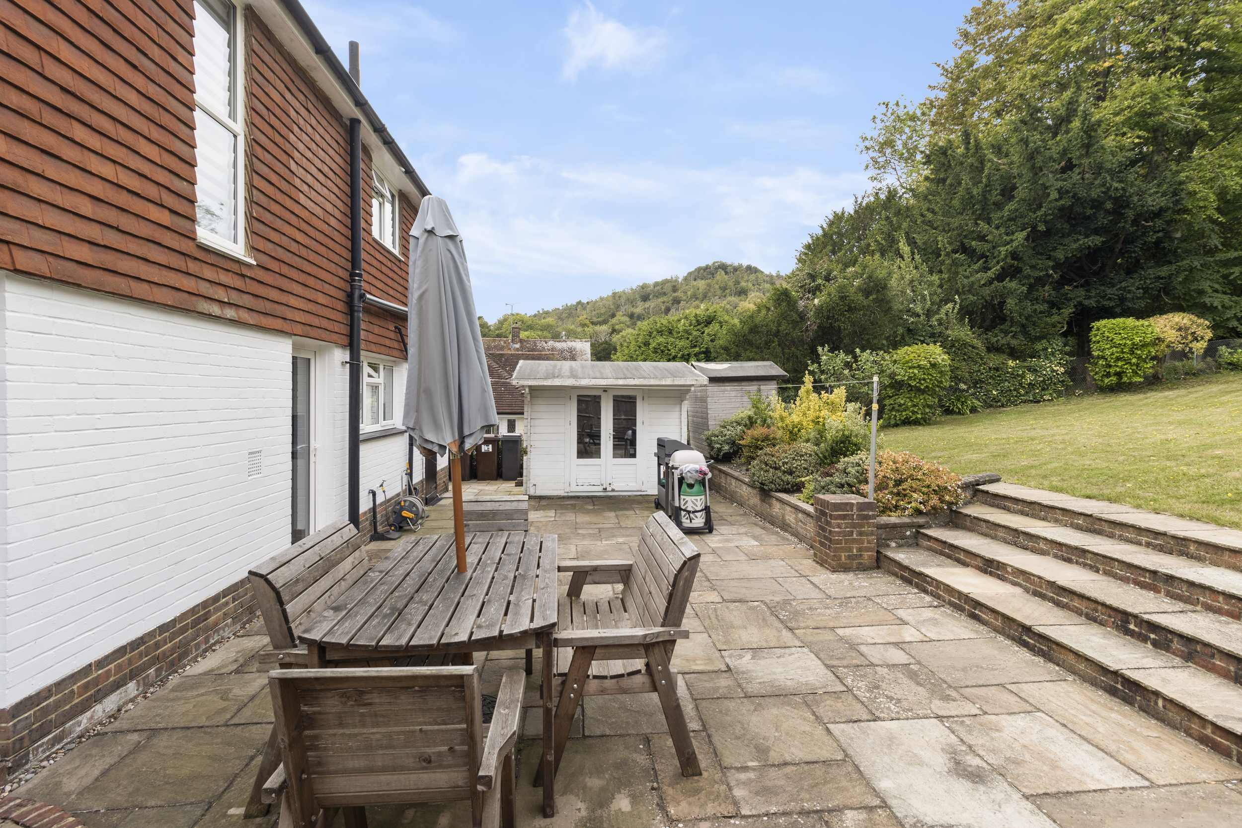 The rear garden is a true highlight of the home, featuring a spacious sandstone patio adjoining the property, perfect for outdoor dining and entertaining. Beyond, a generous expanse of lawn is framed by mature trees, creating a peaceful and private setting while offering a blank canvas for the new owners to design their dream garden.