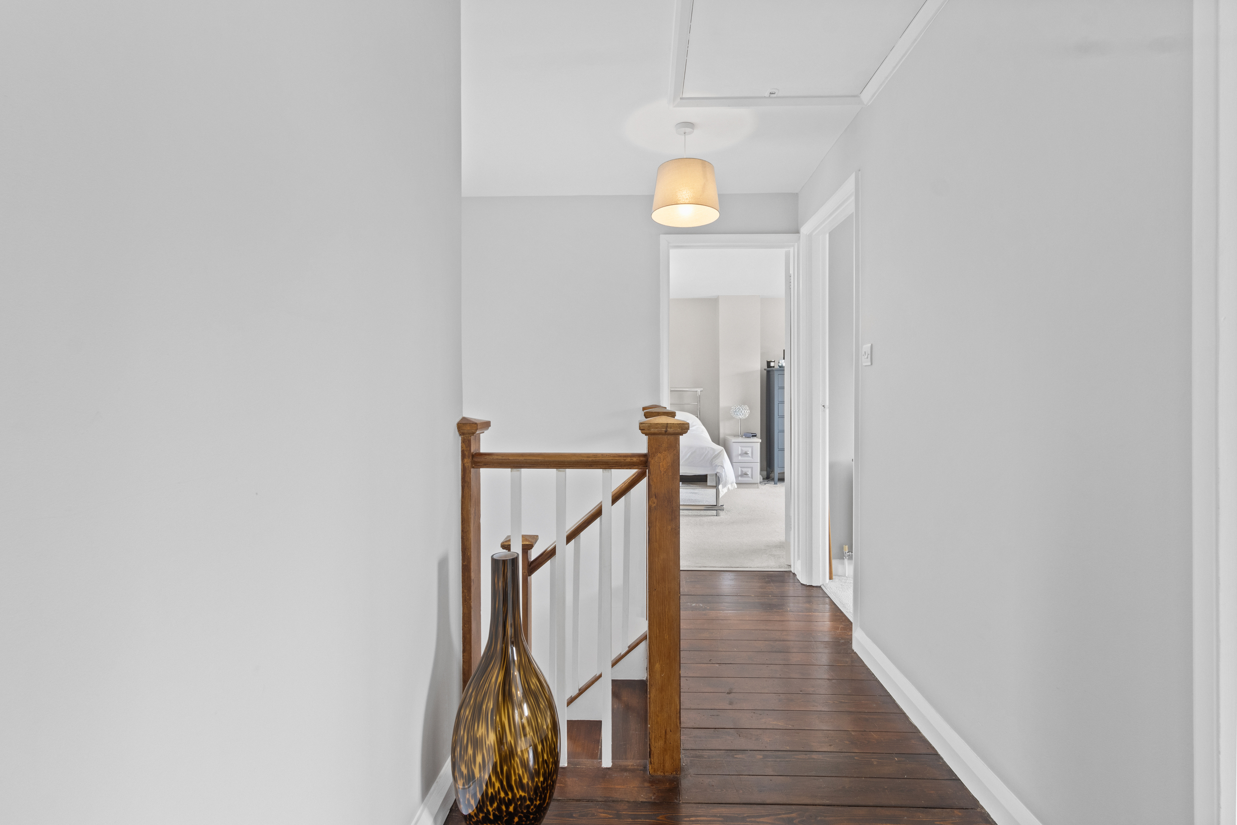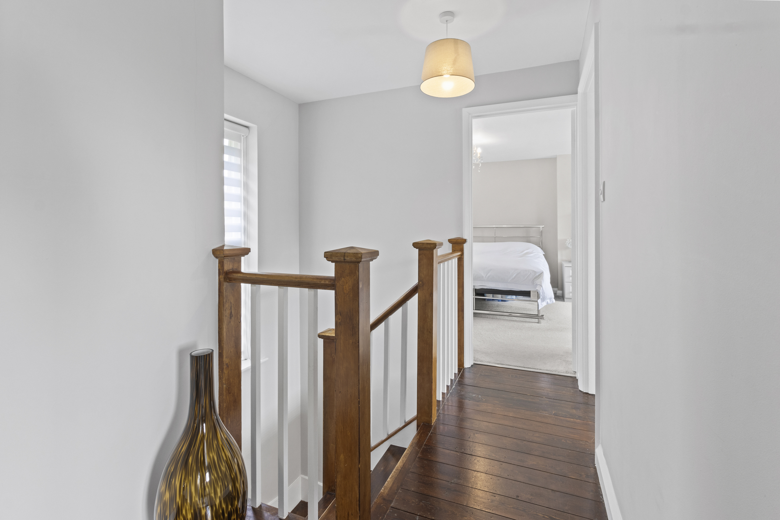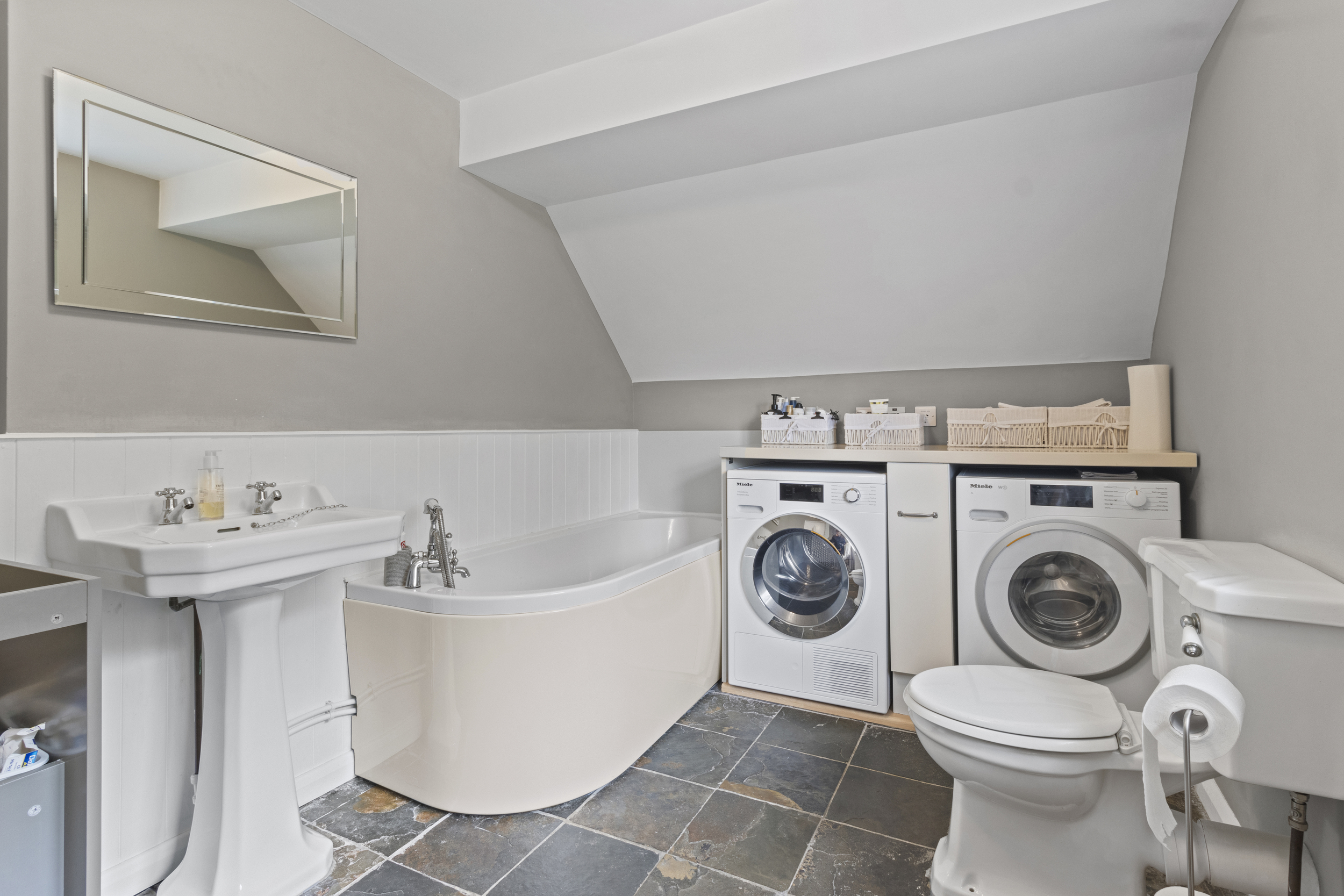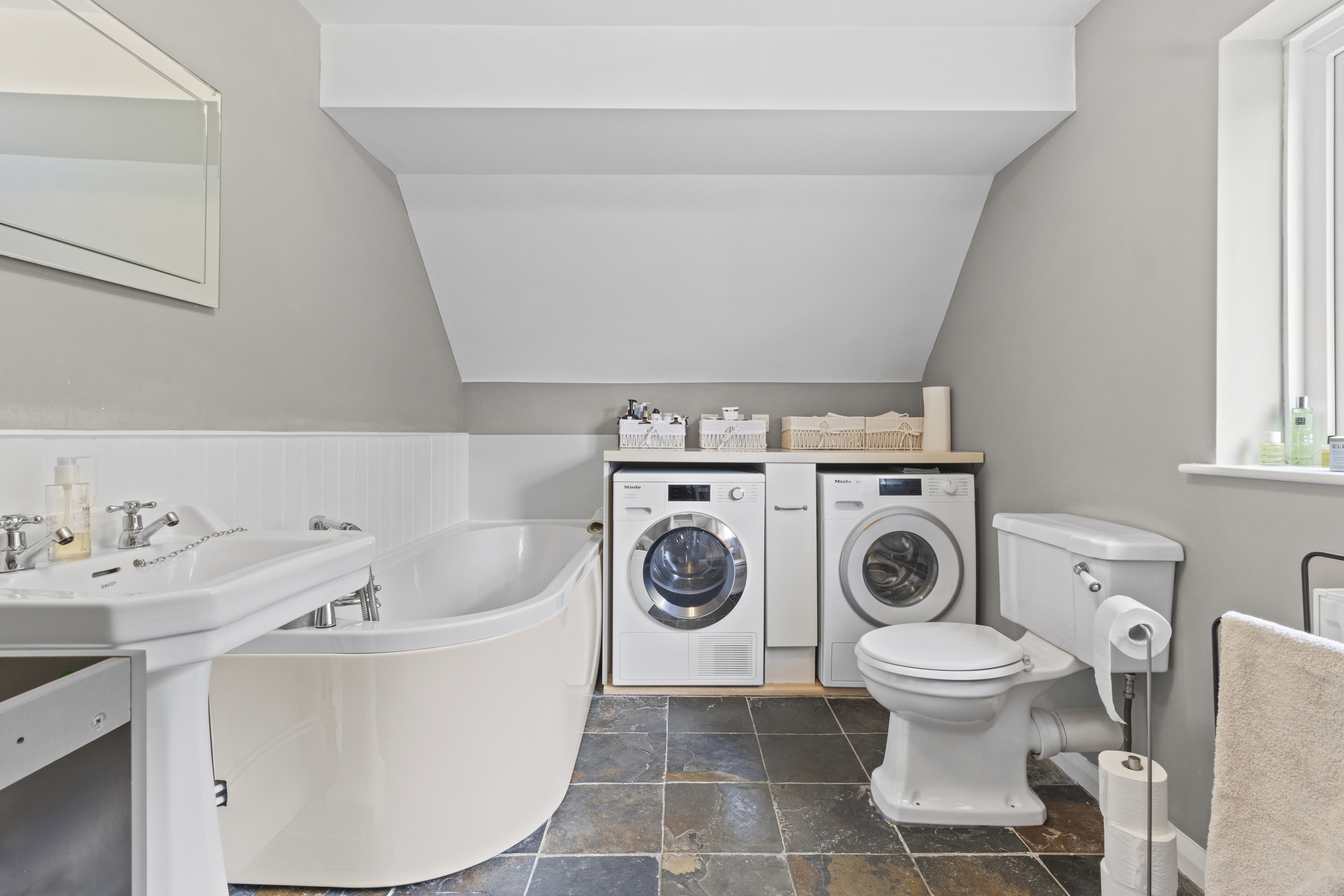 The first floor continues to impress with three generously proportioned bedrooms. Bedroom one is a bright and airy double-aspect room with views across both the front and rear, while bedroom two benefits from a private walk-in dressing area. Bedroom three is also well-sized and ideal as a child’s room, home office, or guest bedroom. The beautifully presented family bathroom includes a panel-enclosed bath and a separate walk-in shower, alongside a cleverly incorporated utility area with space for both a washing machine and tumble dryer beneath a fitted work surface.