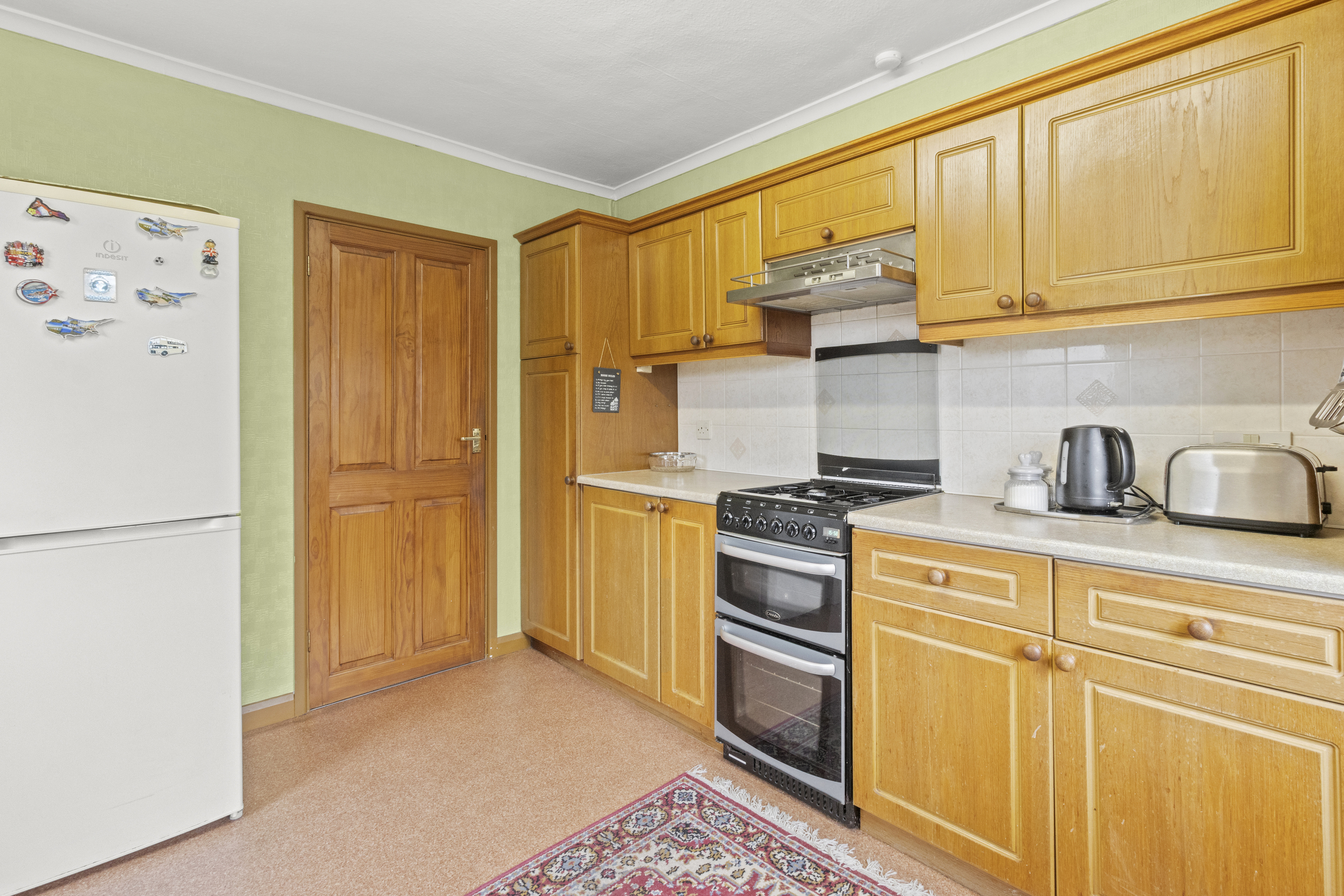 The kitchen is fitted with a comprehensive range of wall-mounted and base units, complemented by ample work surfaces. There is space provided for freestanding appliances including a cooker, fridge freezer, washing machine, and tumble dryer. There is a window overlooking the garden, while a rear door provides additional access outside. With space for a small breakfast table, this kitchen is both functional and sociable.