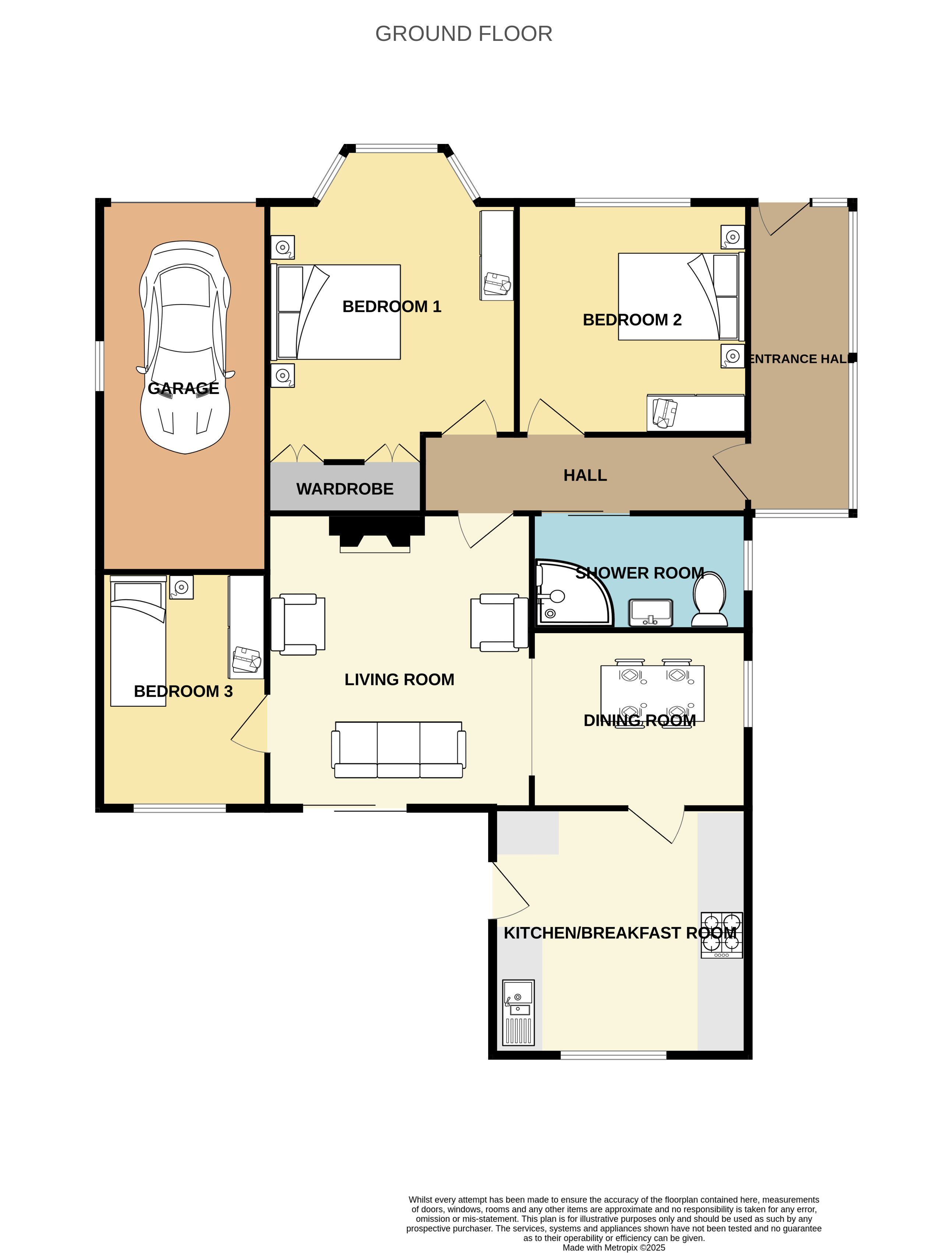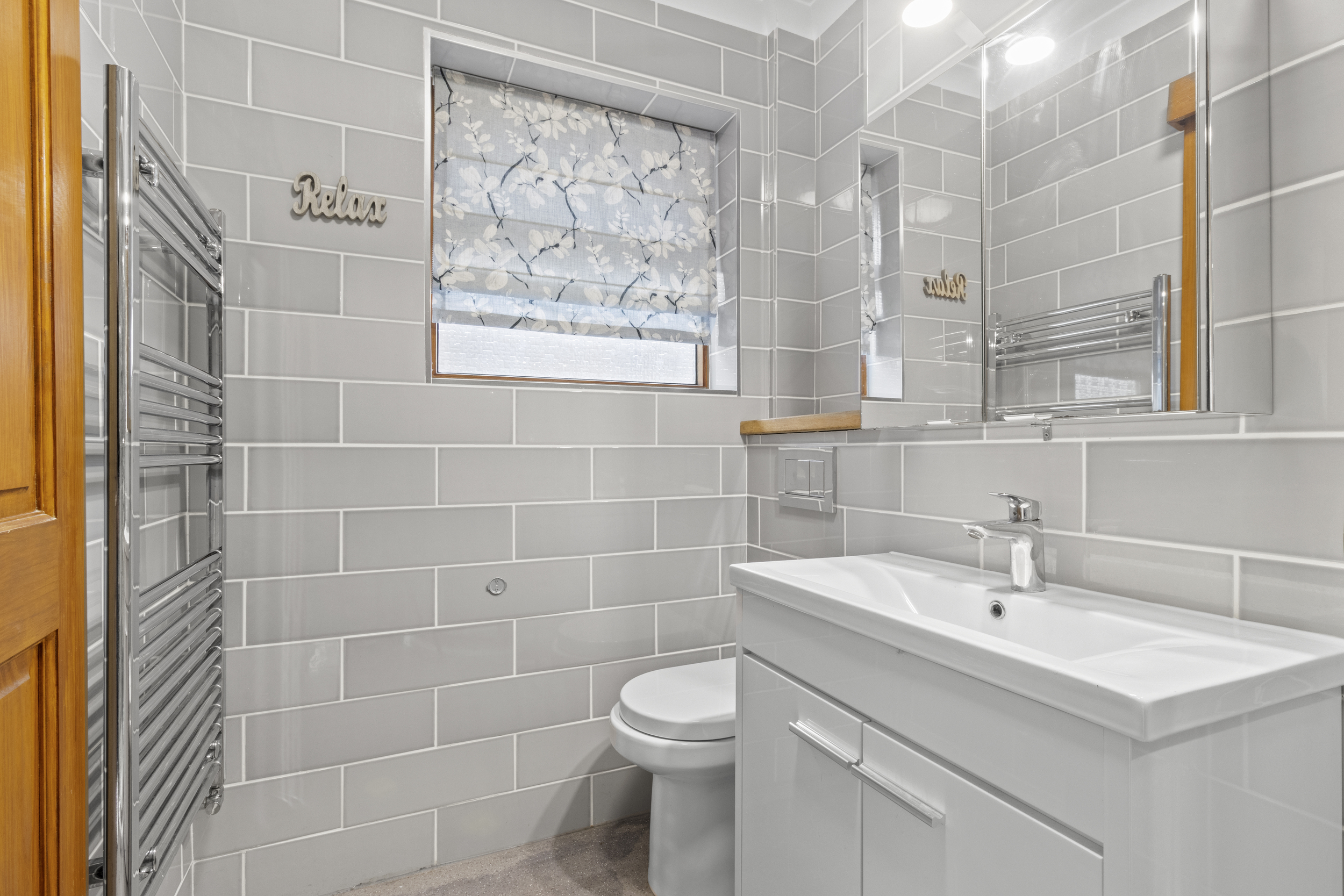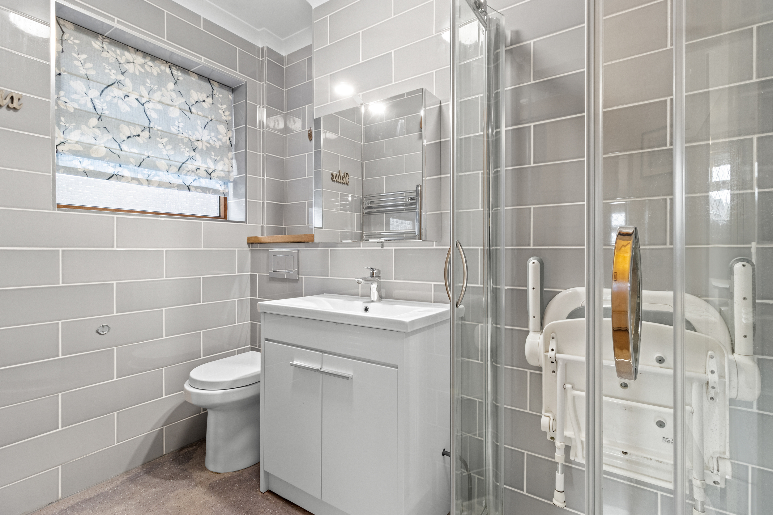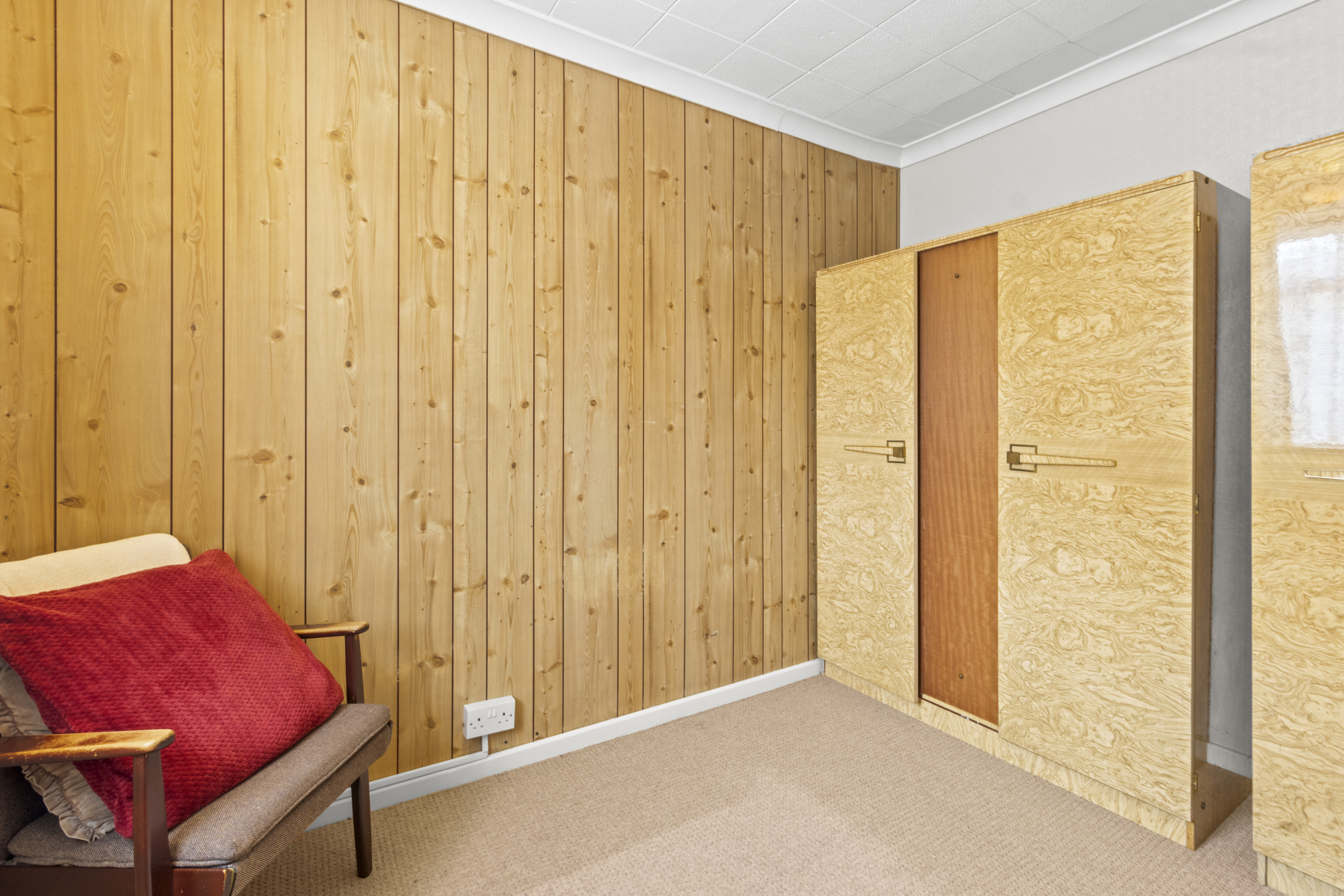 The bungalow offers three well-proportioned bedrooms. Bedroom one is front-facing, enhanced by a bay window and fitted wardrobes. Bedroom two is front facing, whilst bedroom three is accessed via the living area and provides flexible accommodation, equally suited as a bedroom, home office, or hobby room.