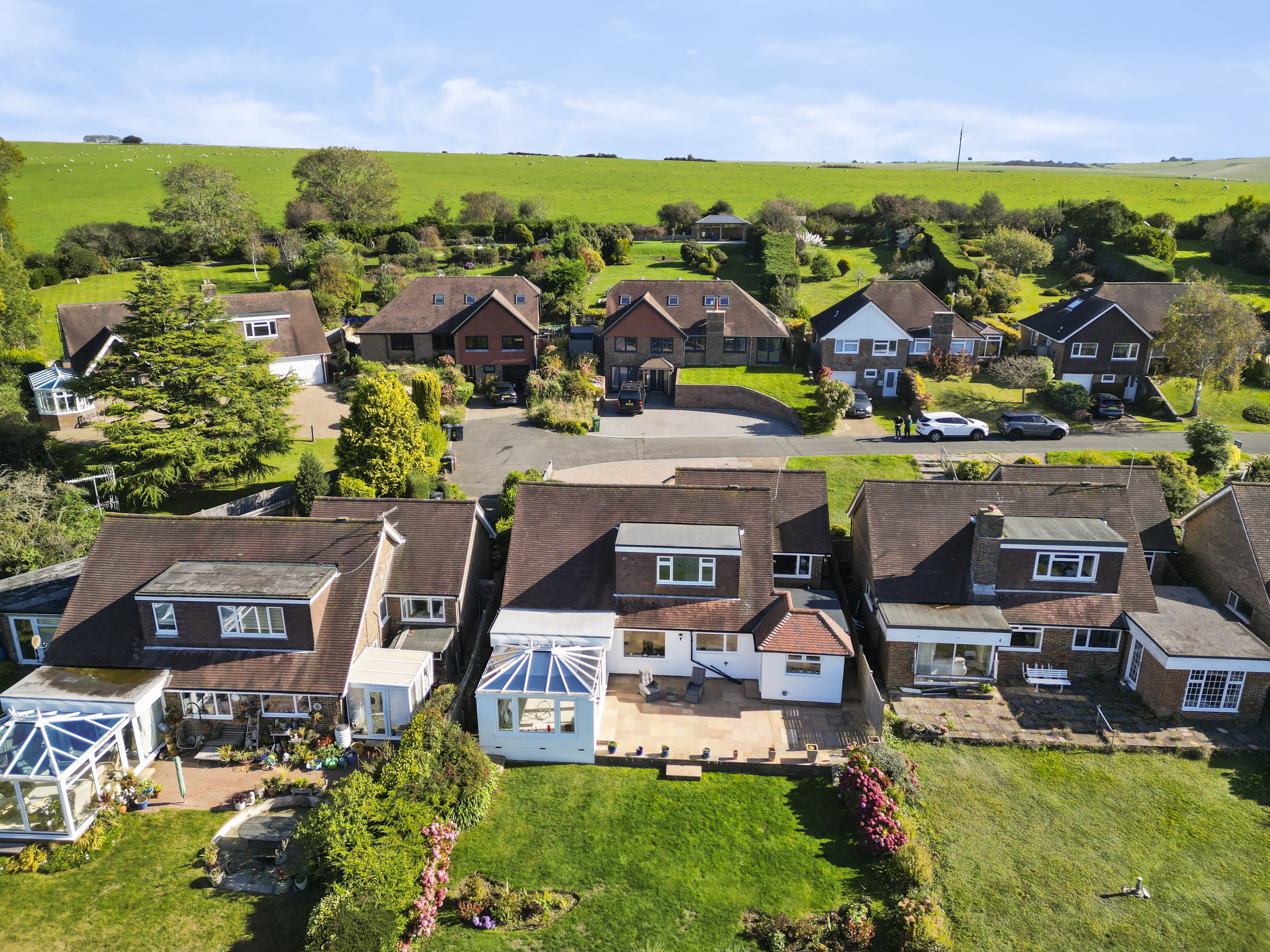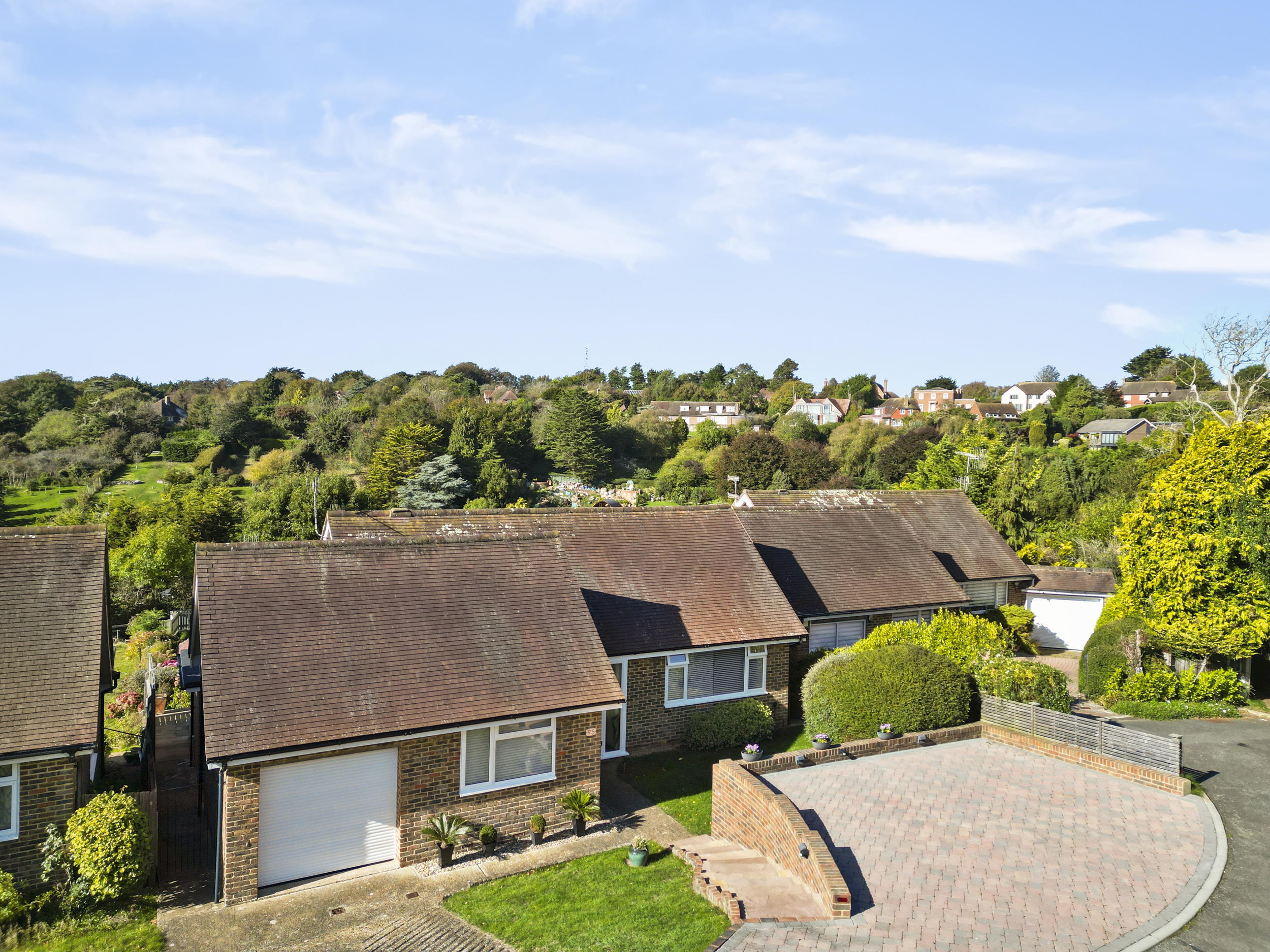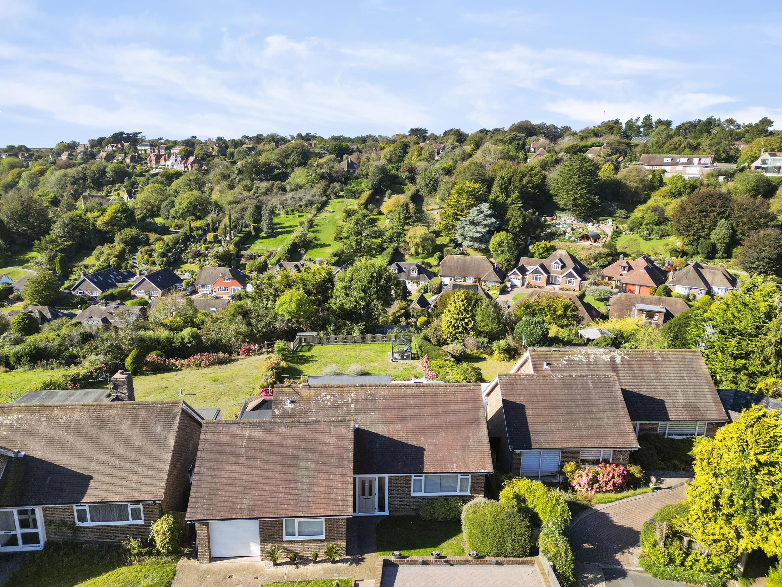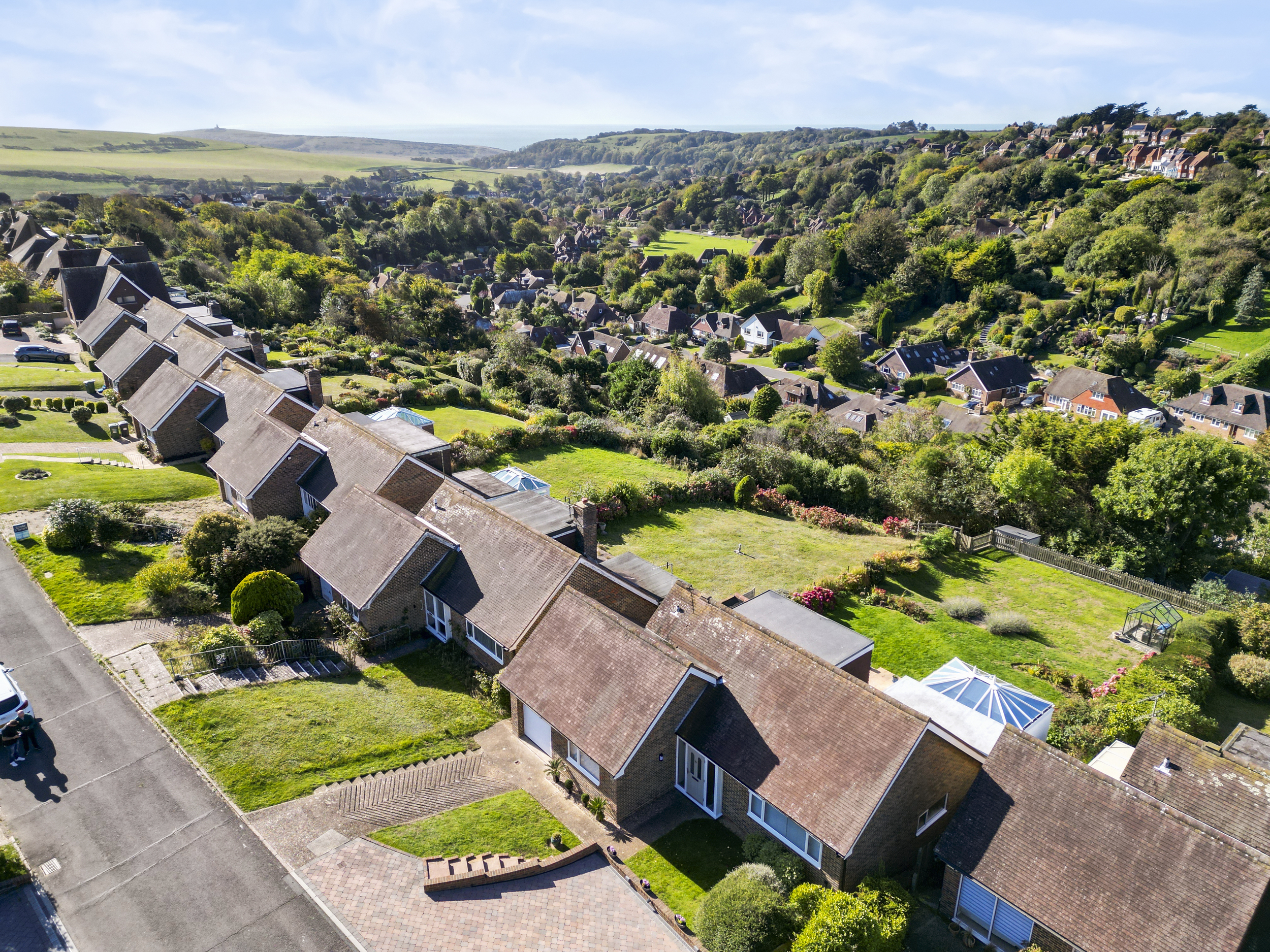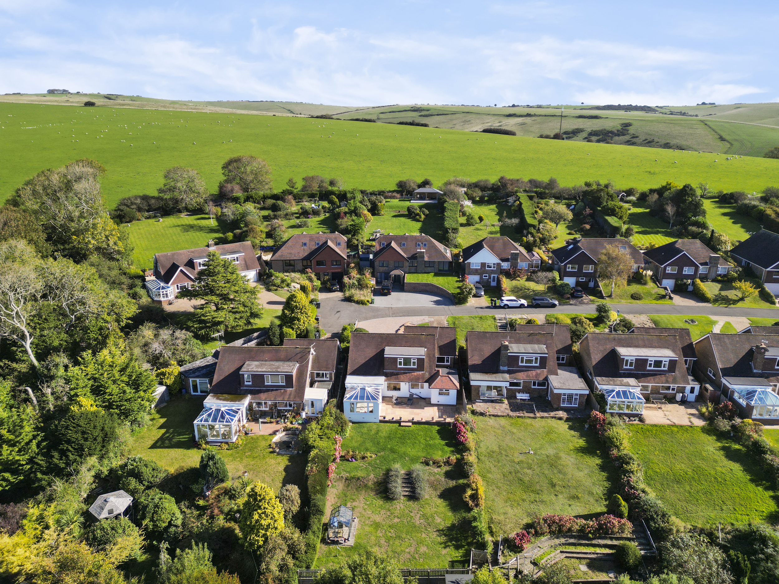 Enviably located on the south-westerly side of Michel Dene Road, the property occupies one of the finest plots in the area — a position that captures stunning elevated views across the surrounding downland countryside and offers glimpses of the sea beyond. The home’s southerly aspect ensures an abundance of natural light throughout the day, while its level rear garden makes it particularly appealing — a rarity in this elevated coastal setting.