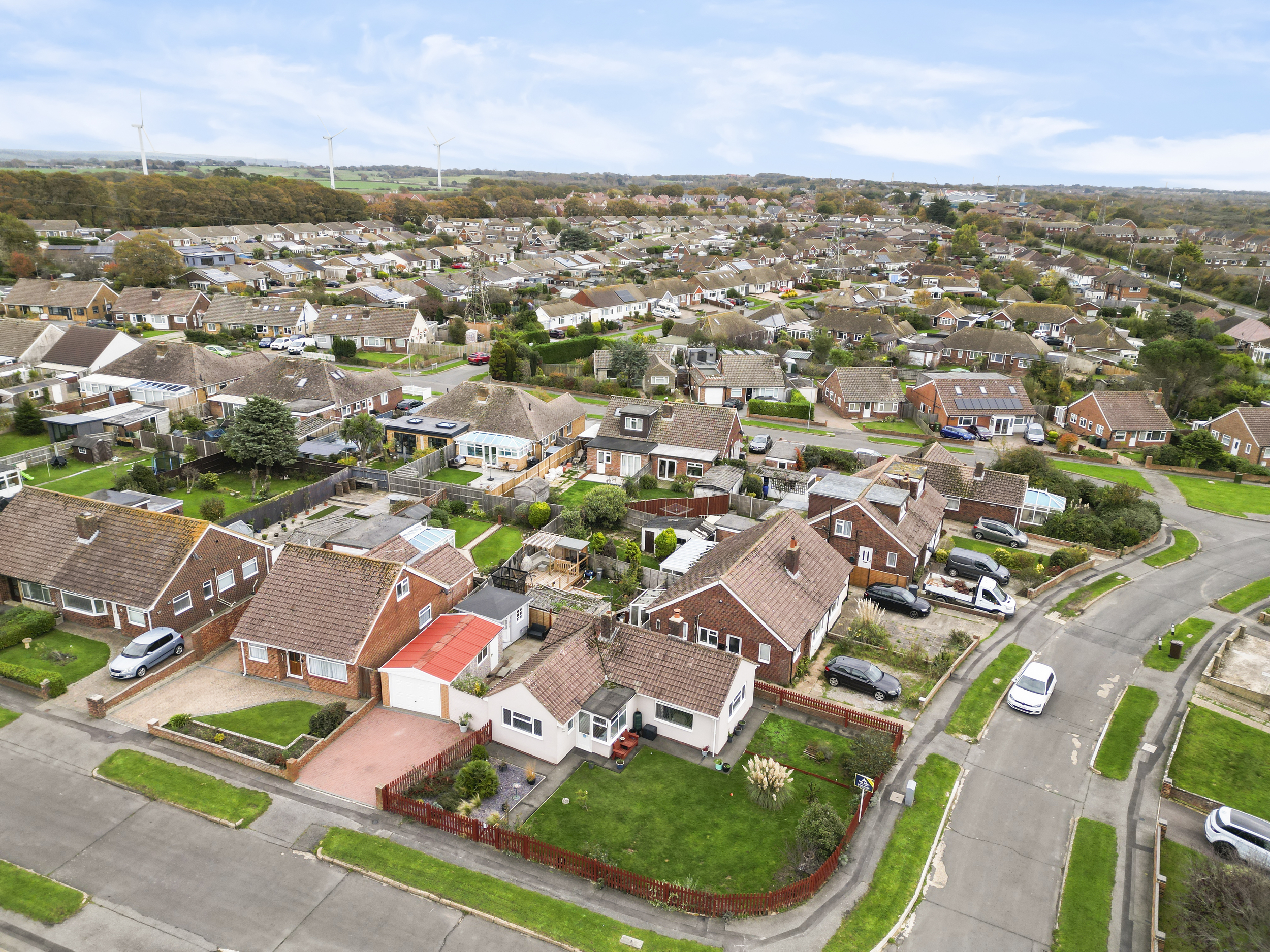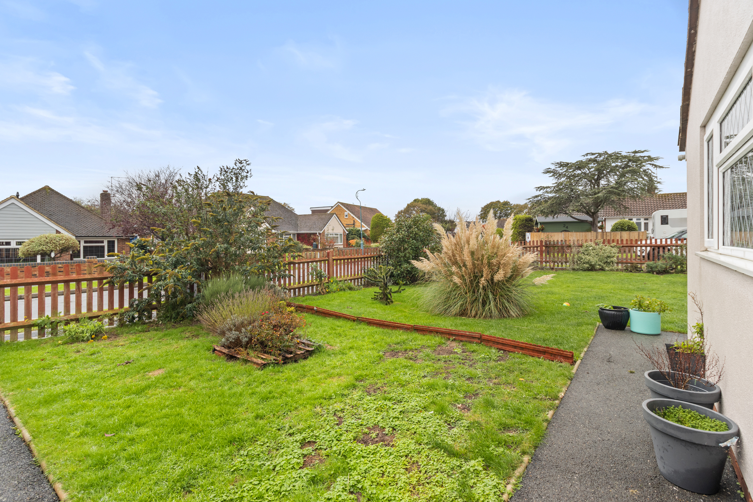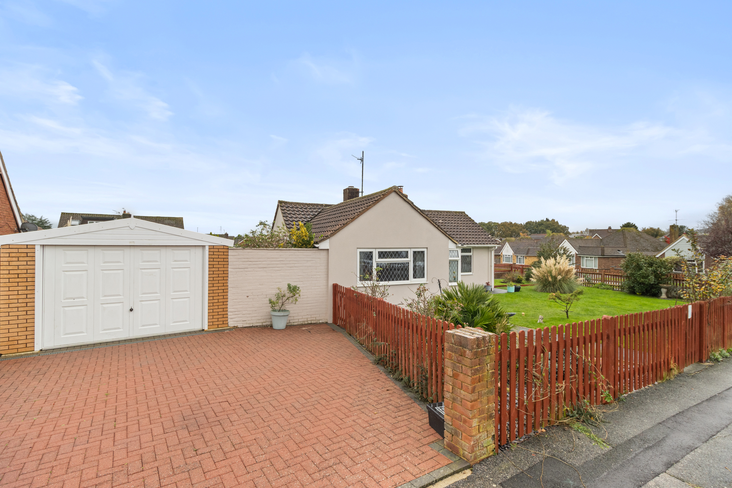 One of the standout features of this property is its generous corner plot, offering well-maintained gardens that extend around the front and side of the bungalow. The gardens are predominantly laid to lawn and enclosed with a charming picket fence, creating an inviting and private outdoor environment.