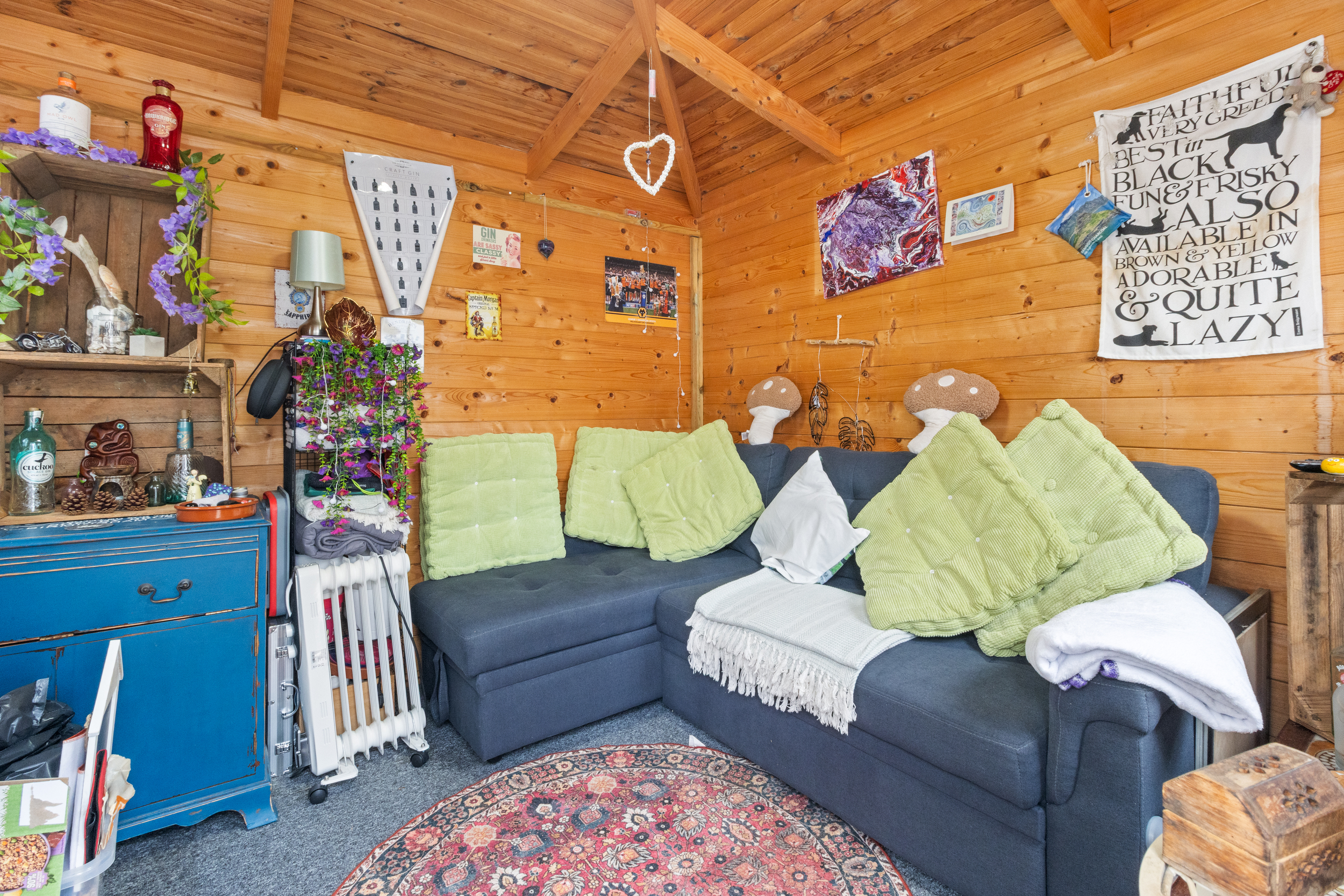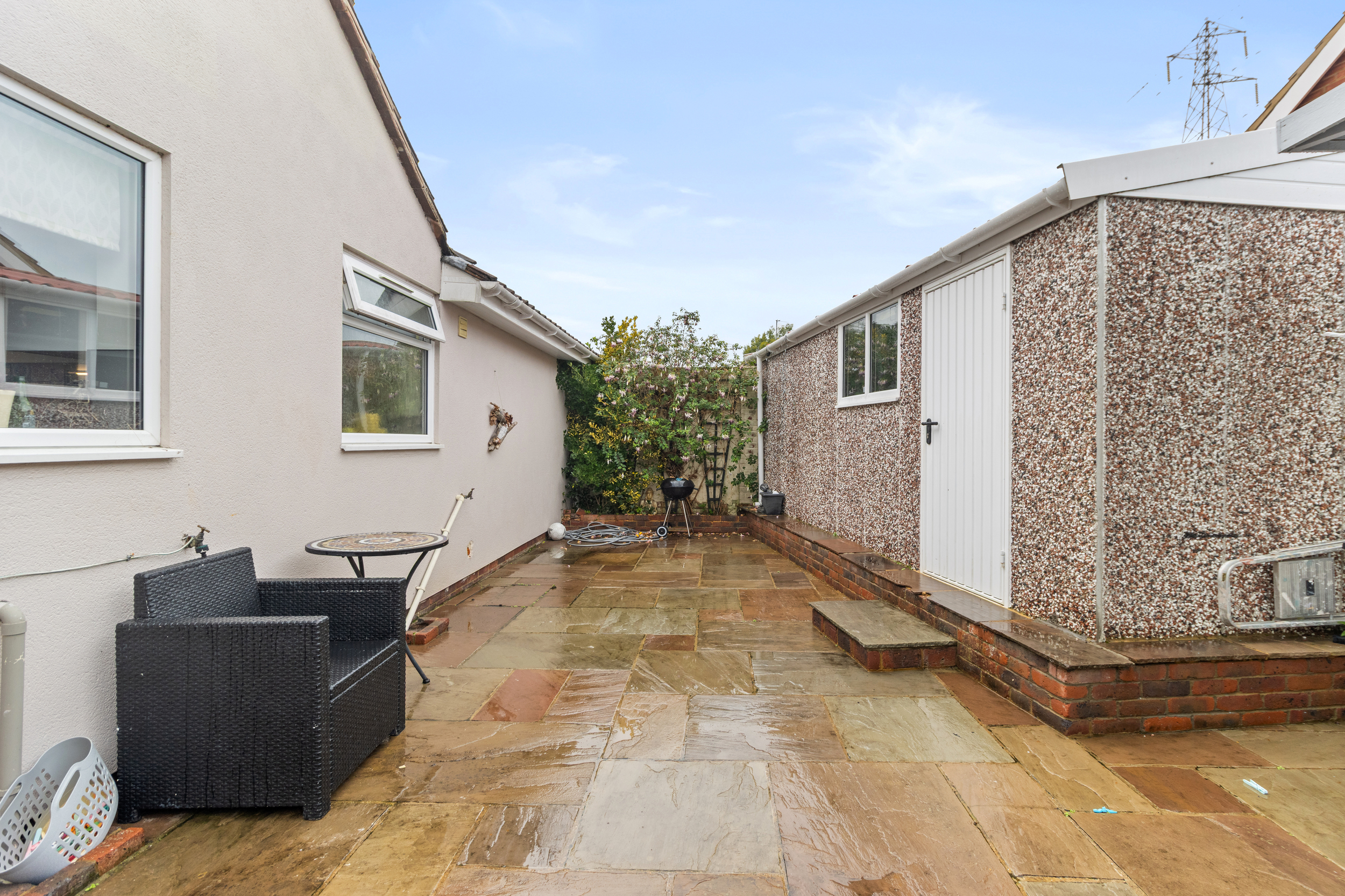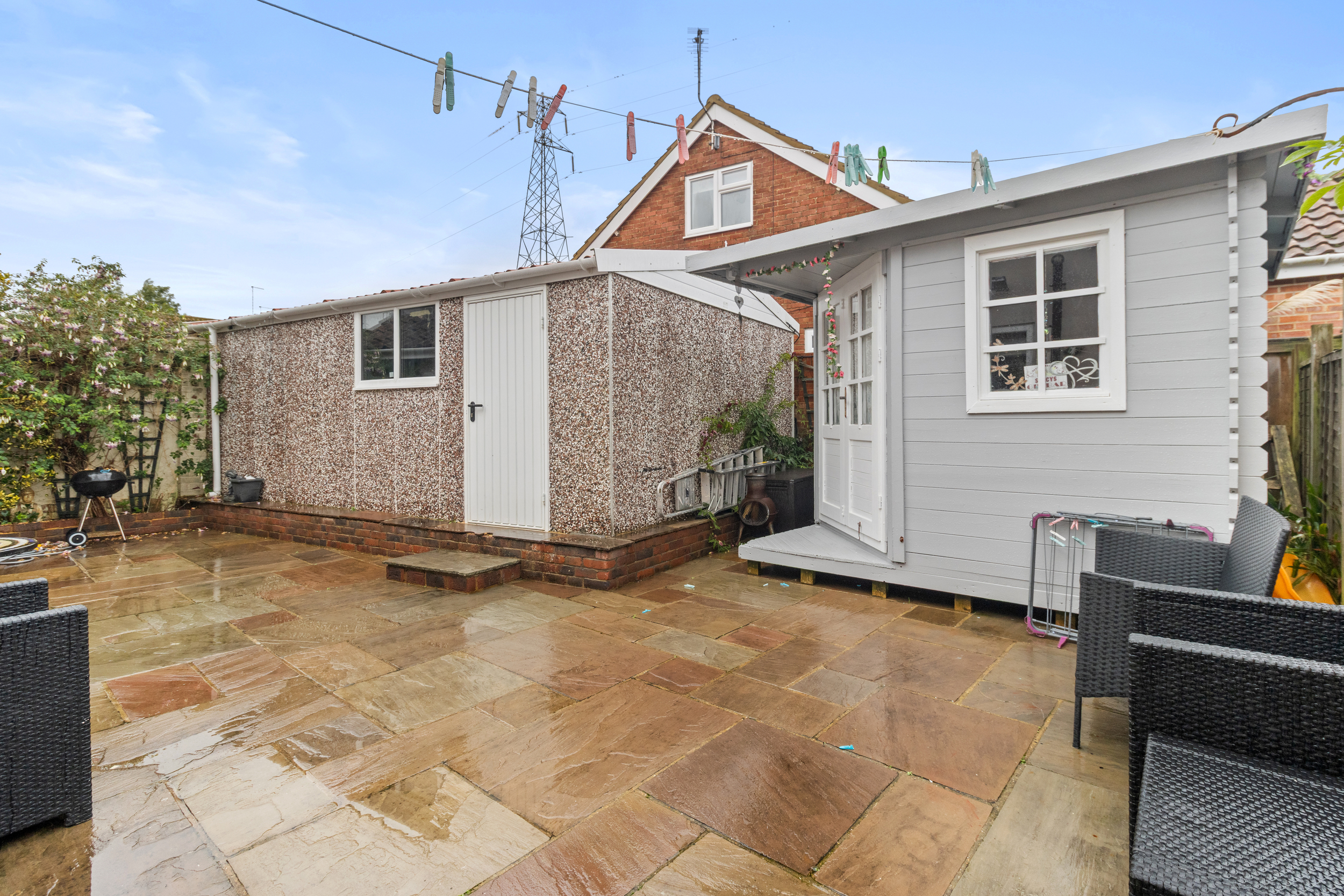 To the rear, the property enjoys a secluded patio garden, ideal for al fresco dining or simply relaxing in the sunshine. A timber summer house occupies one corner, providing a perfect retreat or additional storage space.