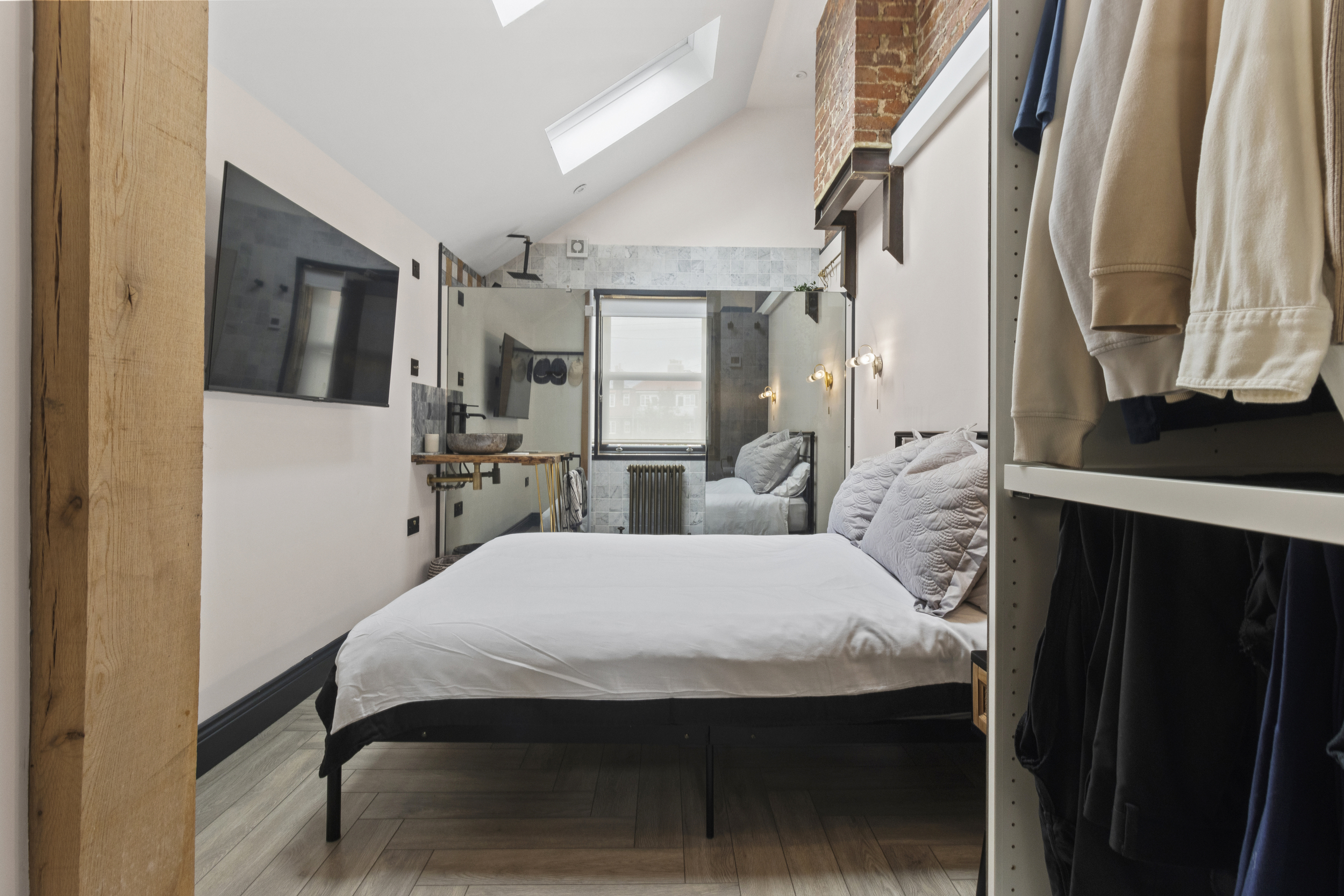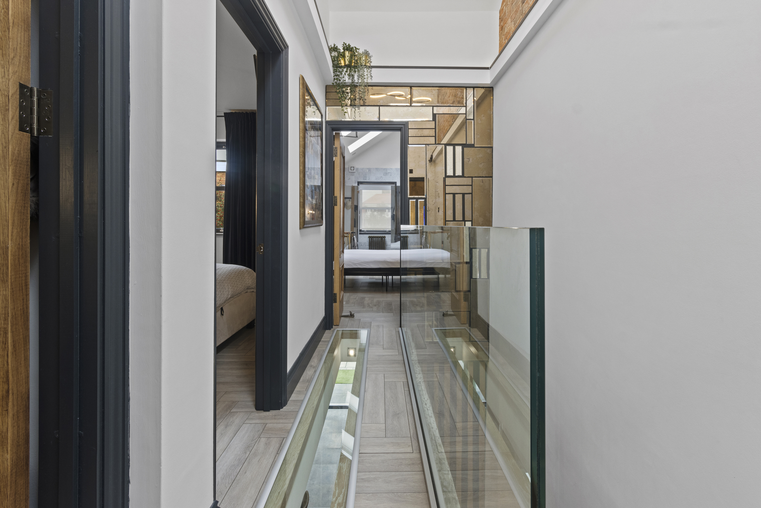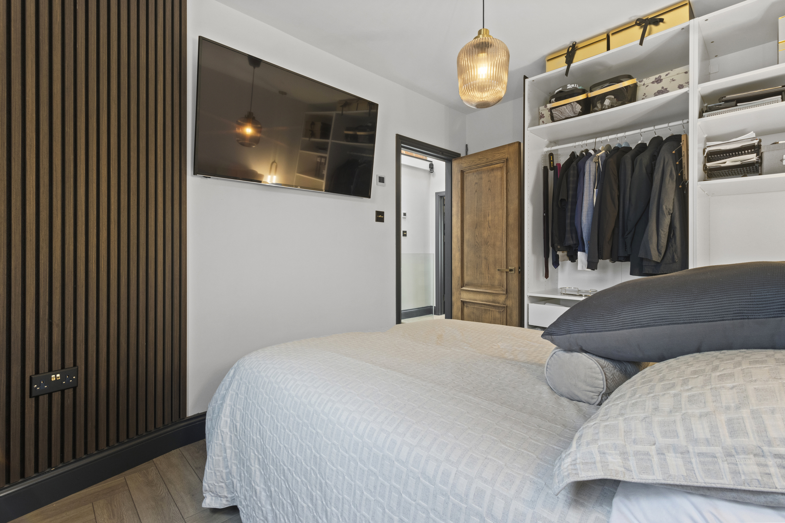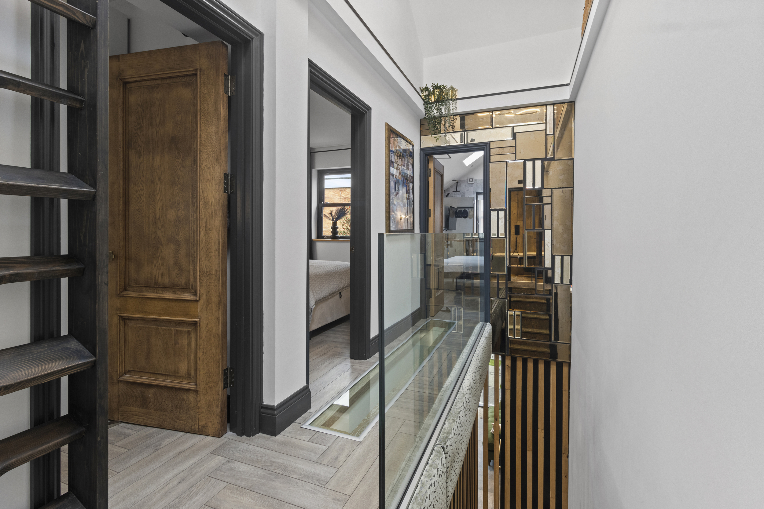 The upstairs accommodation is equally impressive, with three well-proportioned double bedrooms, each fitted with bespoke wardrobes to maximise storage and maintain a clutter-free aesthetic.