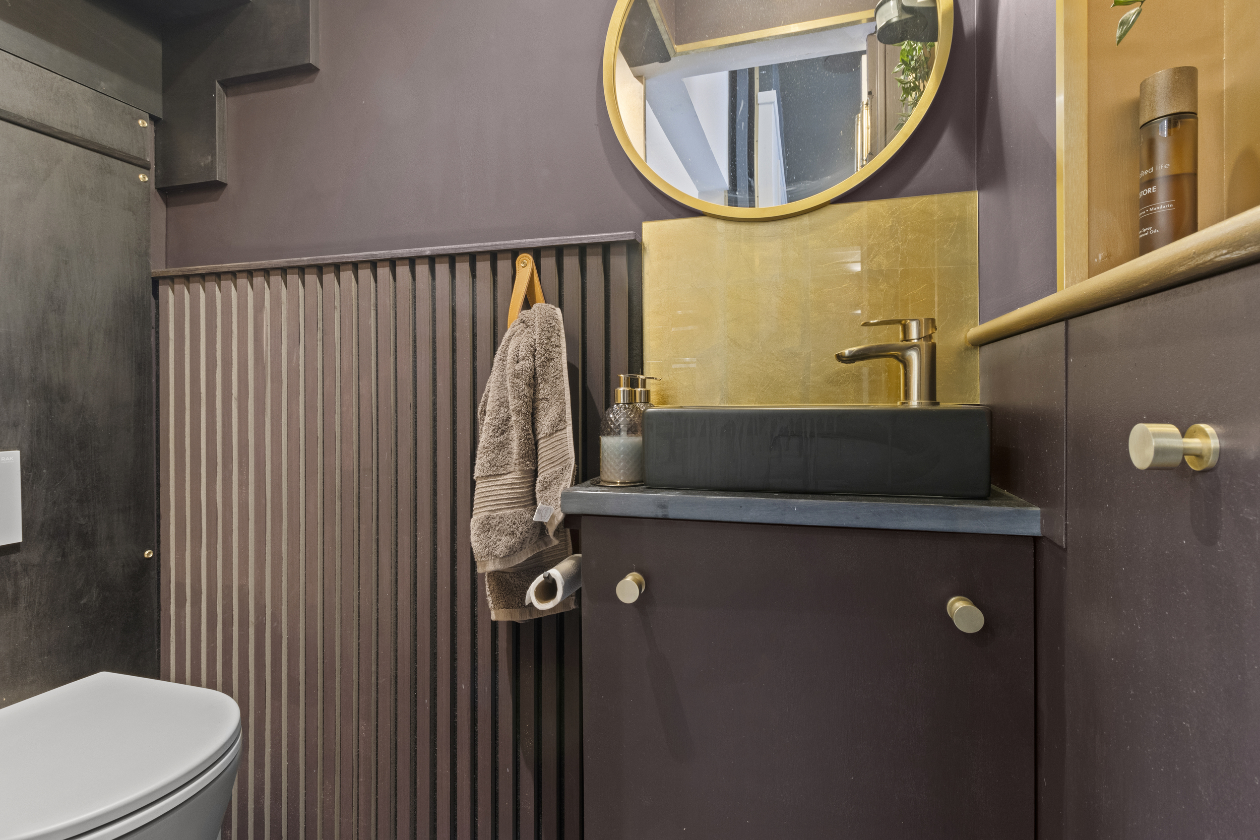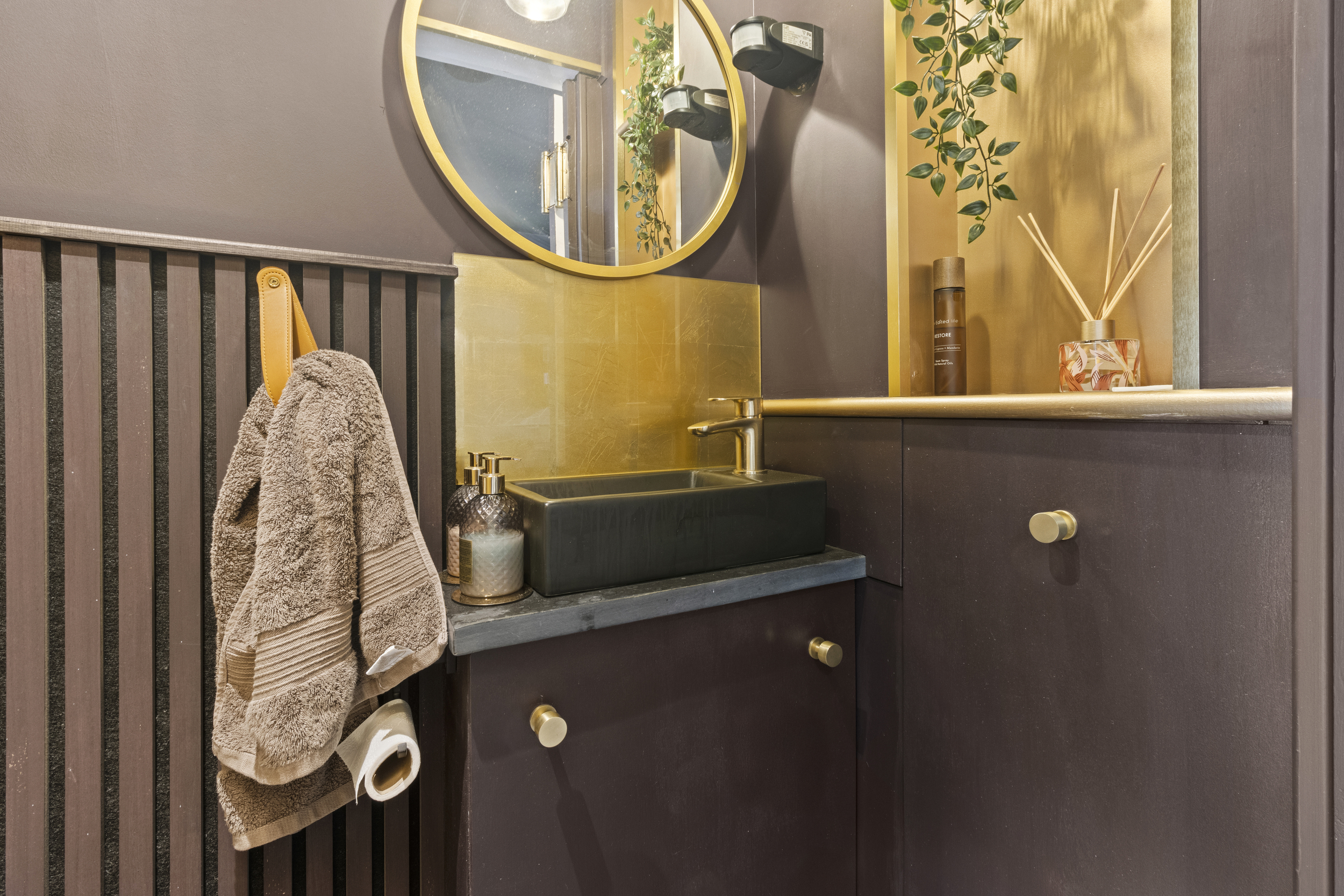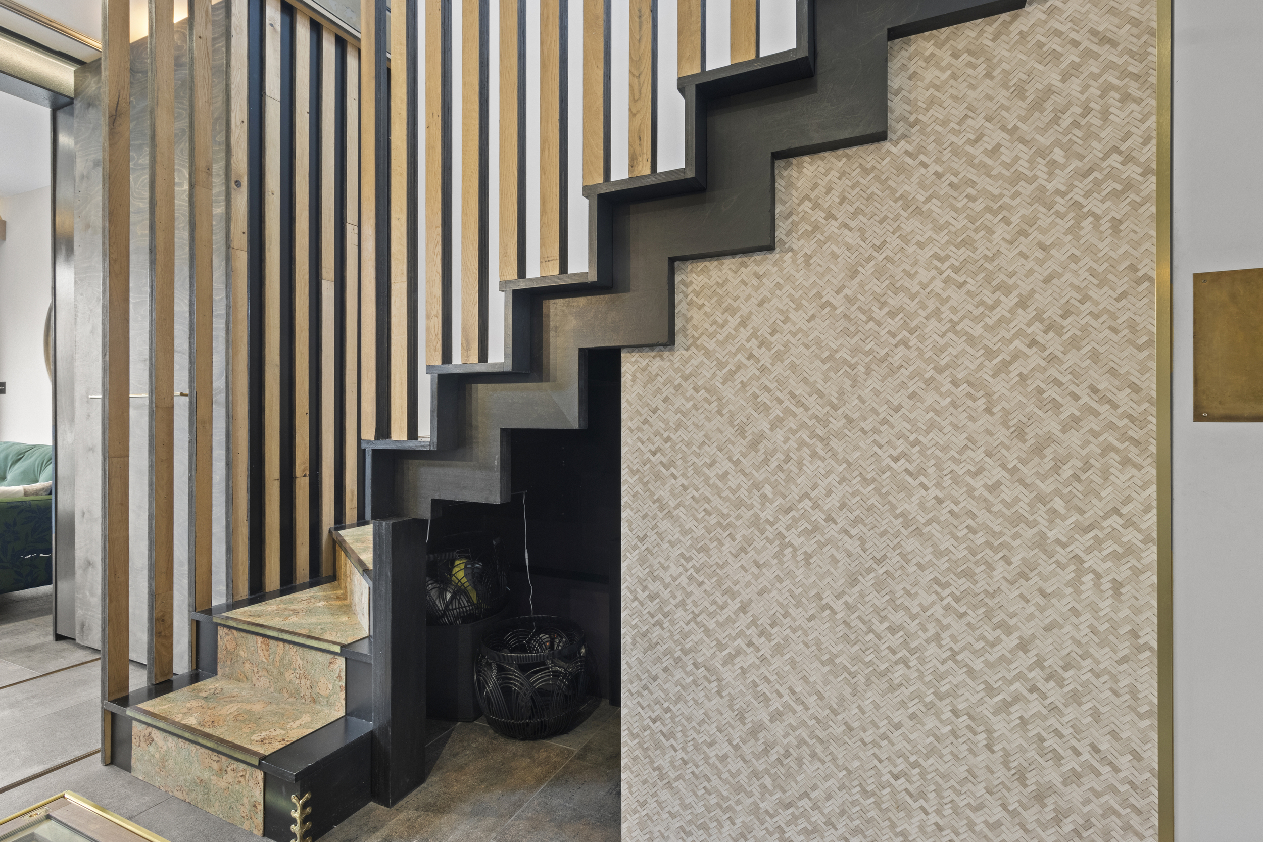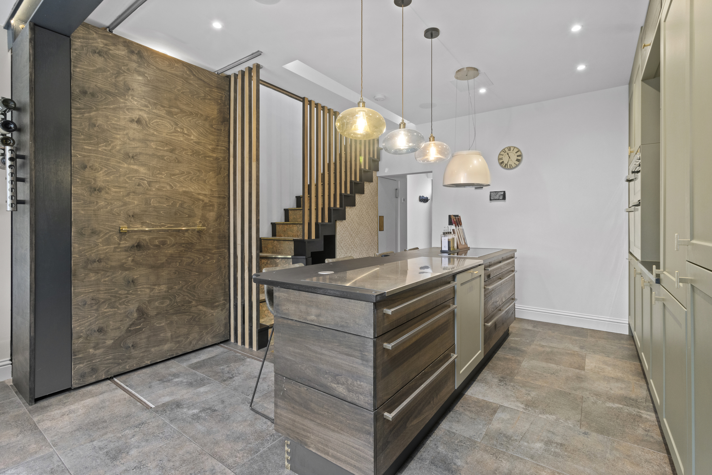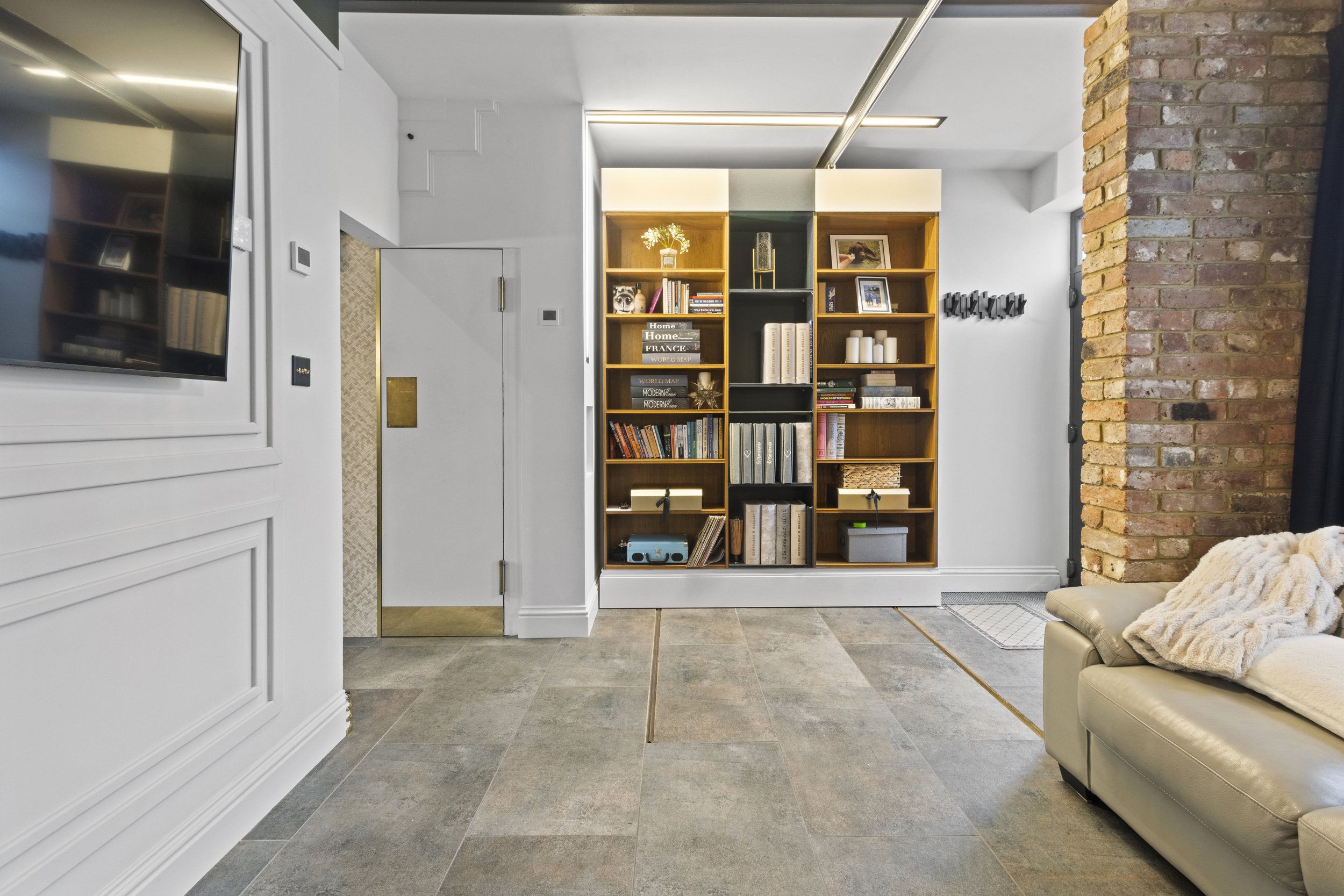 Discreetly concealed behind another moving wall is a hidden utility room, providing dedicated space for a washing machine, tumble dryer and additional cabinetry — ensuring practicality without compromising the visual appeal of the living area.