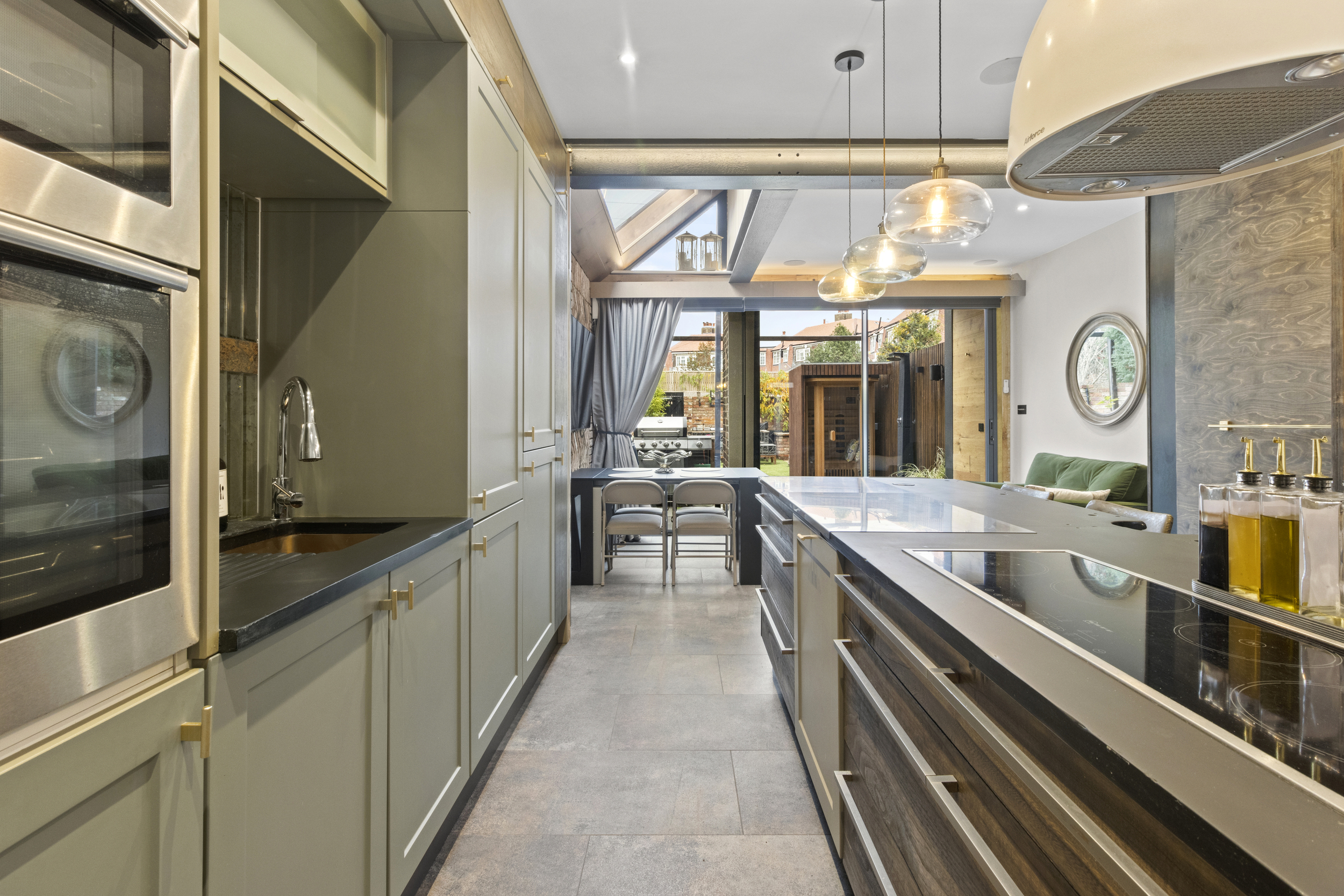 From here, the property opens into the kitchen and family room, the undisputed heart of the home. This space perfectly balances luxury and functionality, creating an environment ideal for both everyday living and social gatherings. The bespoke kitchen features floor-to-ceiling cabinetry, providing ample storage while maintaining sleek, clean lines. The specification is first class, boasting a four-ring Neff hob with an AirForce extractor hood, combining efficiency with design, two built-in ovens with grills, perfect for keen cooks and entertainers, and integrated dishwasher, fridge, and freezer, all seamlessly built in to maintain the minimalist aesthetic.