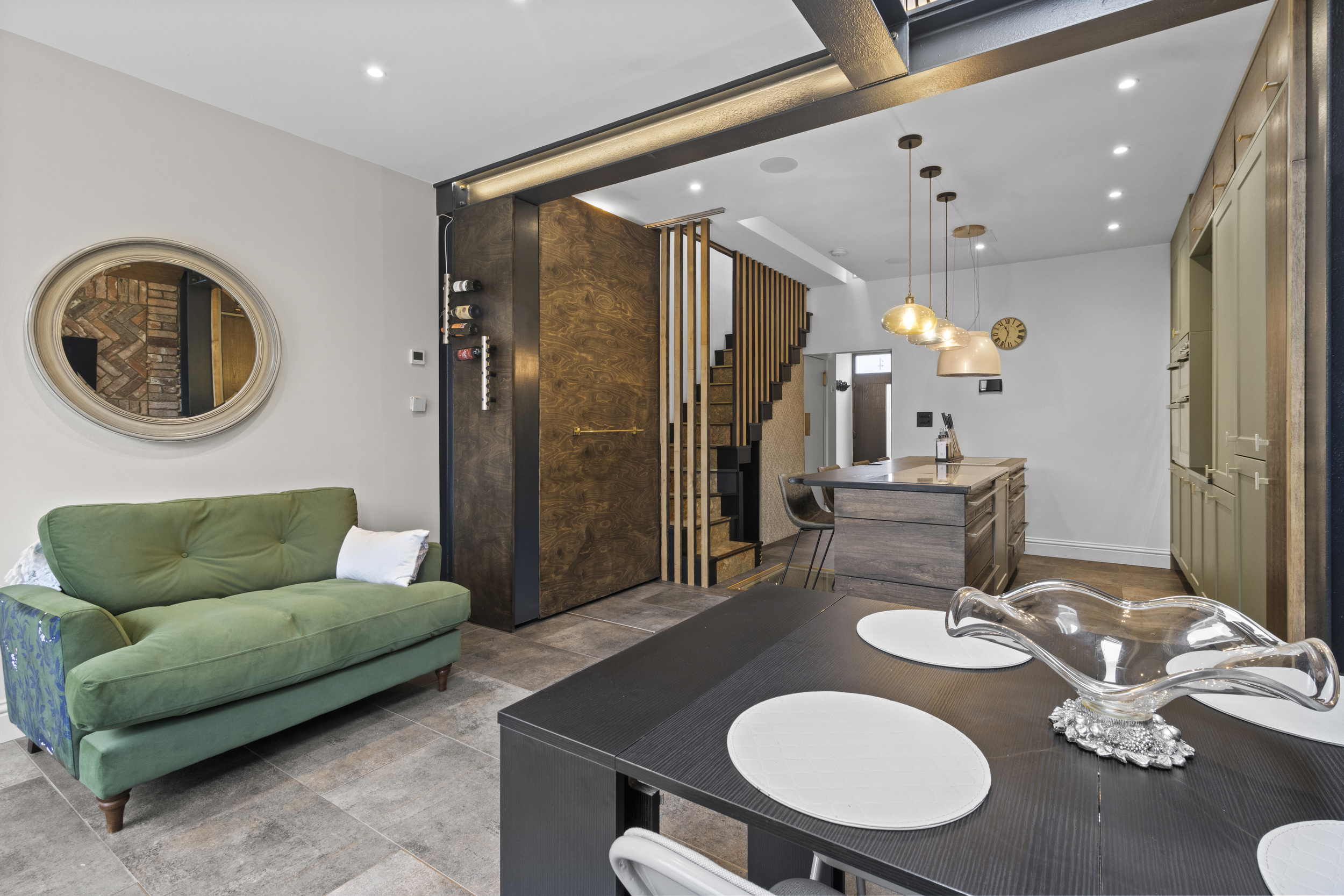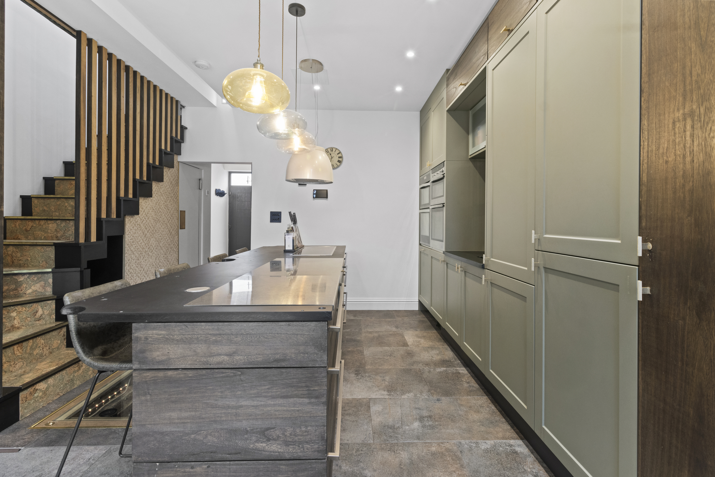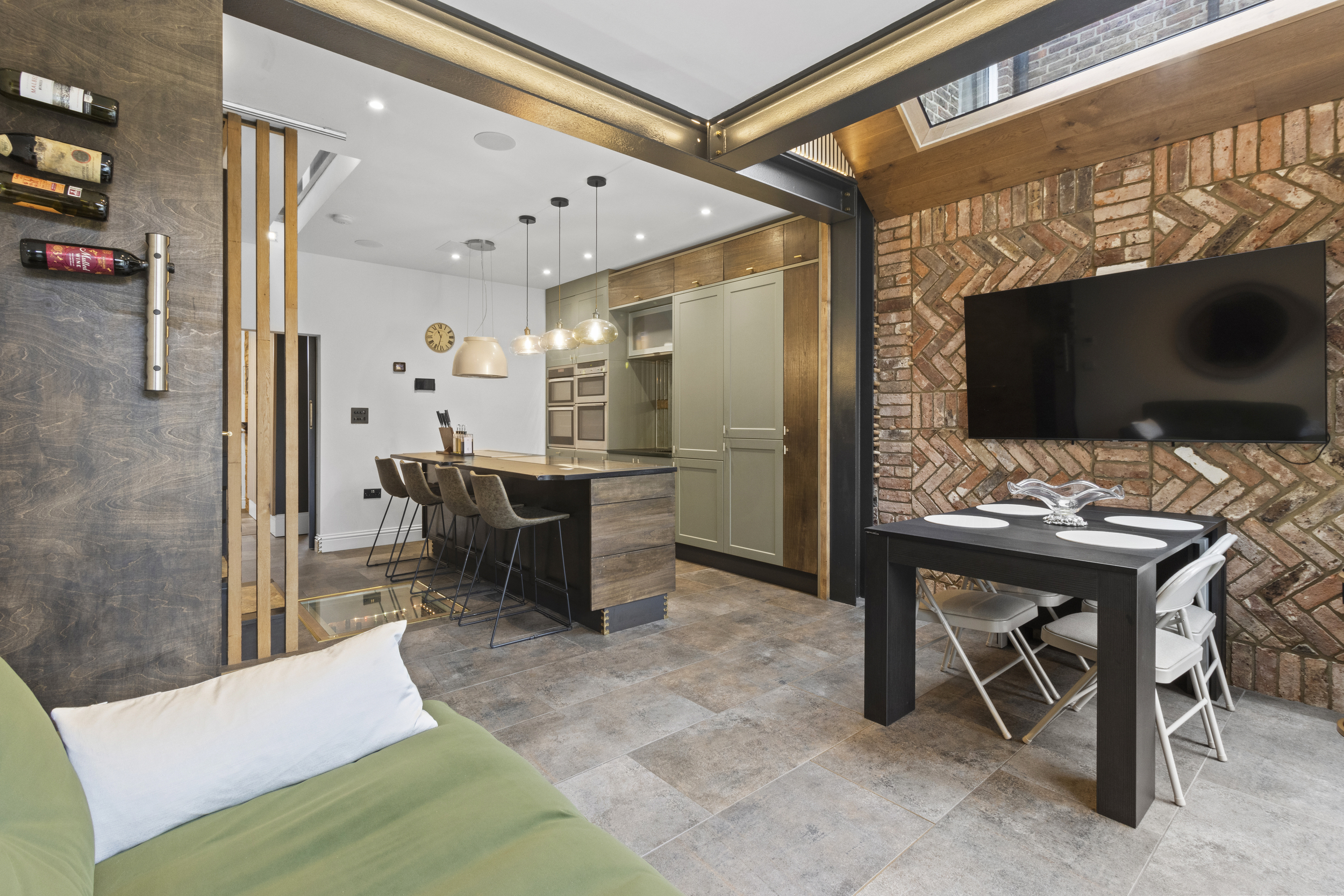 The central island forms a striking focal point, offering a generous workspace and casual dining area. Directly beneath, and visible through a toughened glass panel, lies a sunken wine cellar — a stunning and practical feature that embodies the property’s attention to detail and individuality.