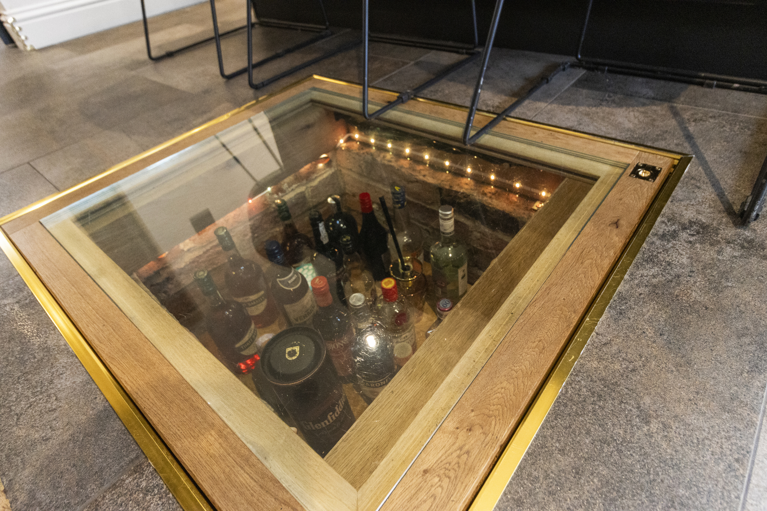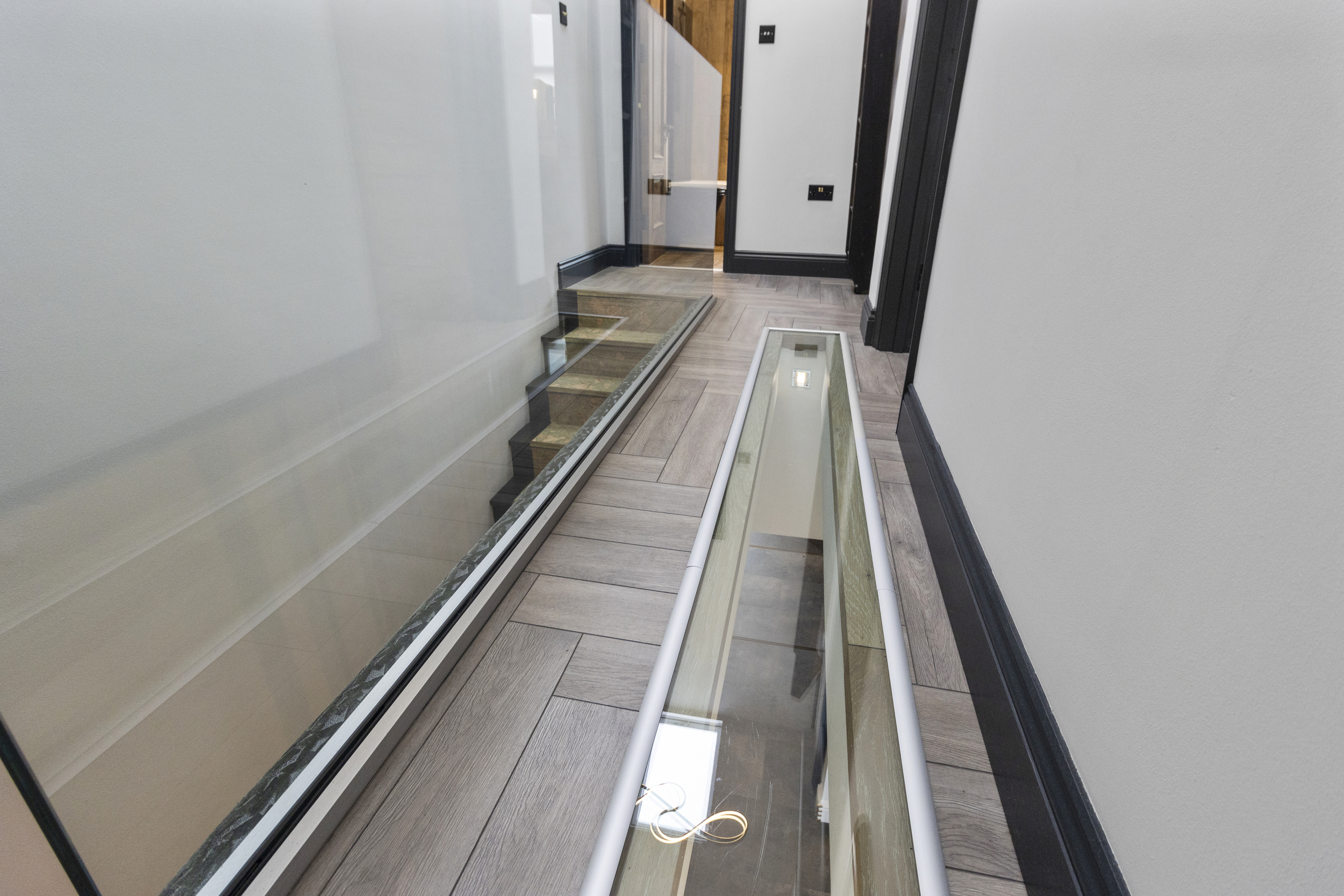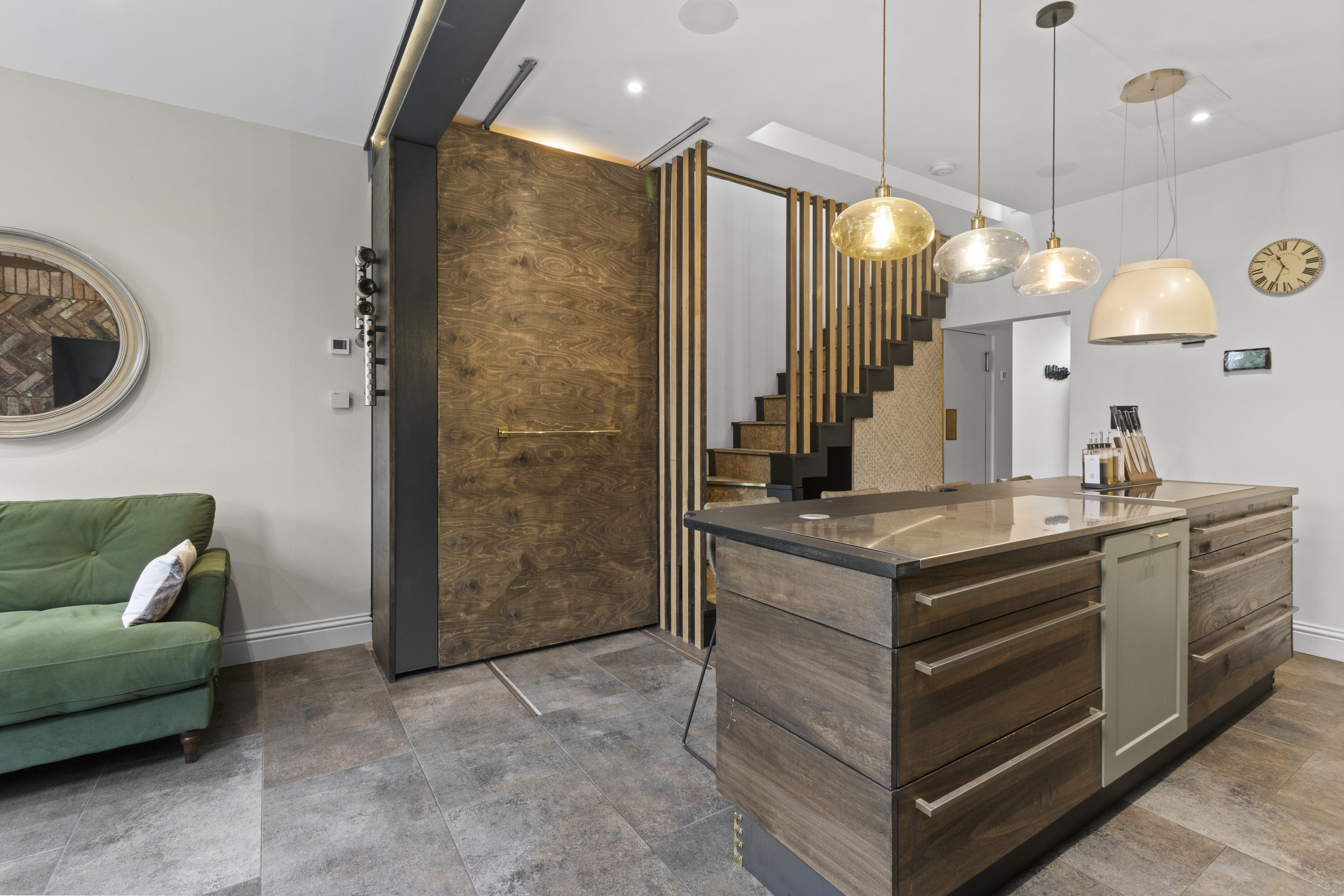 The central island forms a striking focal point, offering a generous workspace and casual dining area. Directly beneath, and visible through a toughened glass panel, lies a sunken wine cellar — a stunning and practical feature that embodies the property’s attention to detail and individuality.