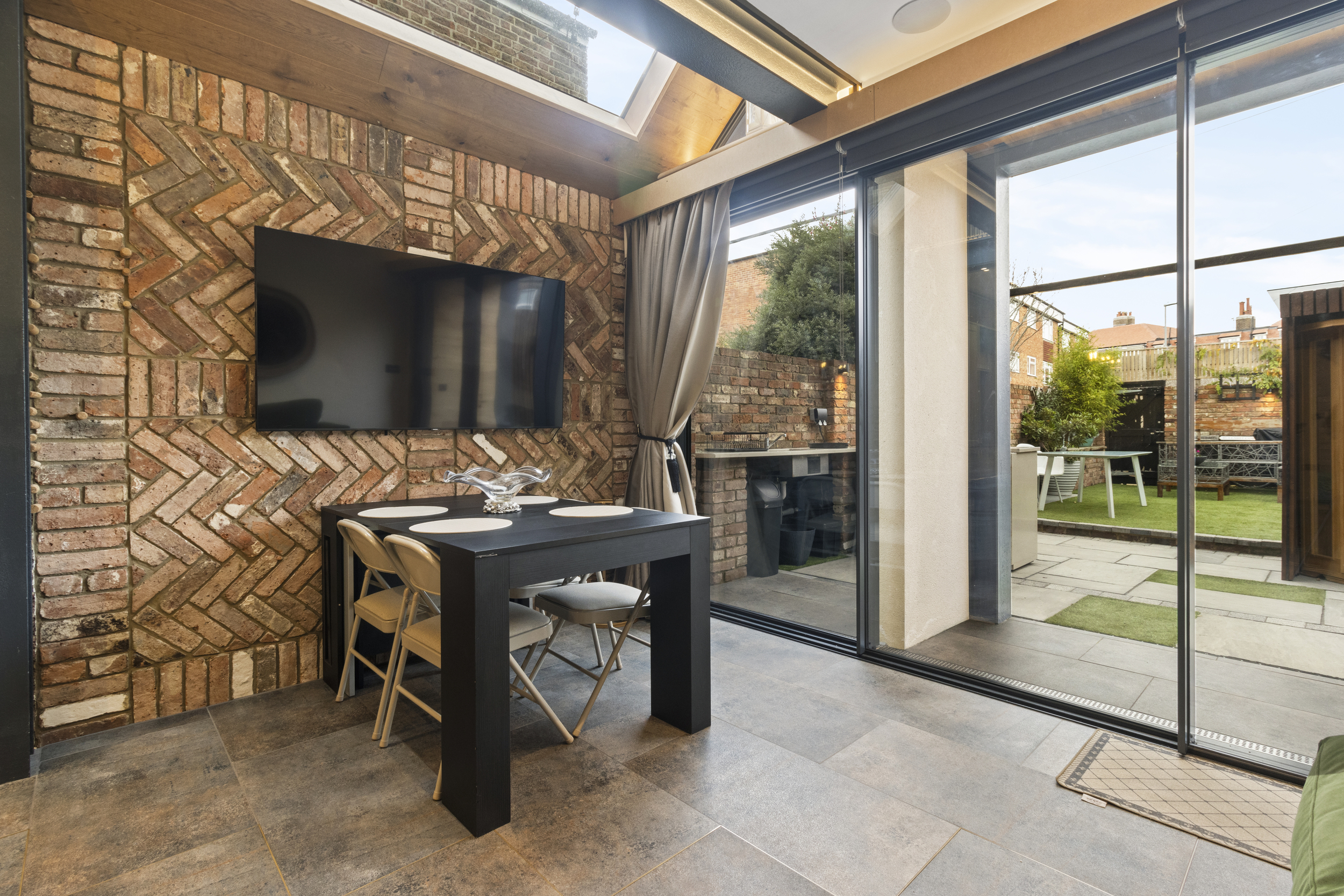 The adjoining family area is designed for comfort and character. Exposed brickwork, a vaulted ceiling with timber beams, and large sliding glass doors create a seamless blend of rustic texture and modern light. The result is a beautifully open space that flows naturally to the rear garden — perfect for relaxing, dining, or entertaining.