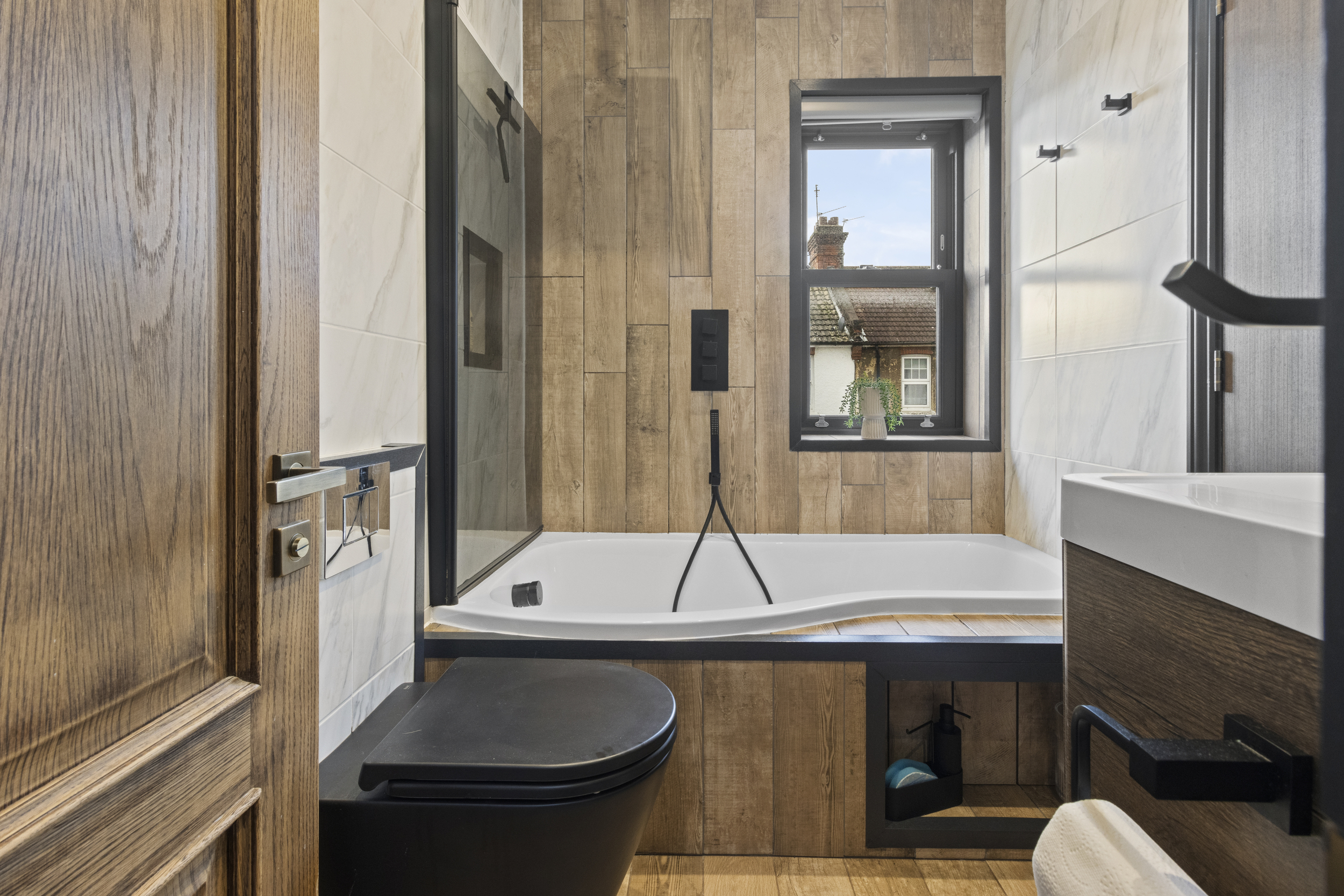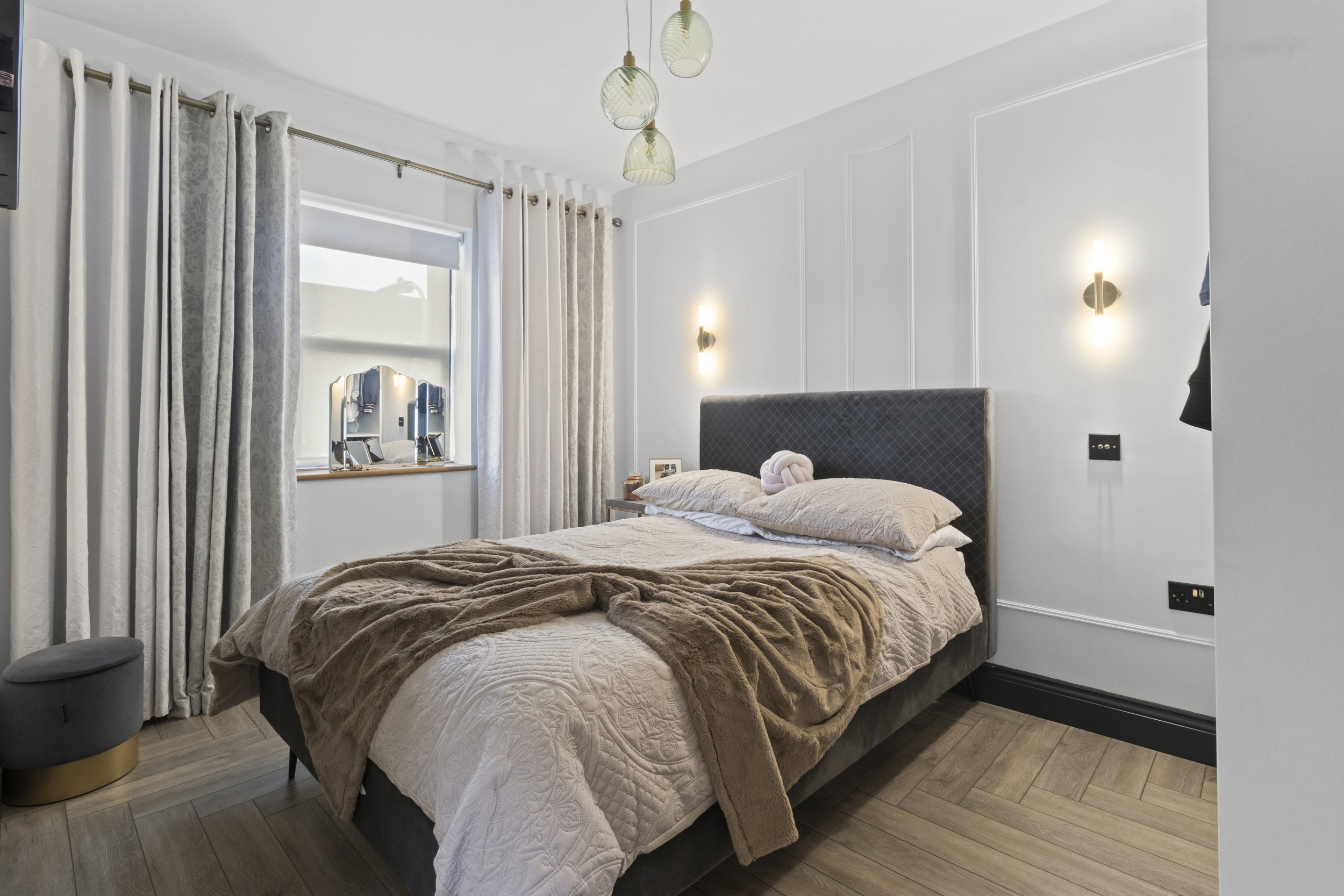 The principal bedroom benefits from a contemporary ensuite shower room, elegantly designed with high-quality fittings and finishes. The family bathroom mirrors this standard, offering a beautifully appointed three-piece suite in a calming, modern design.