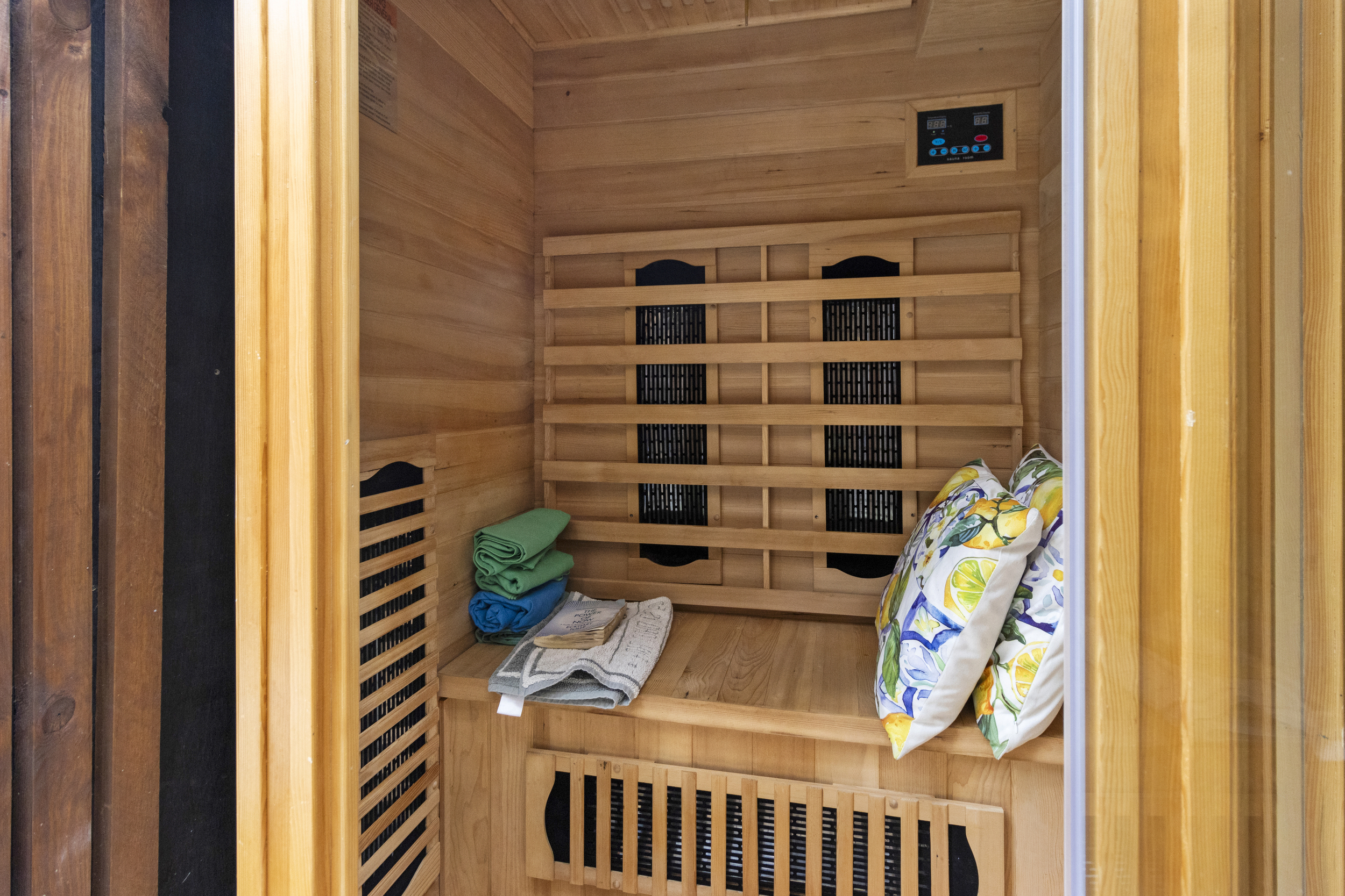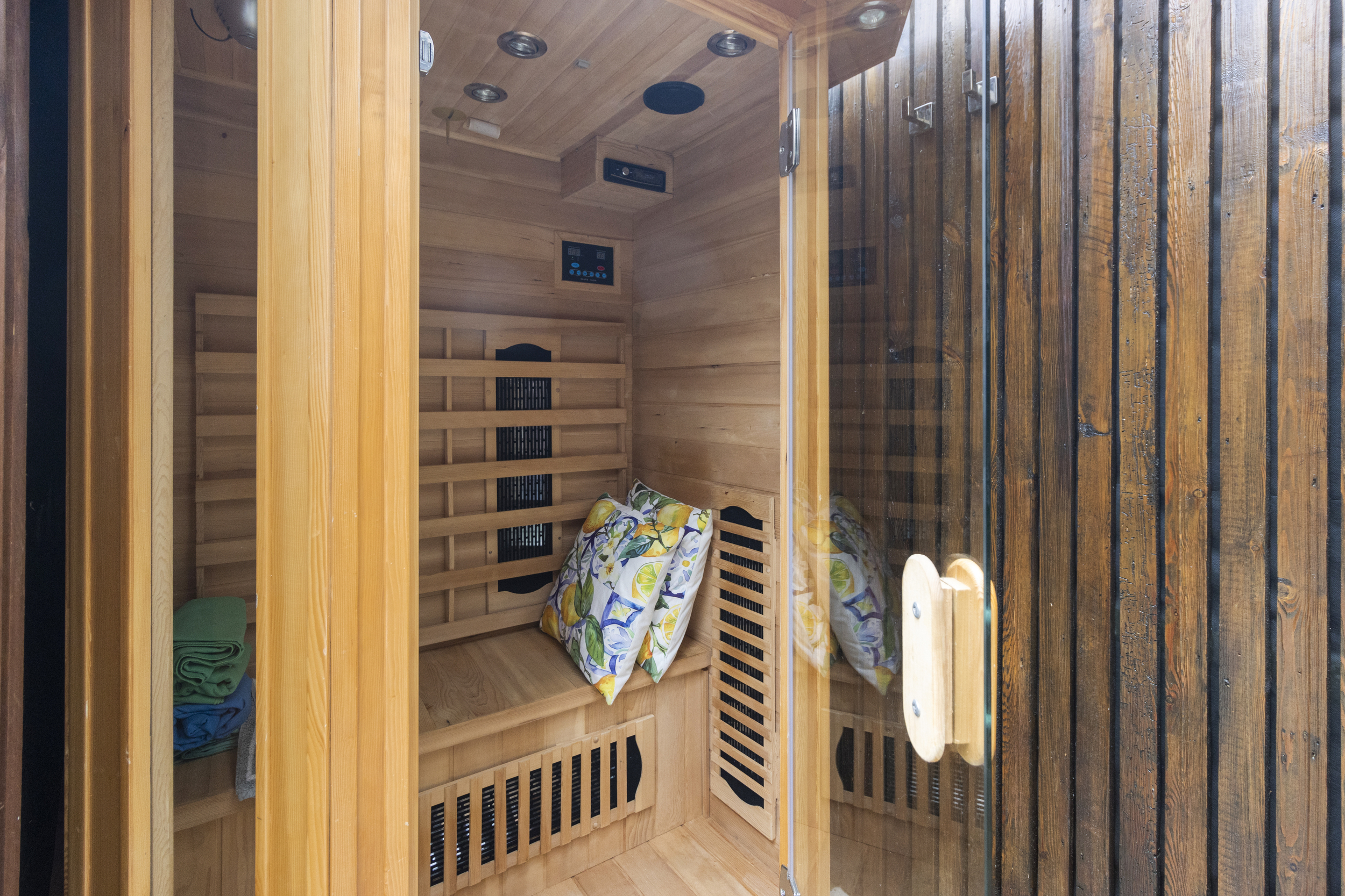 An outdoor kitchen with built-in work surfaces is perfect for al fresco dining and summer entertaining. Beyond, the space offers a sauna and outdoor shower, creating a spa-like ambiance that invites relaxation year-round. The remainder of the garden is designed for minimal upkeep while still offering a sense of greenery and privacy — ideal for modern living.
