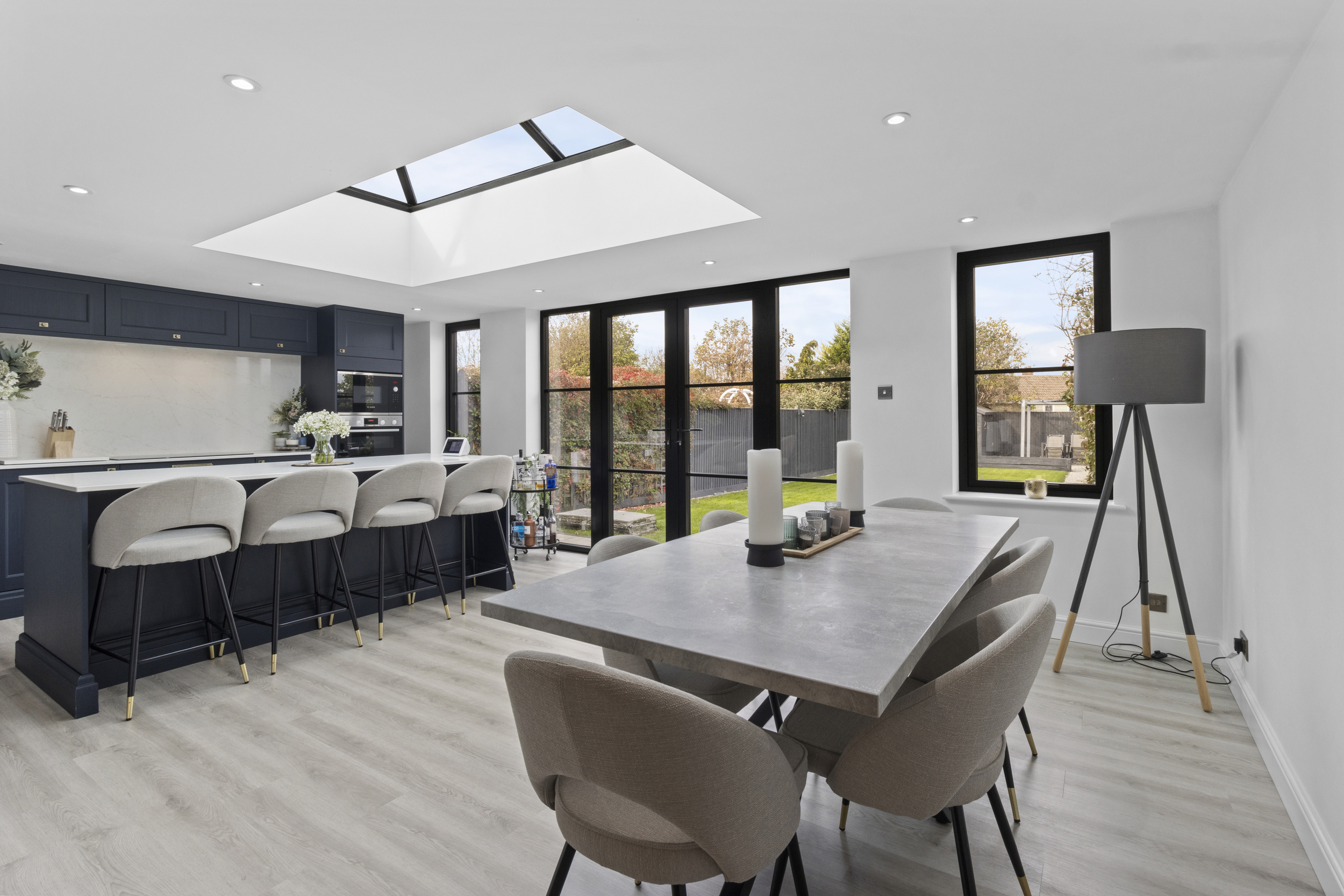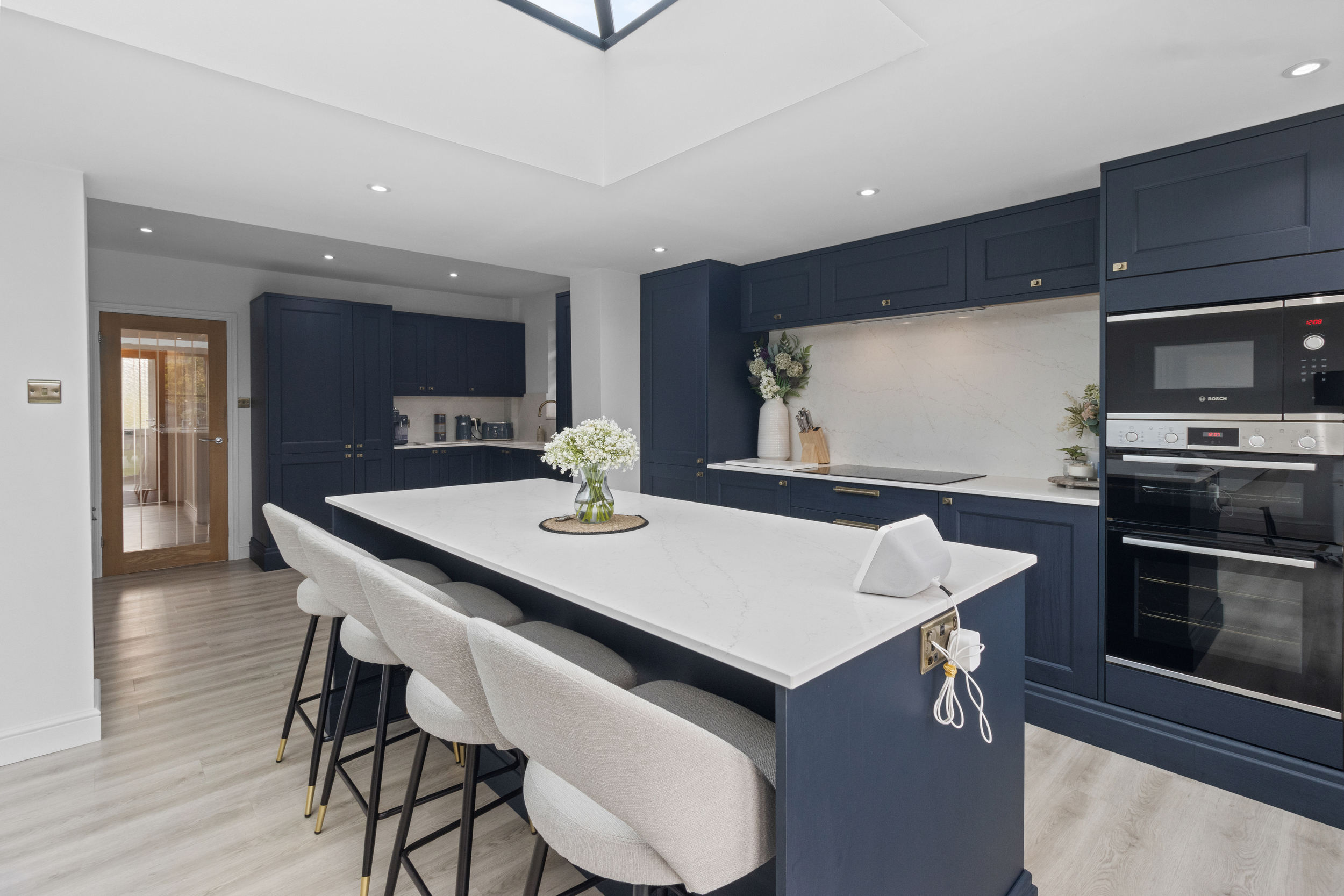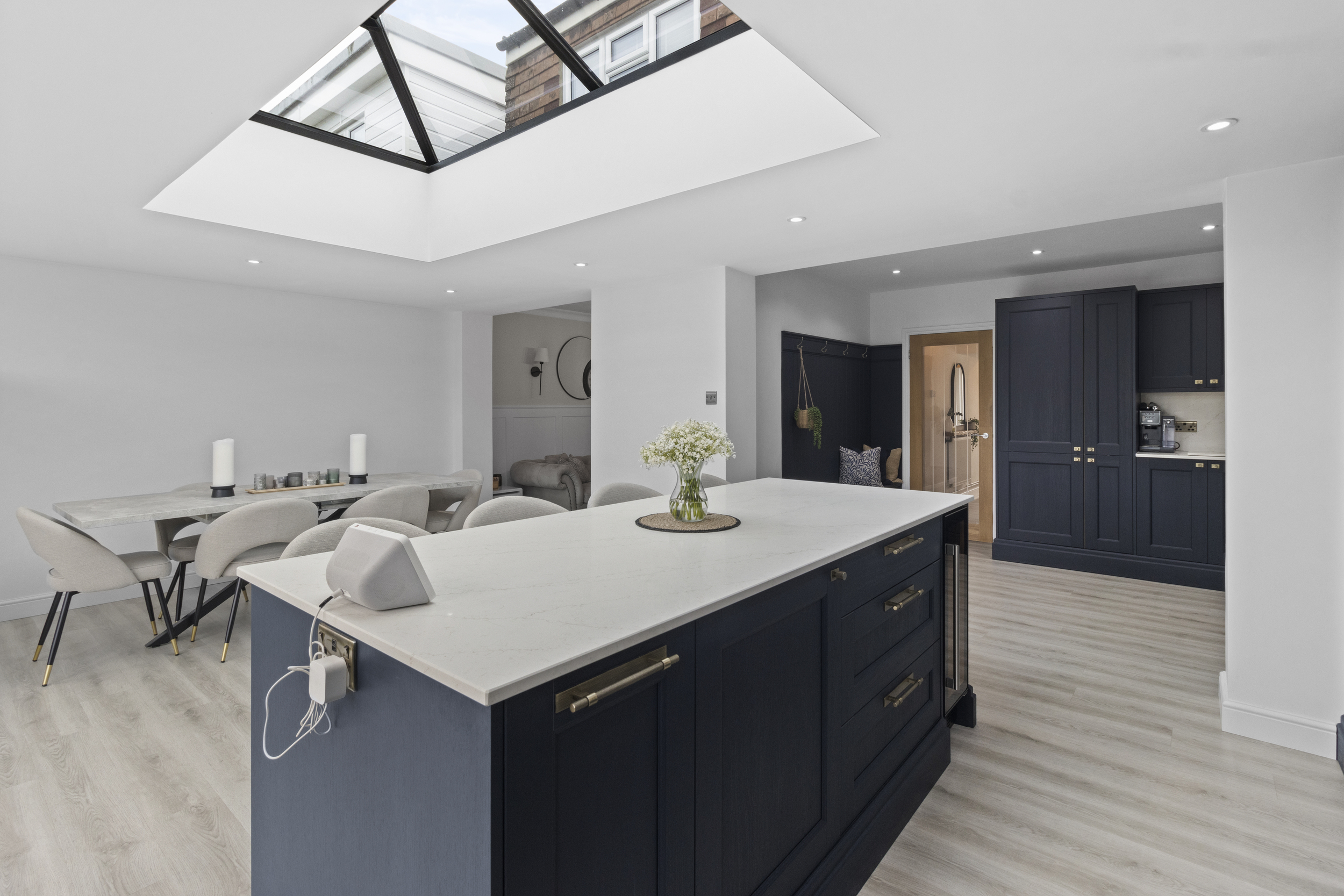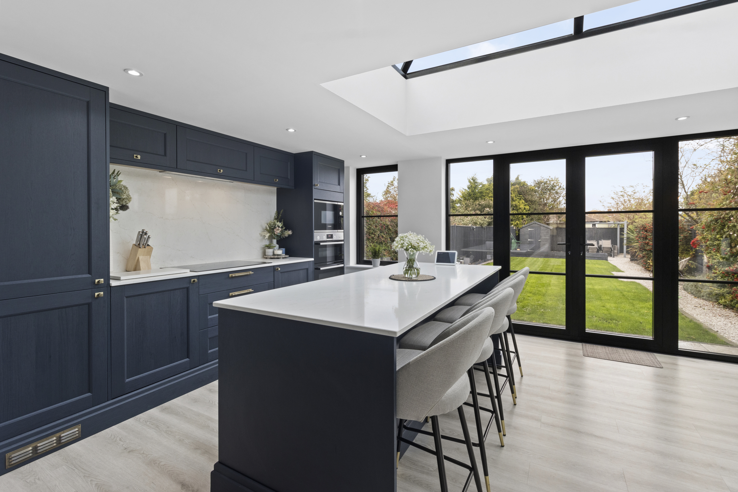 At the centre sits a contemporary island and breakfast bar, perfect for casual dining or socialising, while there remains generous space for a large dining table, ideal for entertaining or family gatherings.