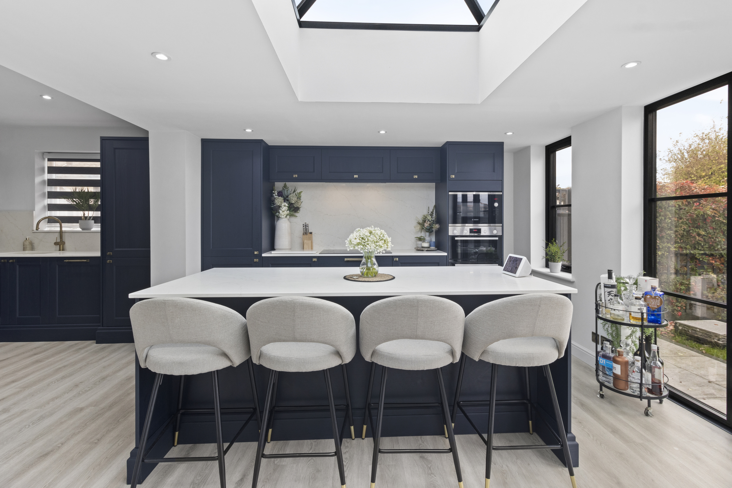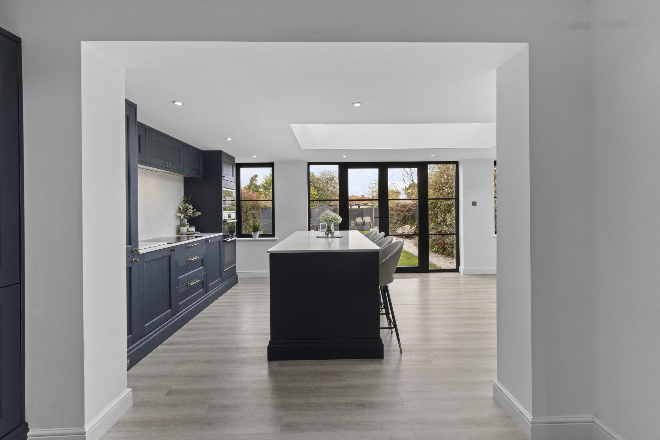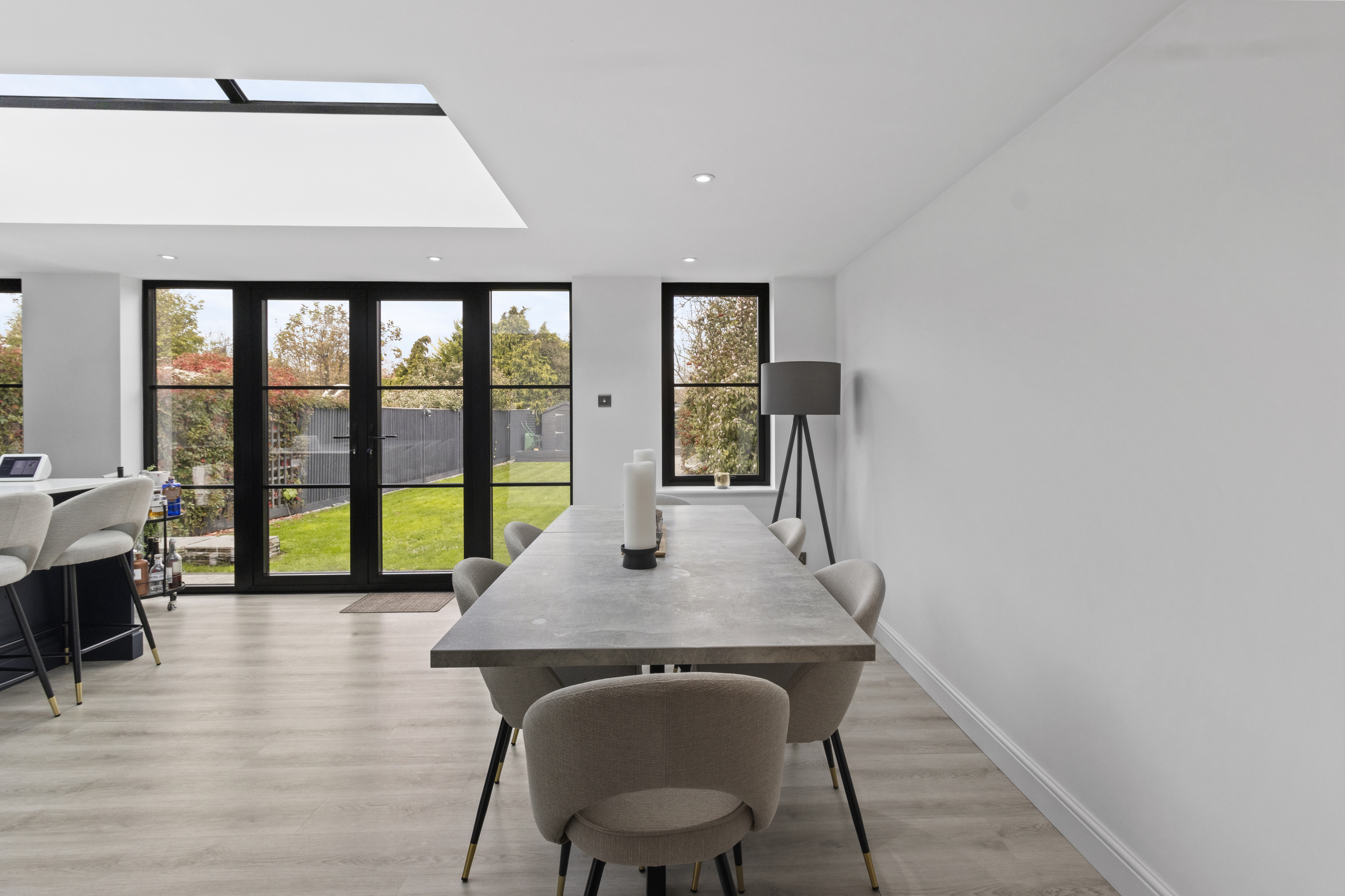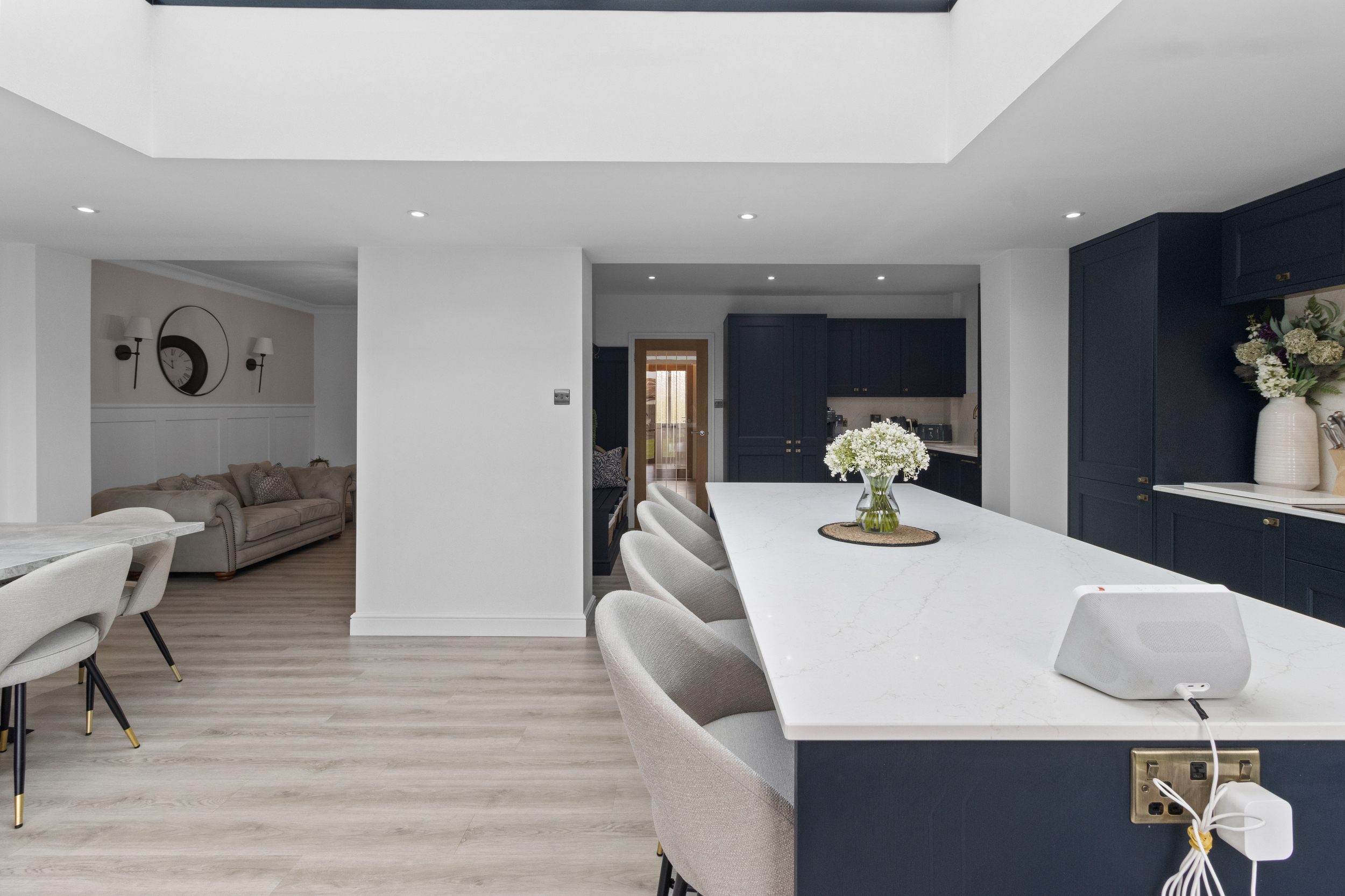 At the centre sits a contemporary island and breakfast bar, perfect for casual dining or socialising, while there remains generous space for a large dining table, ideal for entertaining or family gatherings.