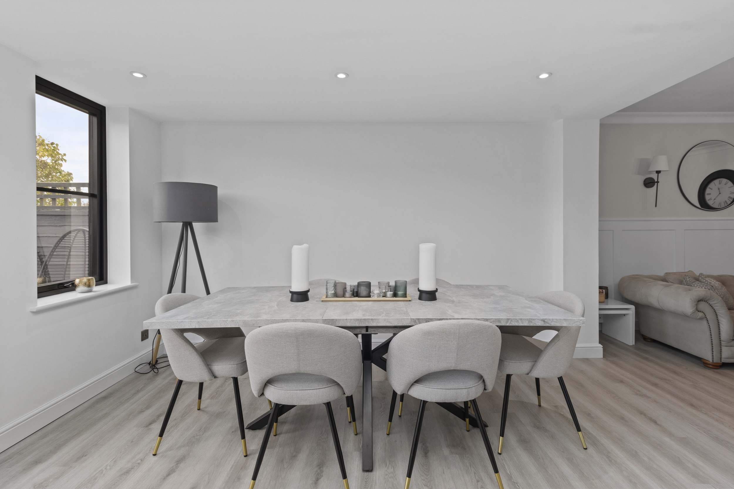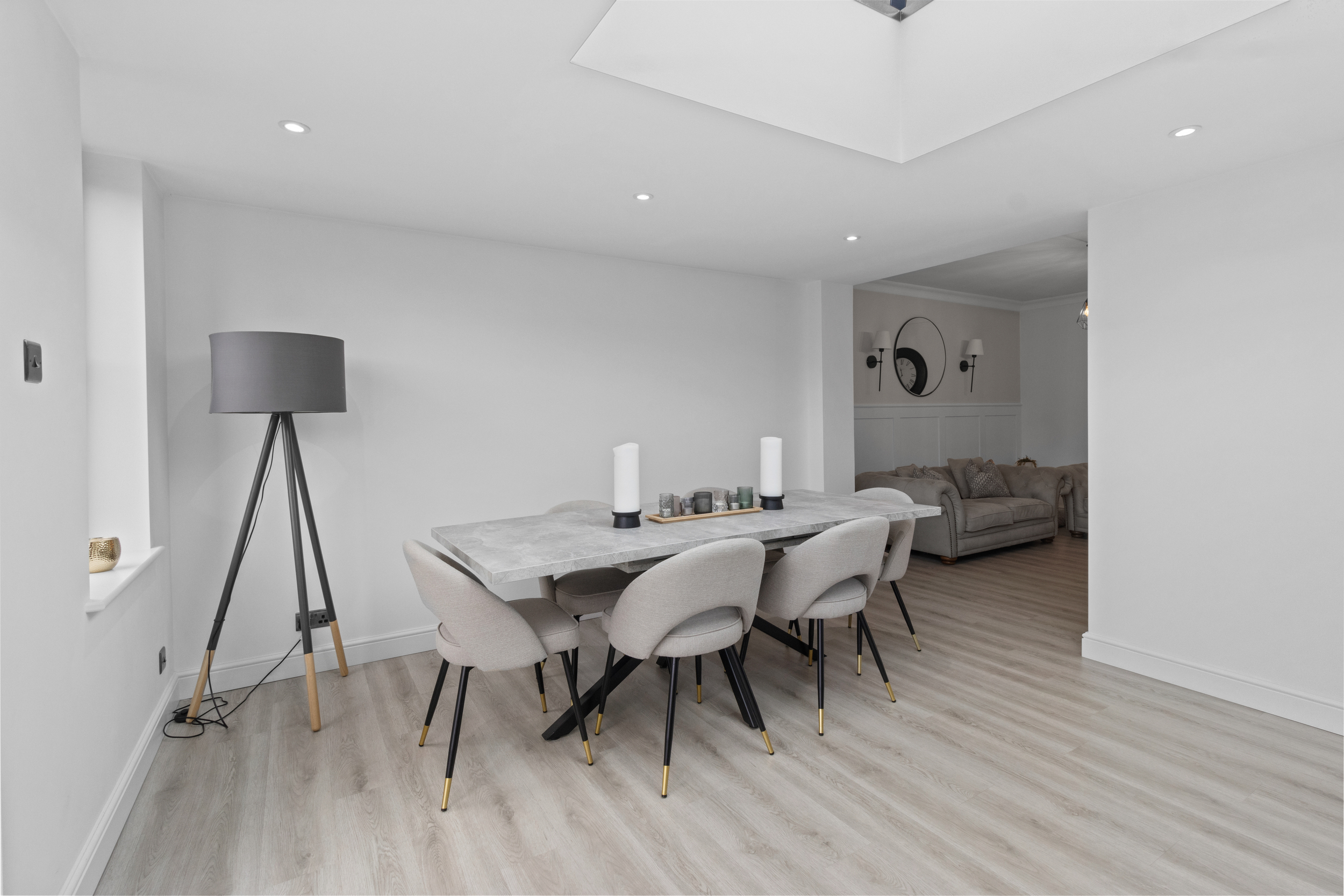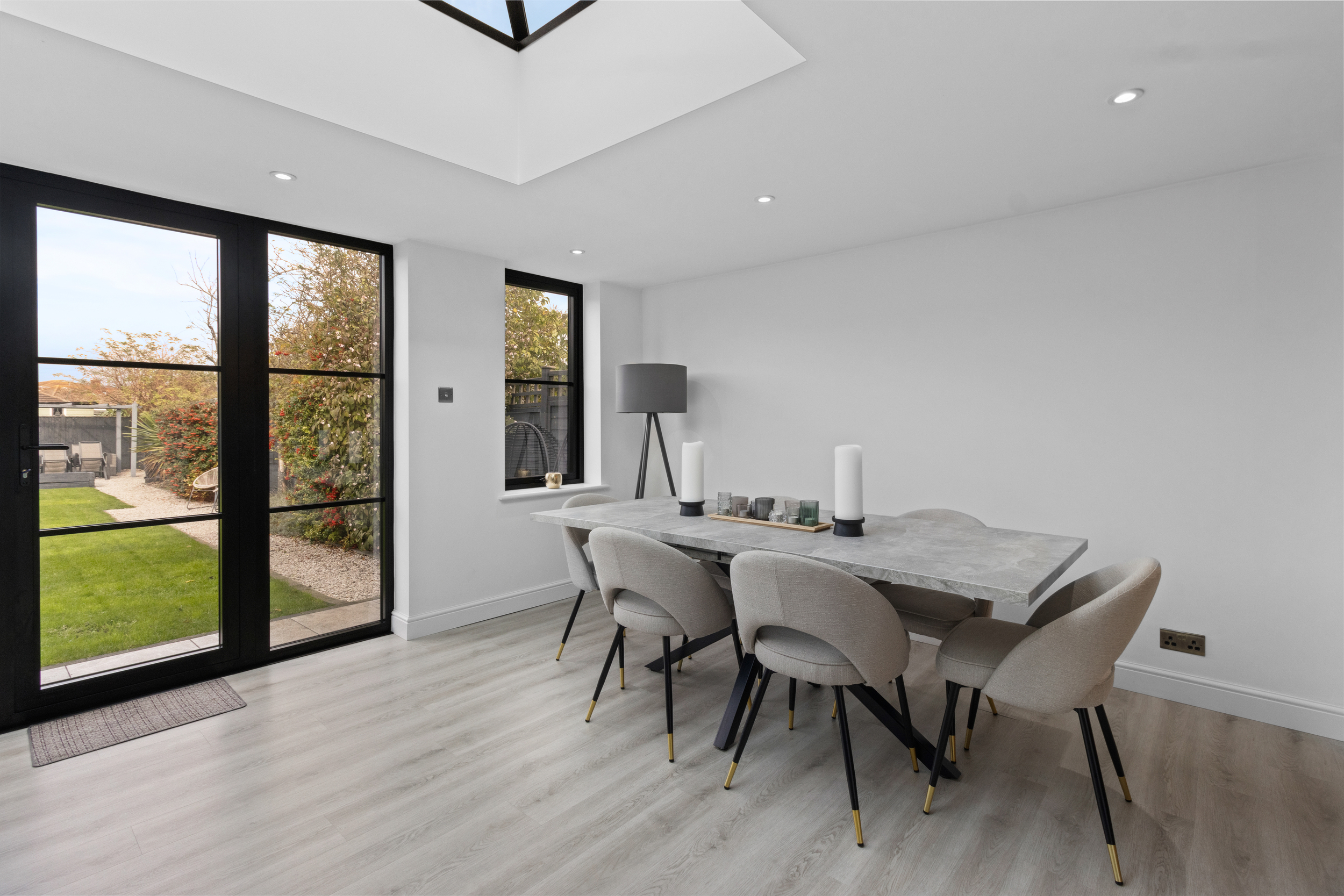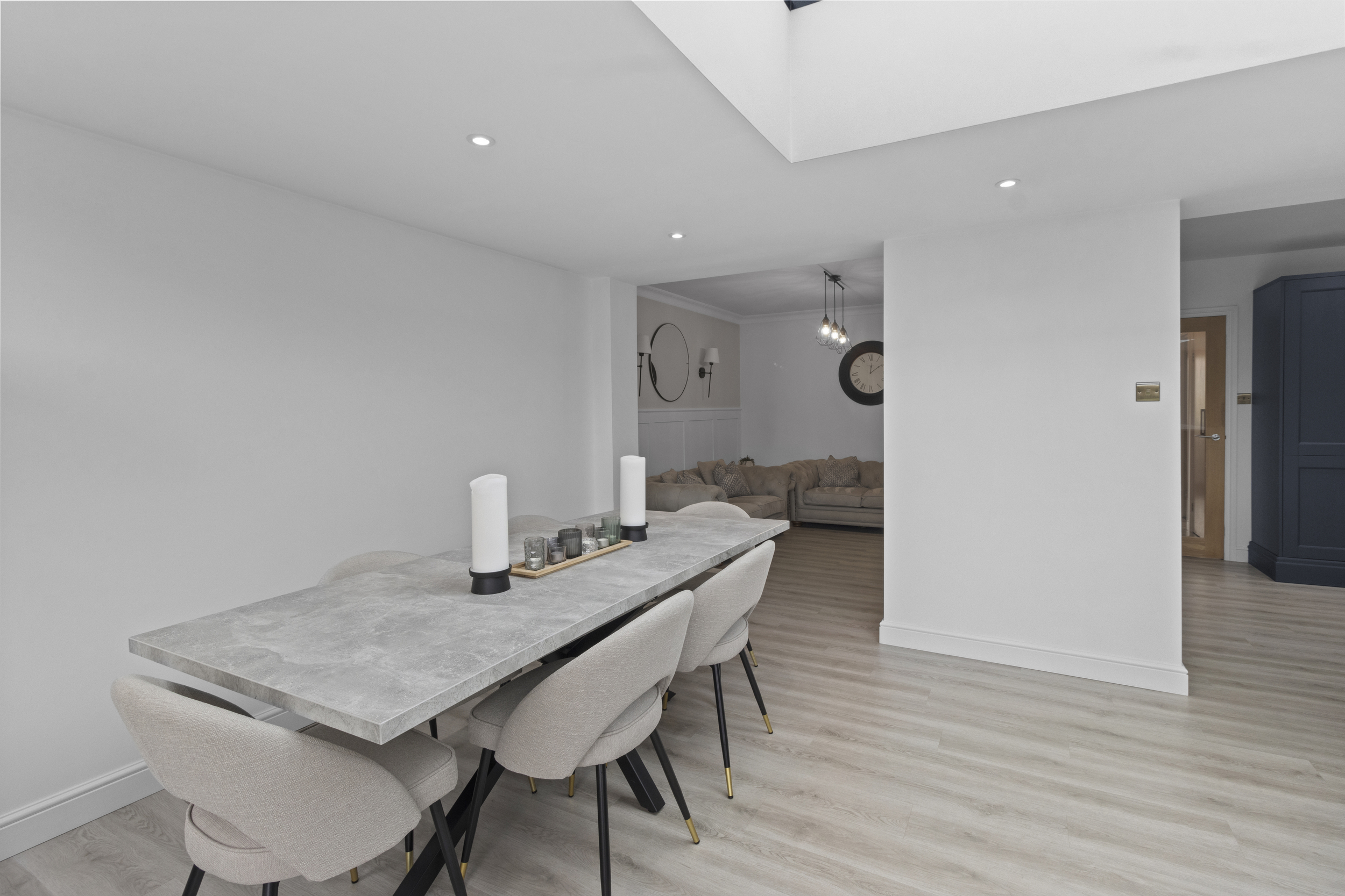 At the centre sits a contemporary island and breakfast bar, perfect for casual dining or socialising, while there remains generous space for a large dining table, ideal for entertaining or family gatherings.