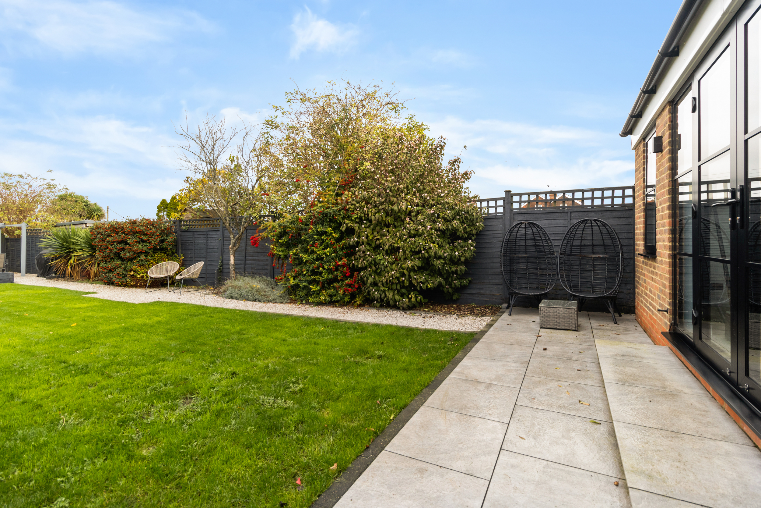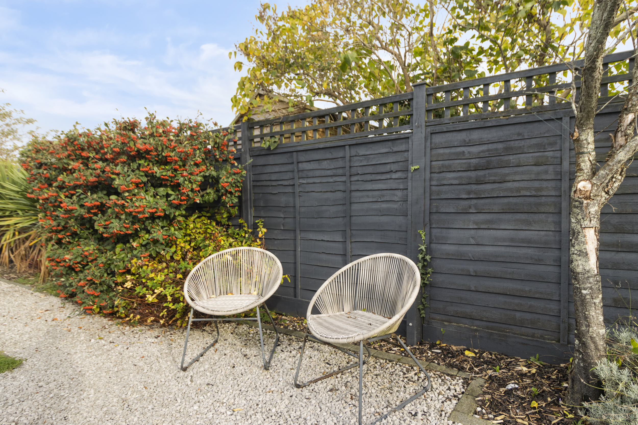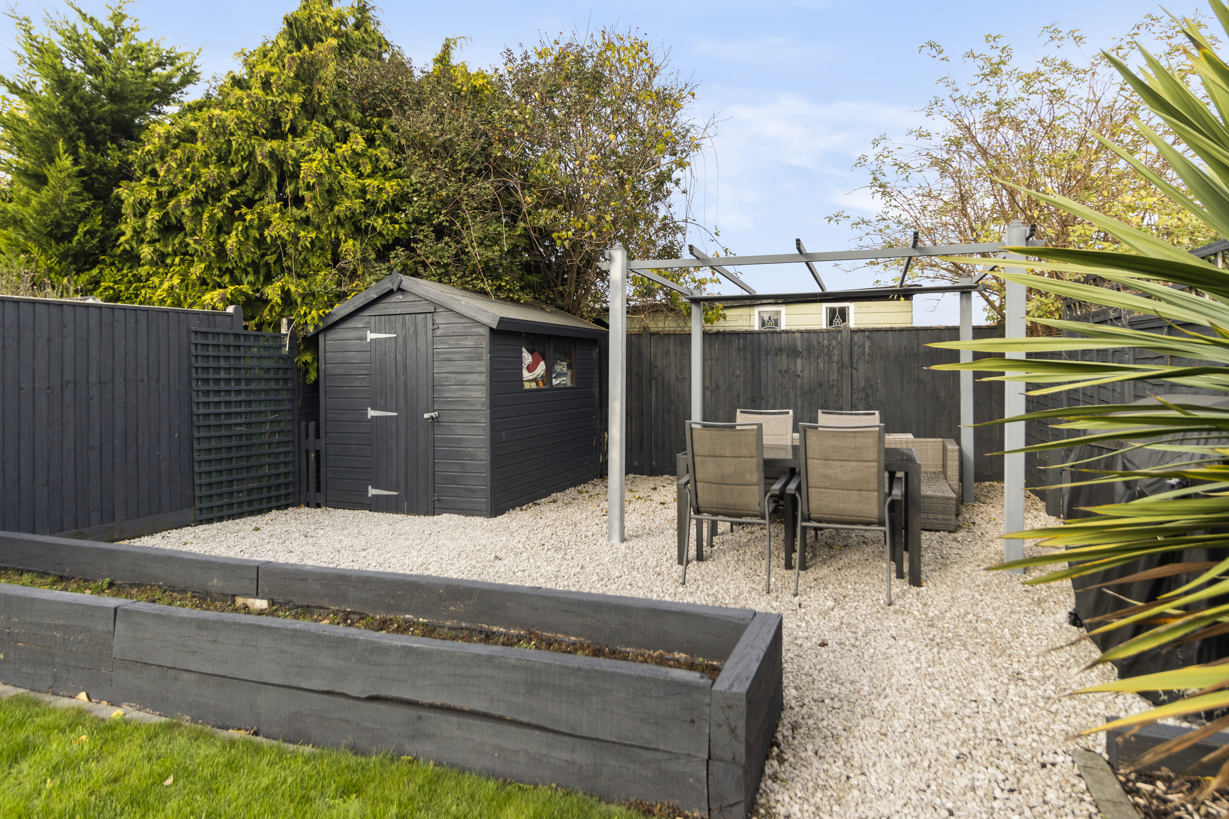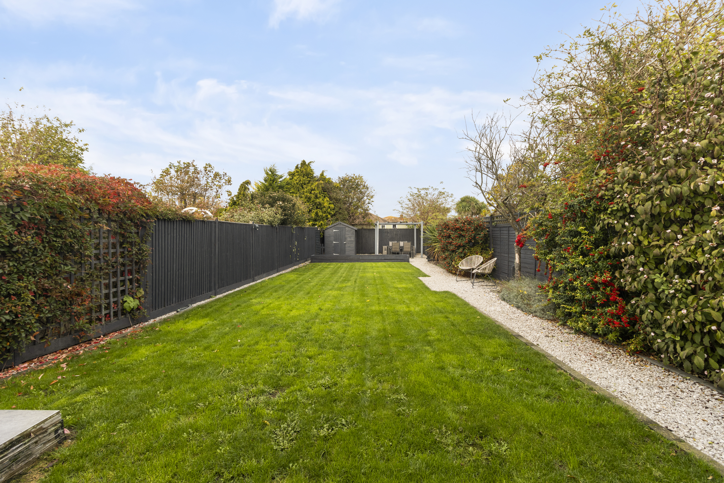 A paved patio area adjoins the property, offering an excellent space for outdoor dining and entertaining. Beyond lies a well-tended lawn, framed by mature planting and enclosed fencing providing privacy. A gravelled pathway leads to an additional seating area — a perfect spot for enjoying a morning coffee or evening glass of wine — and a wooden potting shed offers practical storage for gardening tools and outdoor equipment.