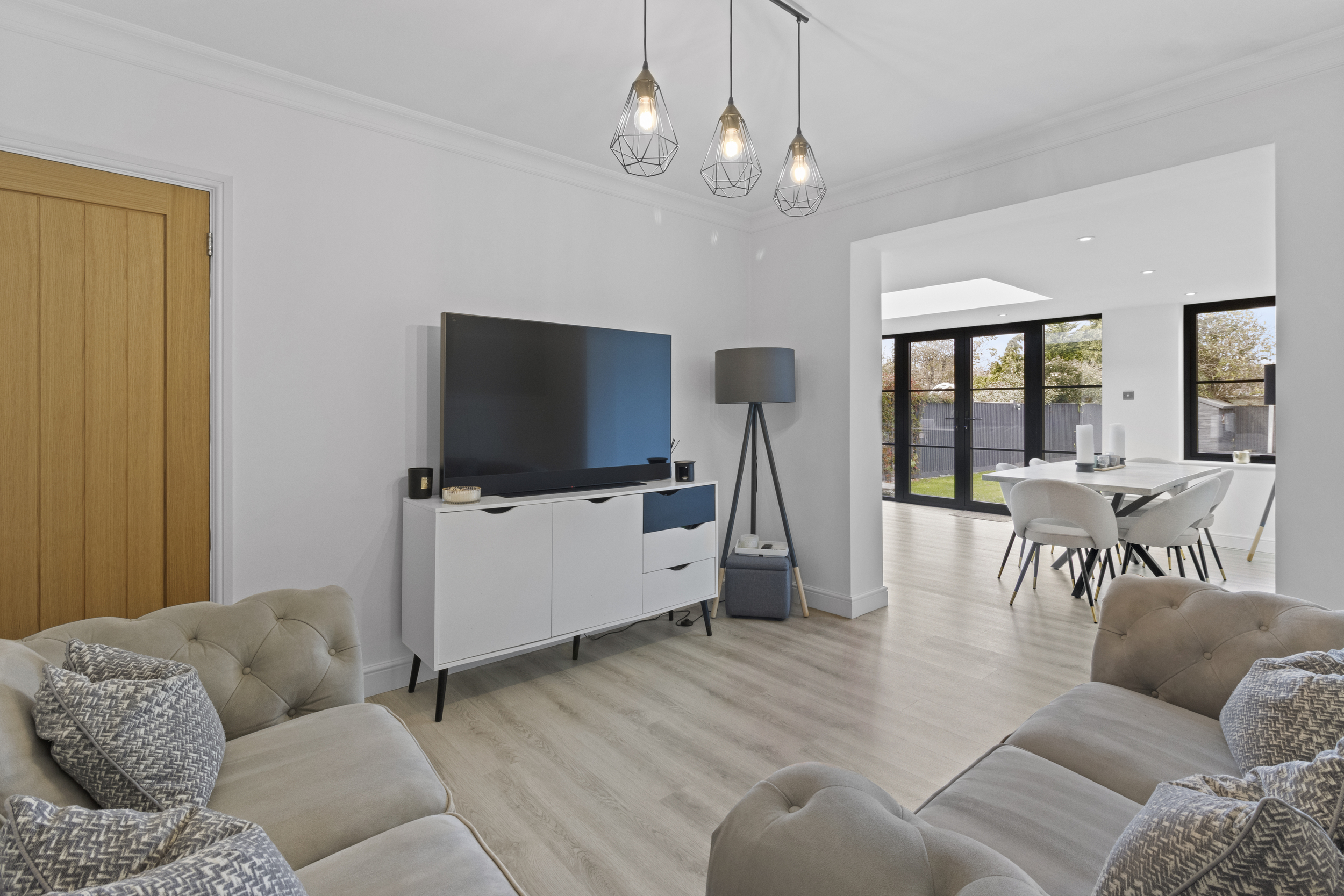 To the rear of the home lies its undisputed heart: a spectacular open-plan kitchen and dining room that exemplifies modern family living. This impressive space has been expertly extended to create a versatile and sociable area that flows beautifully to the rear garden through wide windows and glazed doors, bringing the outside in.