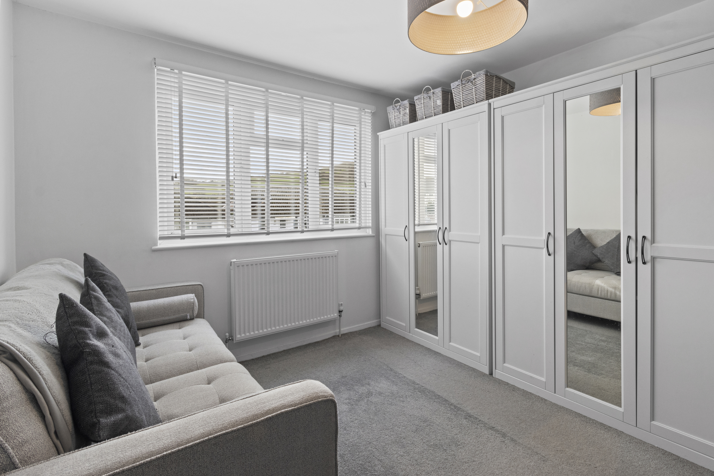 The upper floor offers two well-proportioned double bedrooms, both with built-in wardrobes providing ample storage, and both enjoying elevated views — with glimpses toward the South Downs.