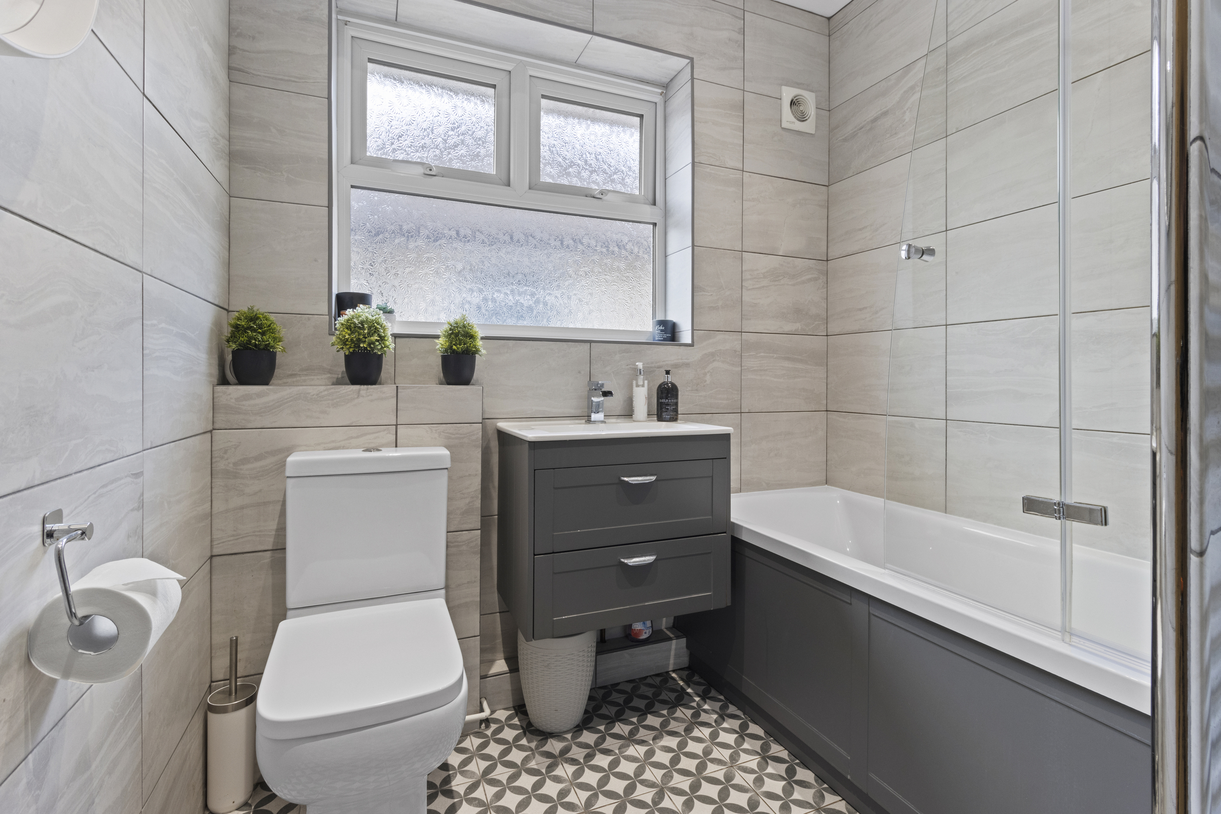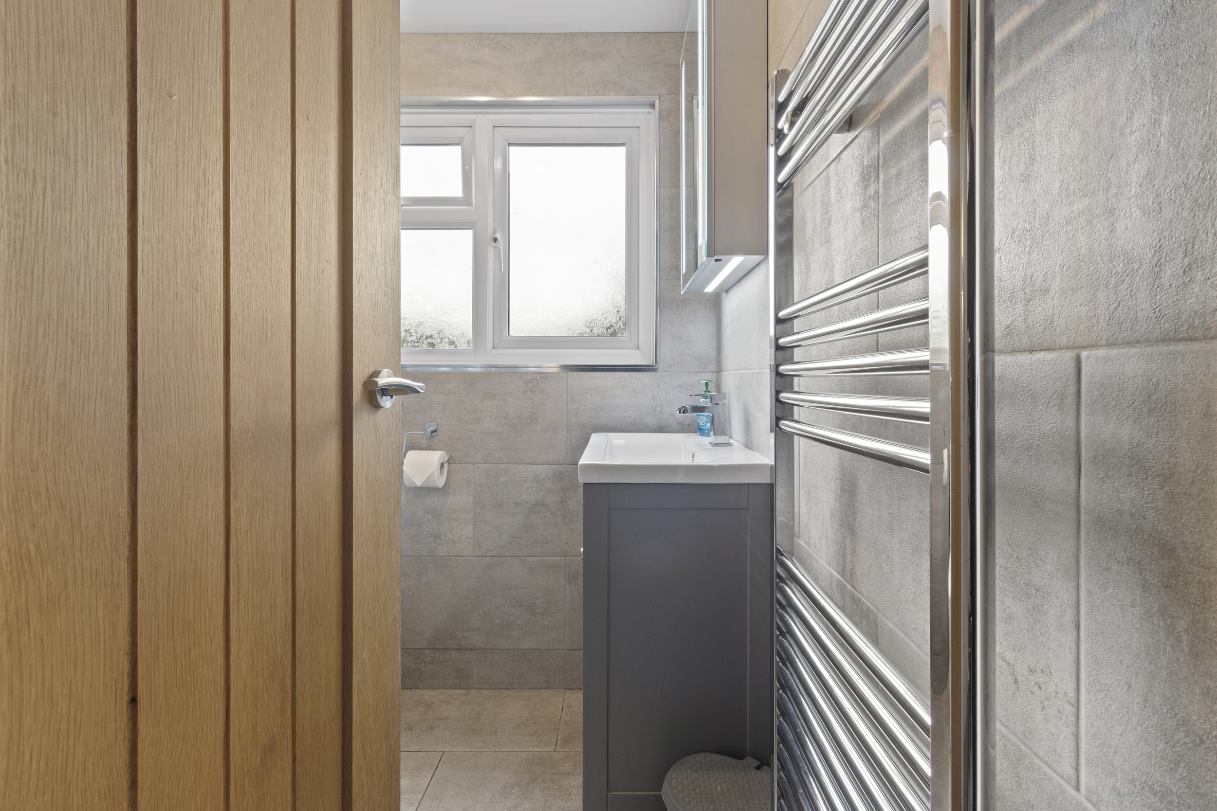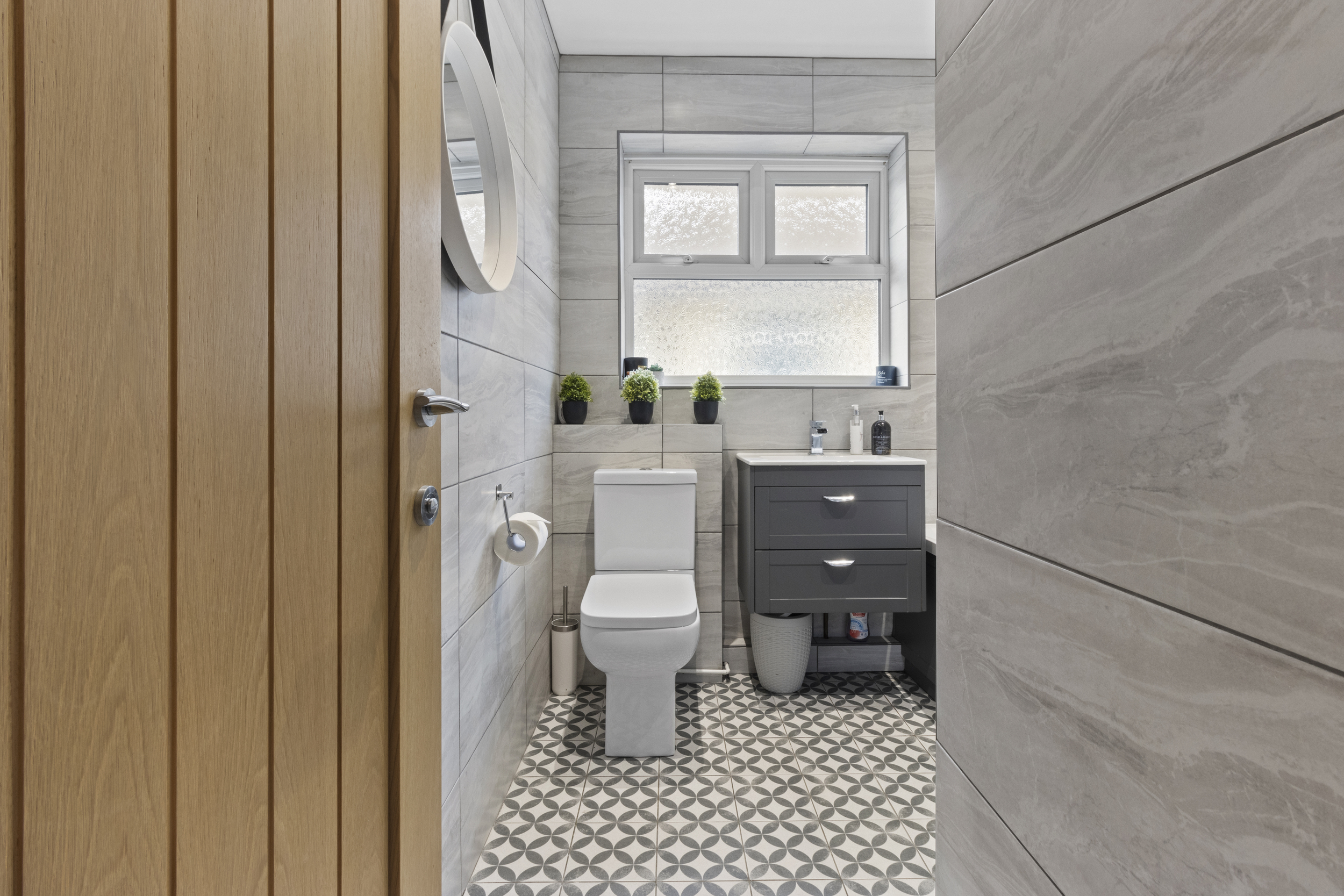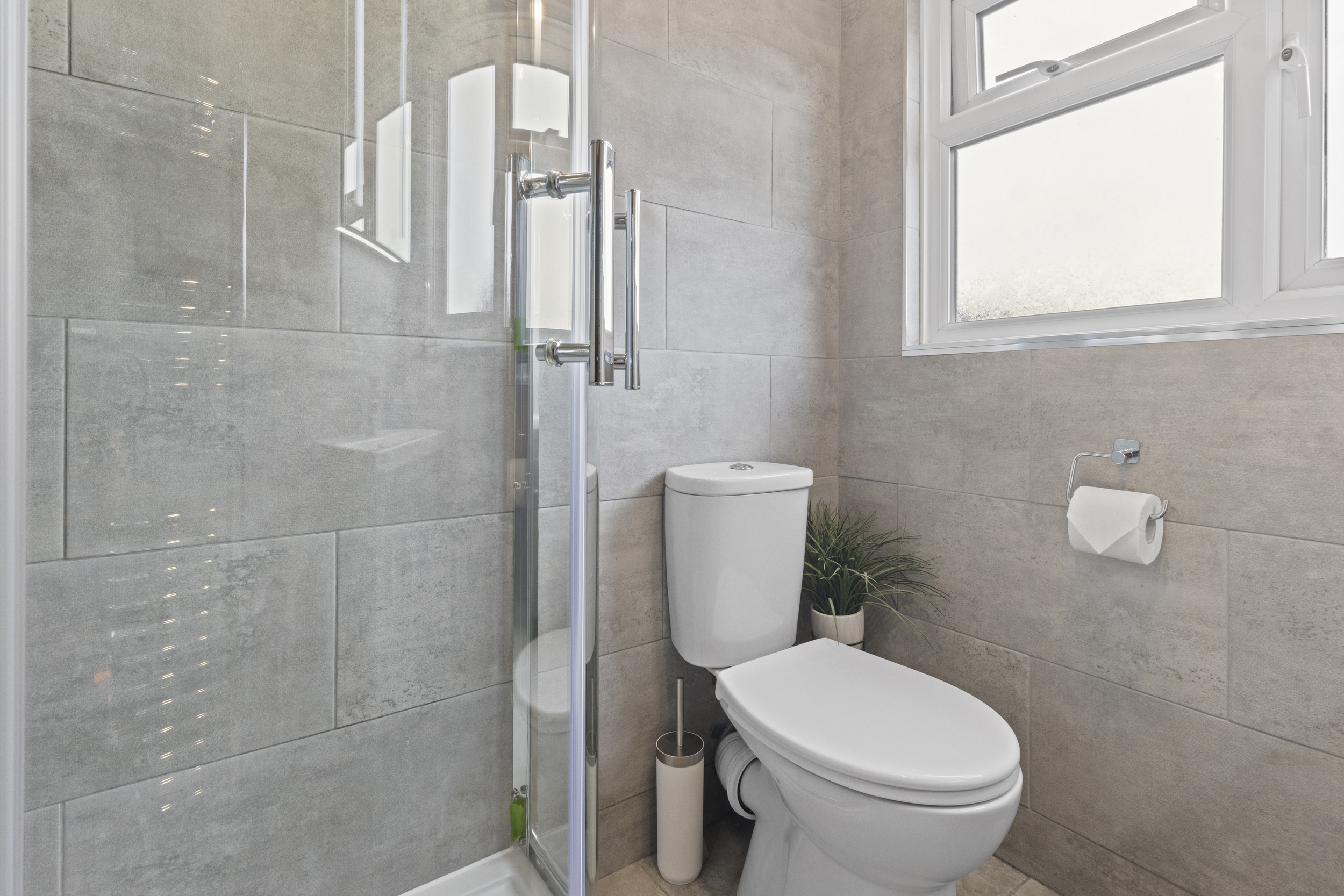 A sleek and contemporary shower room serves this floor, fitted with a corner shower cubicle, close-coupled WC, and wash hand basin, all beautifully presented with modern tiling and finishes.
