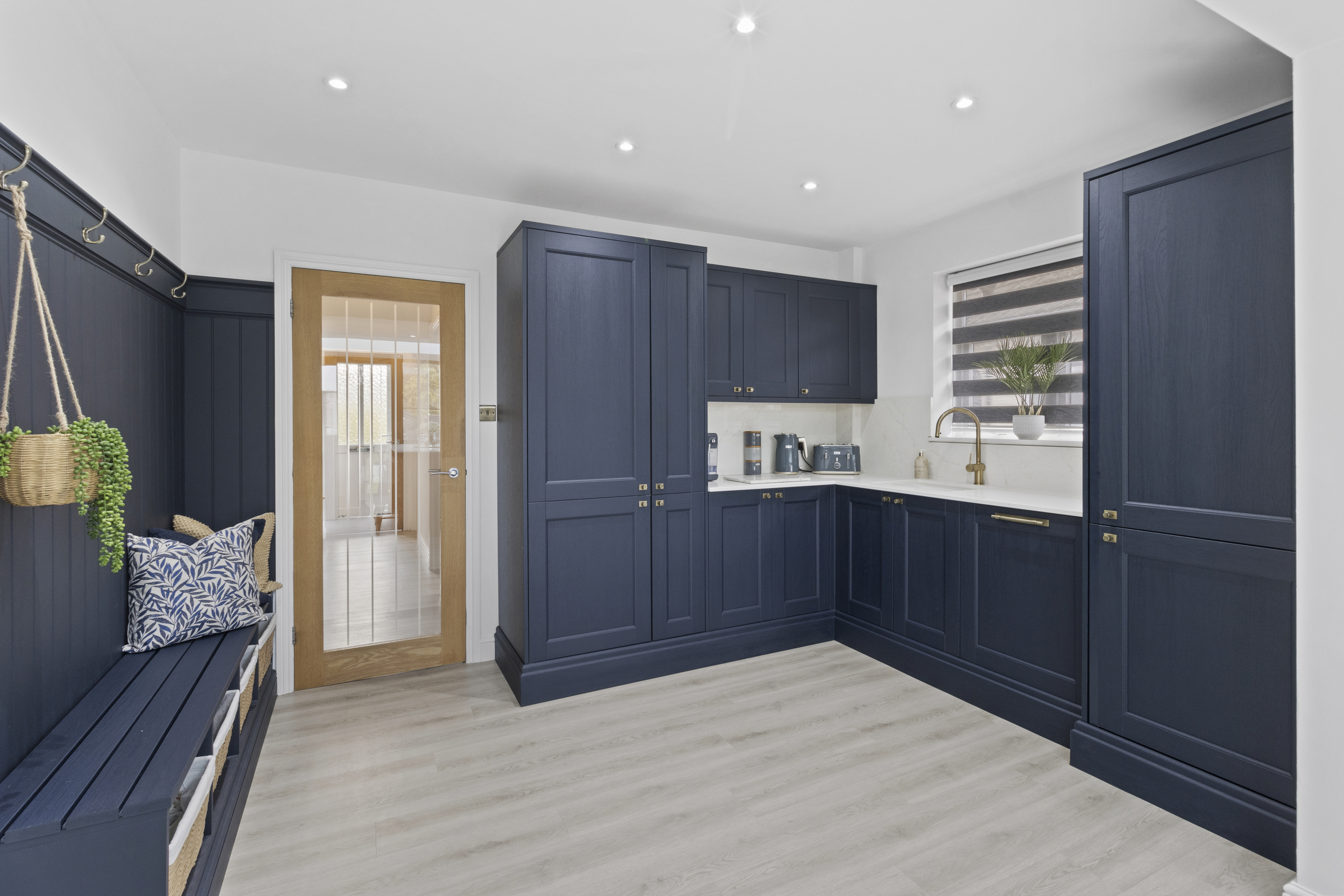 The bespoke fitted kitchen combines function and style with an extensive range of wall-mounted and base units, complemented by elegant work surfaces and high-end integrated appliances, including a Bosch five-ring hob, oven, grill, microwave, fridge, freezer, dishwasher, and wine cooler. Clever design touches such as a slide-out bin cupboard and utility storage add everyday convenience.