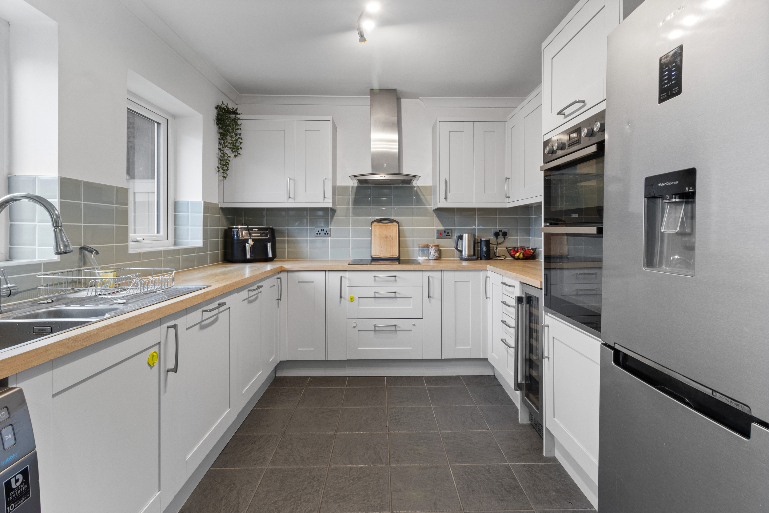 To the rear of the property is the modern kitchen/dining room, a well-designed and highly functional space ideal for both everyday living and entertaining. The kitchen is fitted with an extensive range of contemporary wall-mounted and matching base units, complemented by generous work surfaces. Integrated appliances include a built-in double oven, hob with extractor hood, dishwasher and wine cooler, while thoughtful additions such as pull-out bins enhance practicality. There is further space for a freestanding washing machine and fridge freezer. The dining area comfortably accommodates a family-sized dining table and benefits from a built-in under-stairs storage cupboard, maximising storage. Double-glazed double doors open directly onto the rear garden, creating a seamless indoor-outdoor flow.
