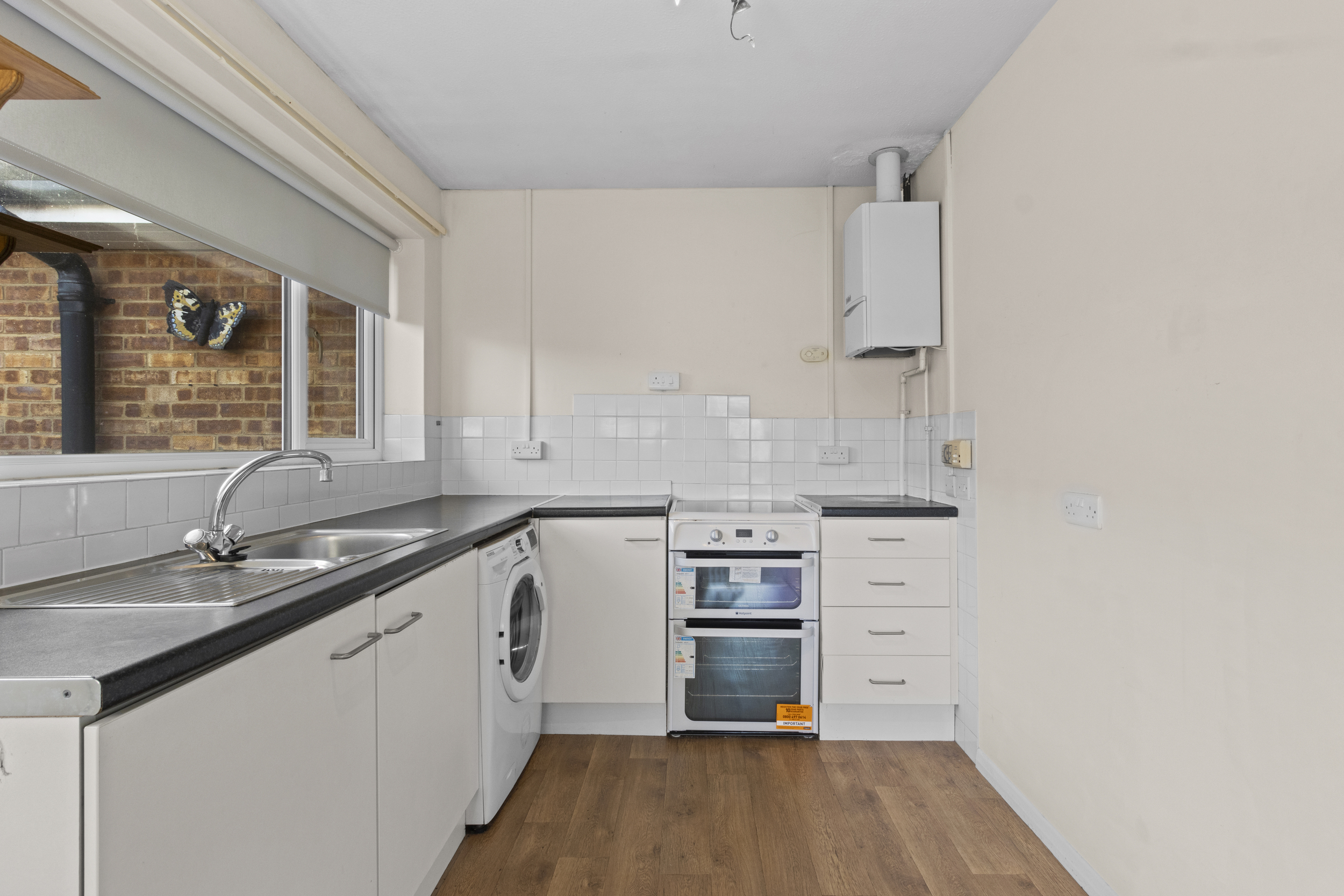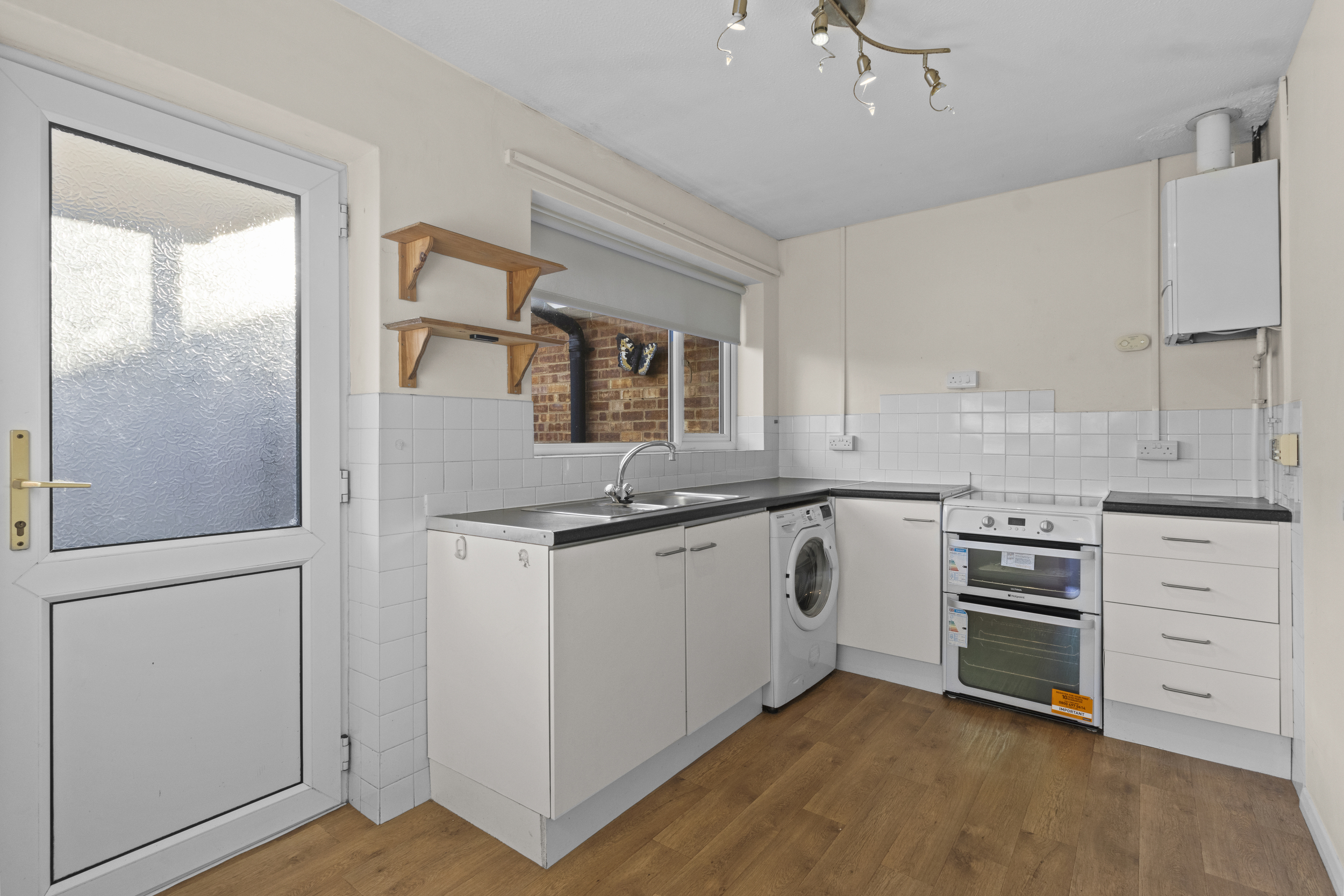 The kitchen is clean and functional, although it would benefit from some modernisation, offering buyers the opportunity to update to their own taste. The kitchen is fitted with a range of base units with work surfaces over and includes a washing machine, cooker, and space for a fridge freezer. A side door provides direct access to the garden, adding to the practicality of the space.
