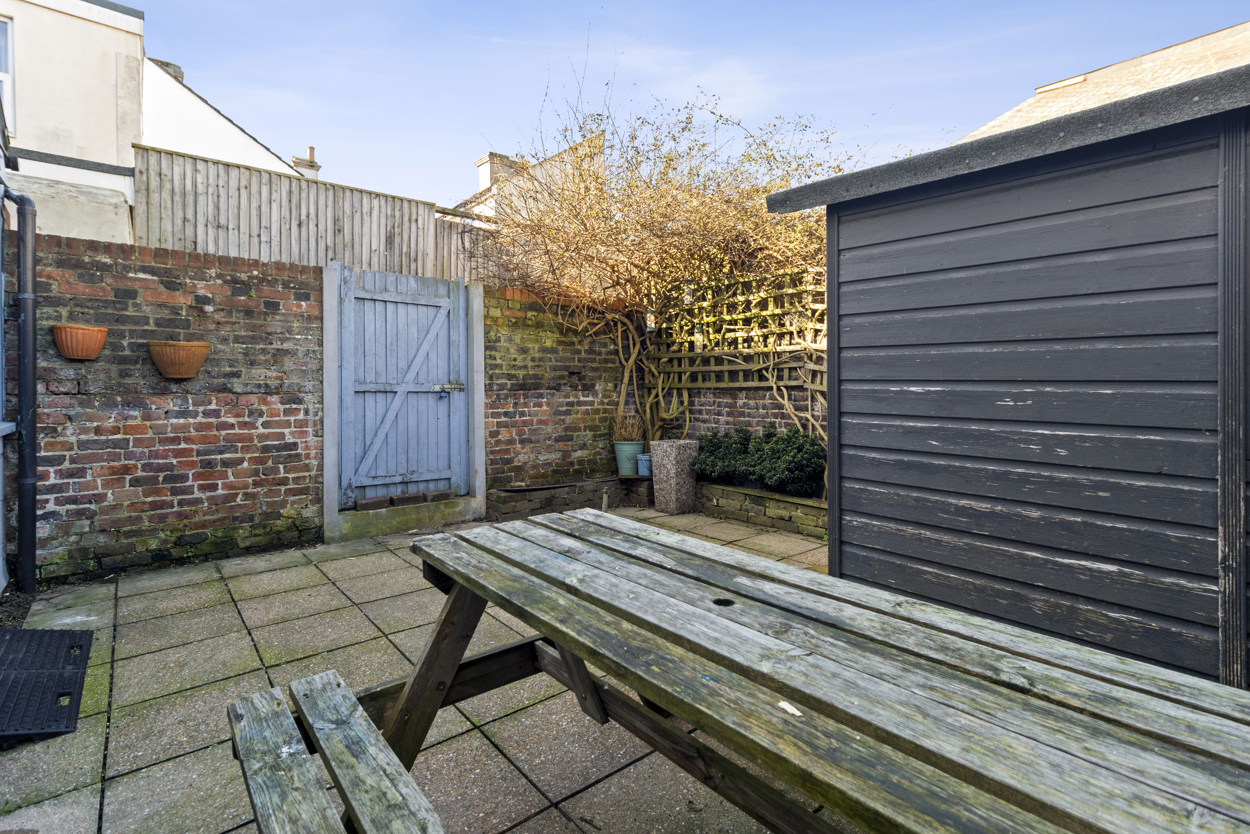 Externally, the rear garden is fully enclosed, offering privacy and low maintenance. It is predominantly laid to patio, ideal for outdoor dining and entertaining, and complemented by raised borders adding greenery and character. There is also a garden potting shed and a side access gate, enhancing practicality.
