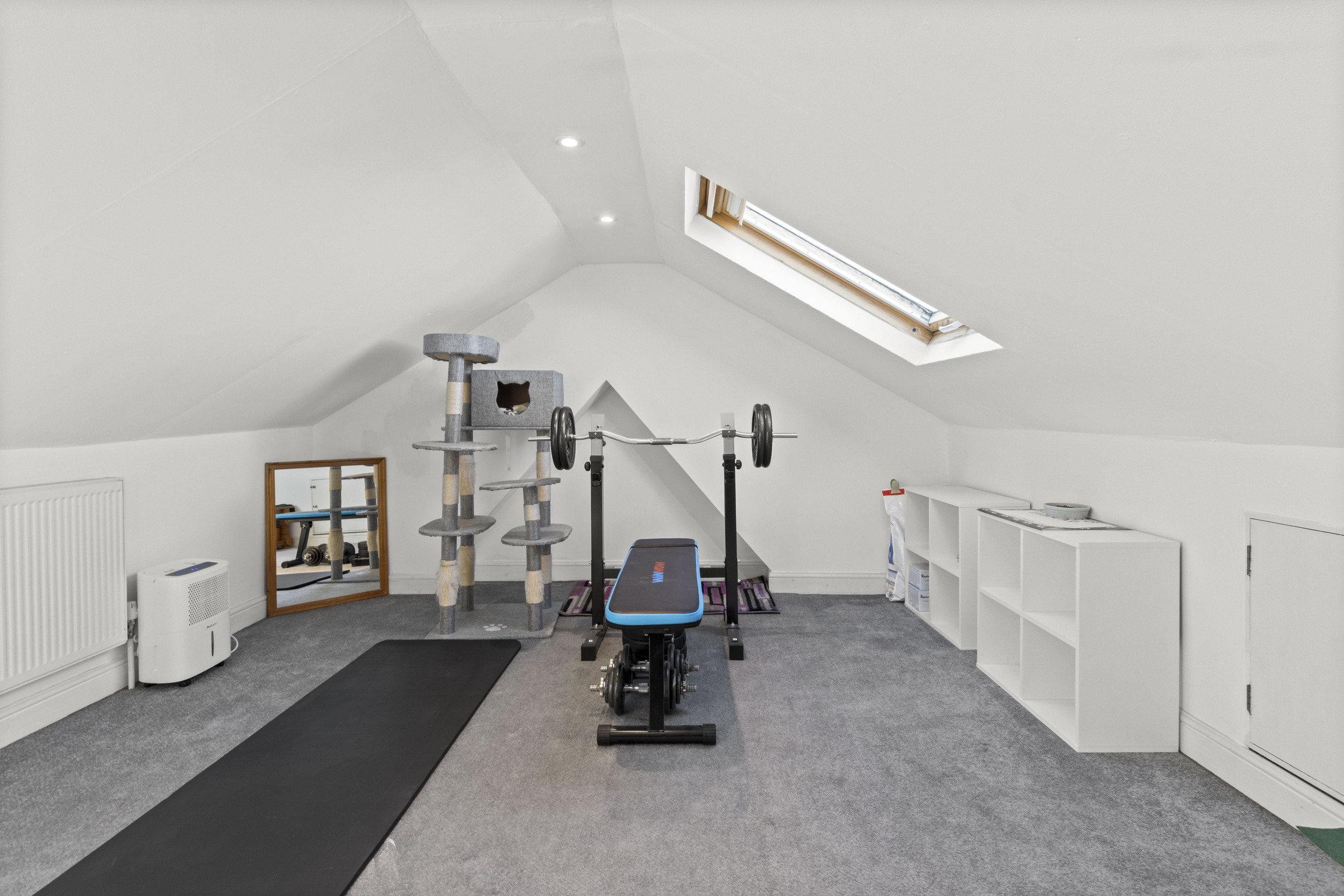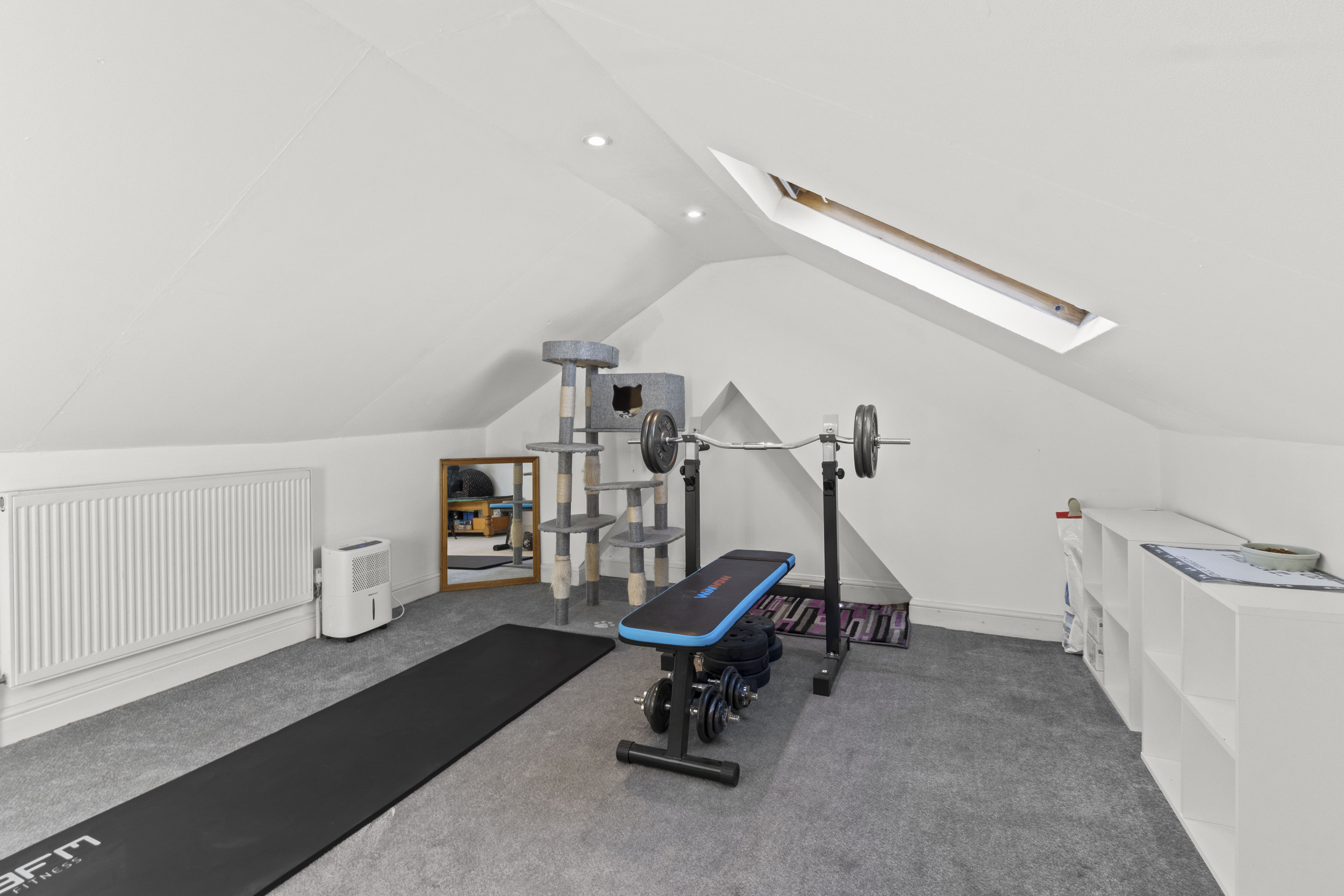Stairs lead to the second floor where the converted loft room provides a versatile and adaptable space. Currently used by the sellers as an occasional bedroom, this bright room benefits from Velux-style windows to both the front and rear aspects, allowing natural light to flood in. This space could serve equally well as a third bedroom (subject to any necessary consents), home office, hobby room or snug, depending on individual requirements.